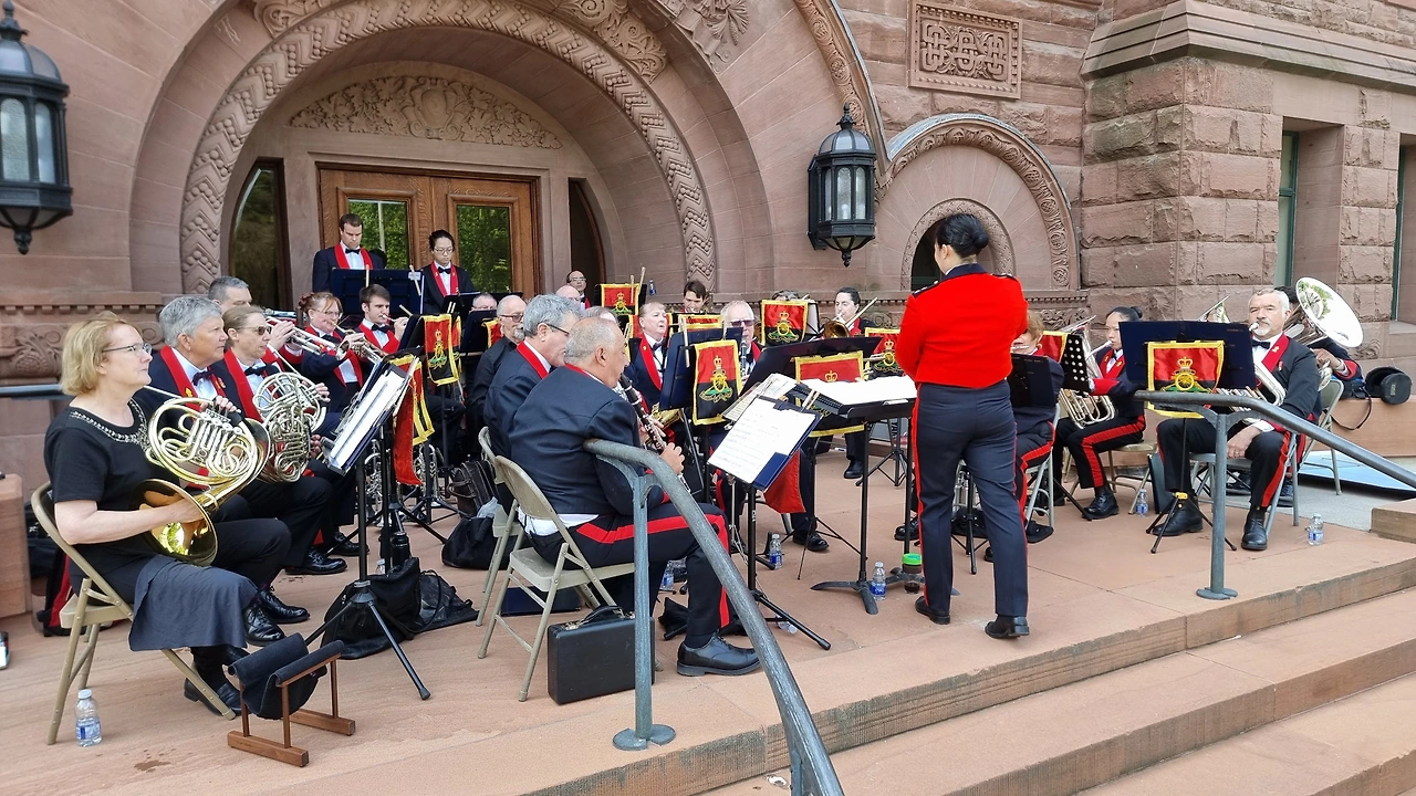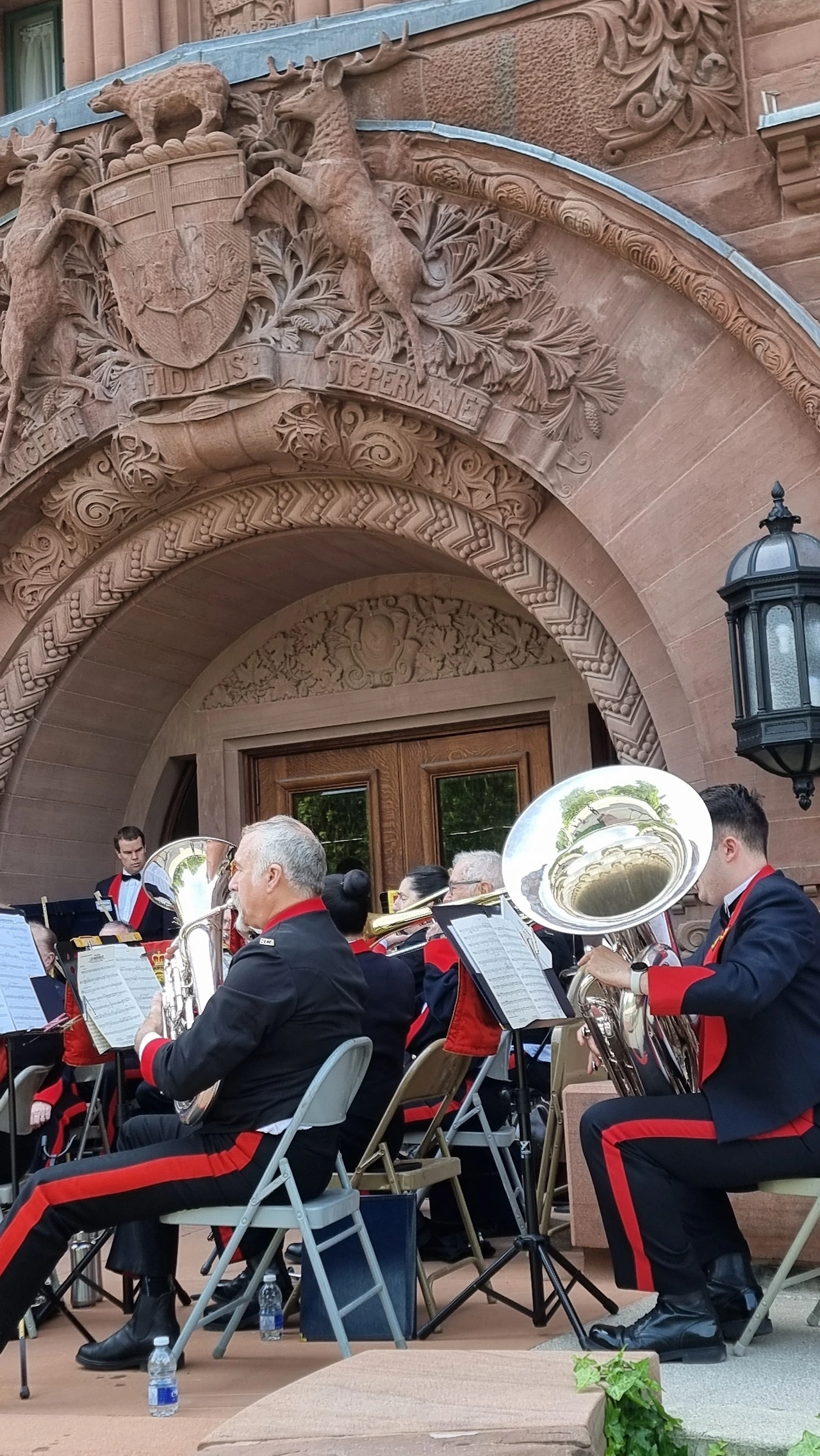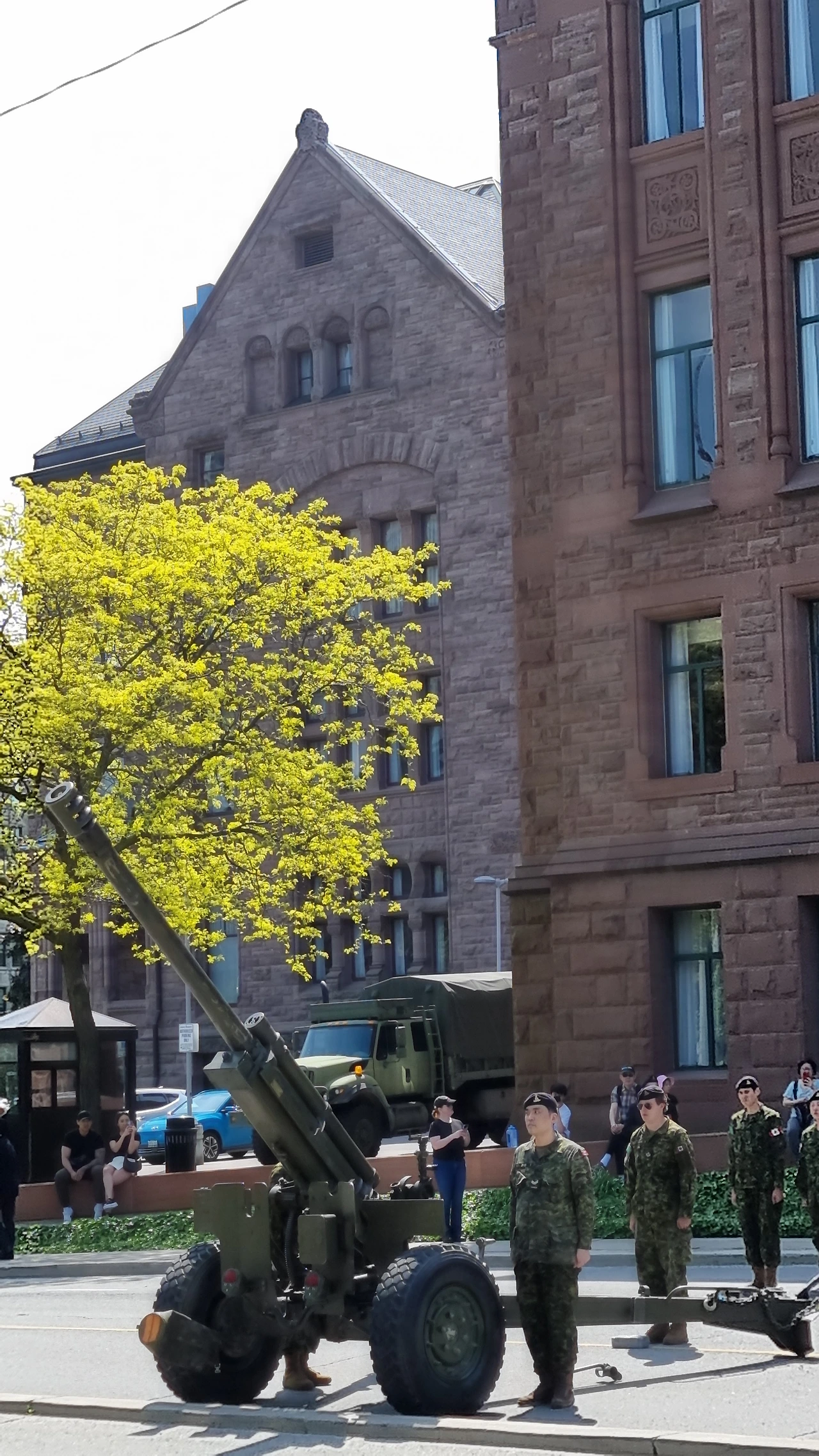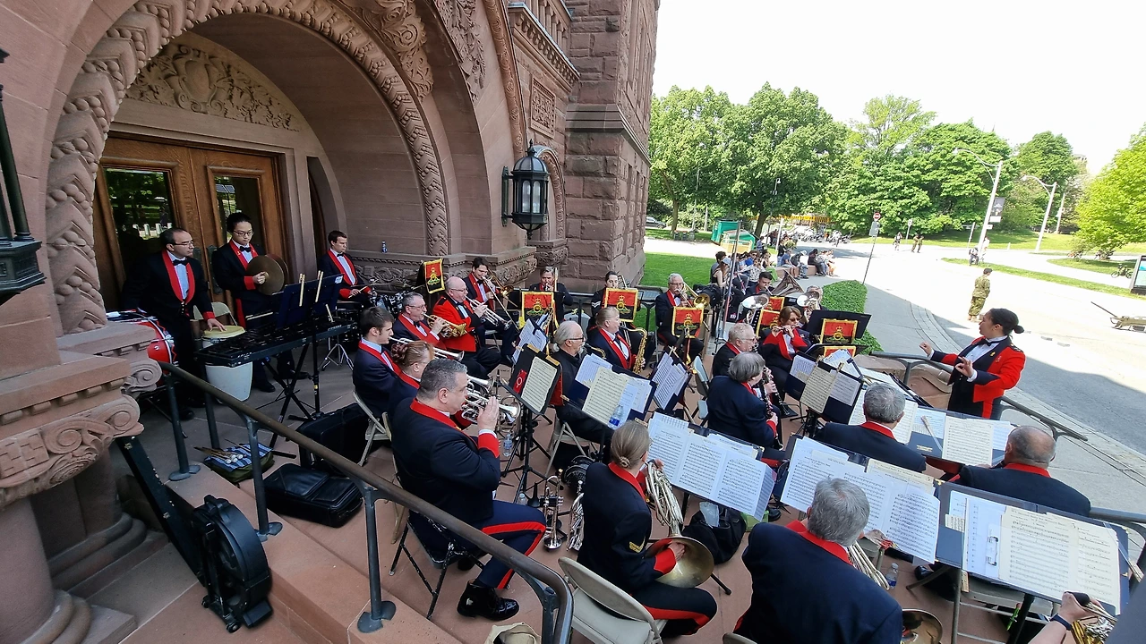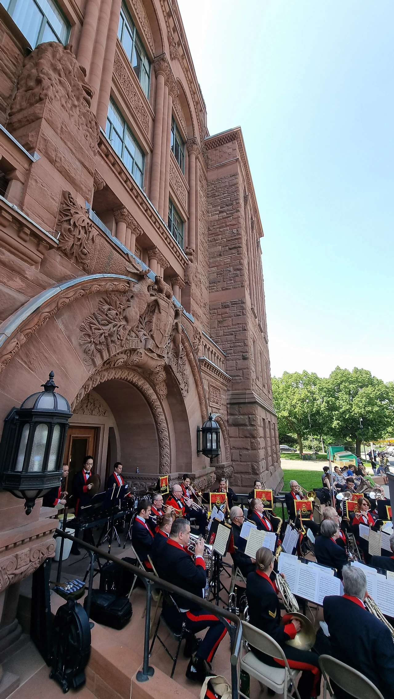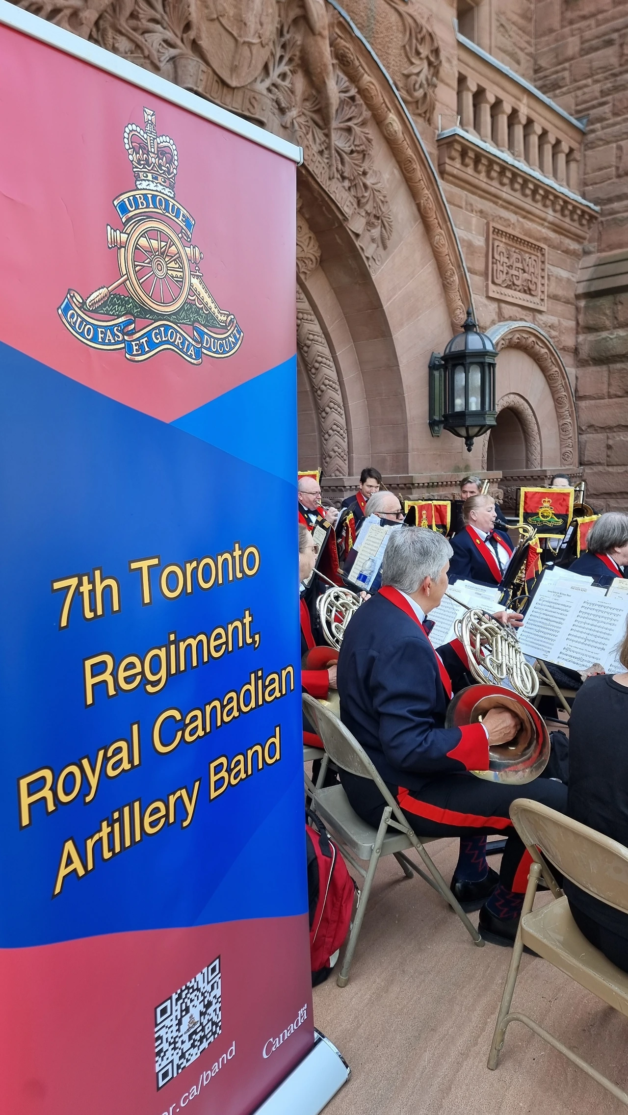 토론토 다운타운 중심에 위치한 퀸즈 파크, 사실상 빅토리아 여왕을 기념하는 파크,를 산책하는데 어디선가 튜바 소리가 들리는 듯했는데 내 귀가 맞았다. 자세히 보니 brass 중심의 한 무리의 밴드가 온타리오 주의회당의 한 건물 앞에서 연주 준비를 하고 있었다. 캐나다 군의 왕립 제7 포병 연대의 군악대였다. 헐.. 이런 횡재가..