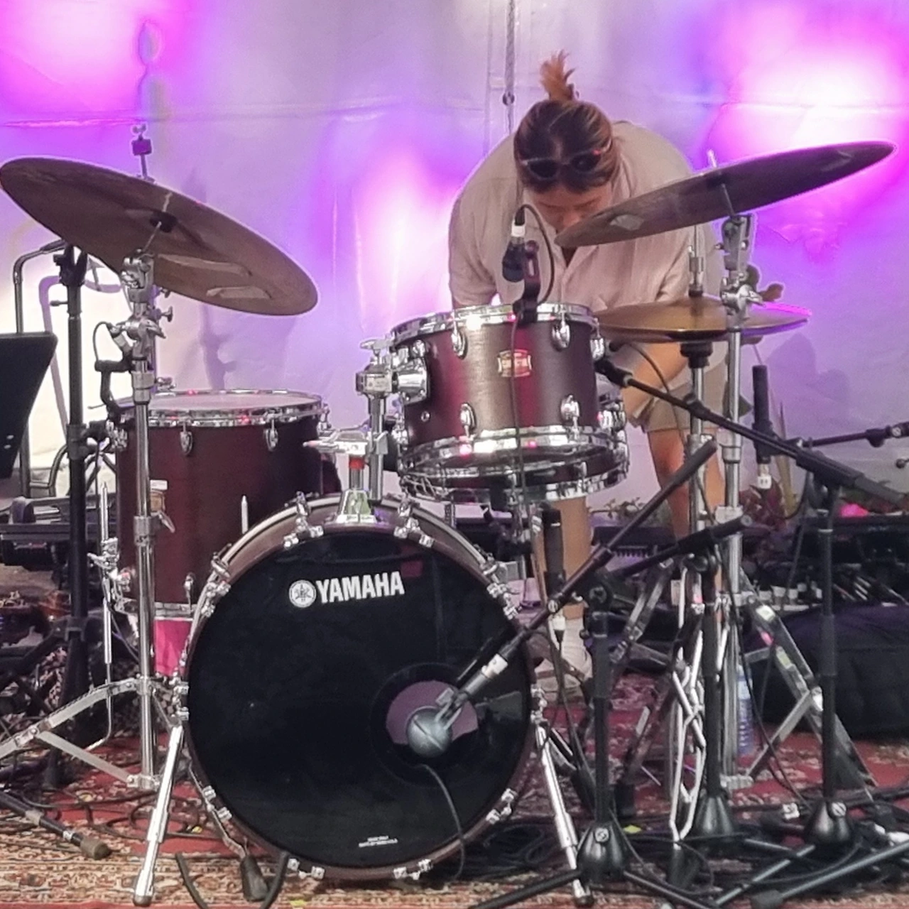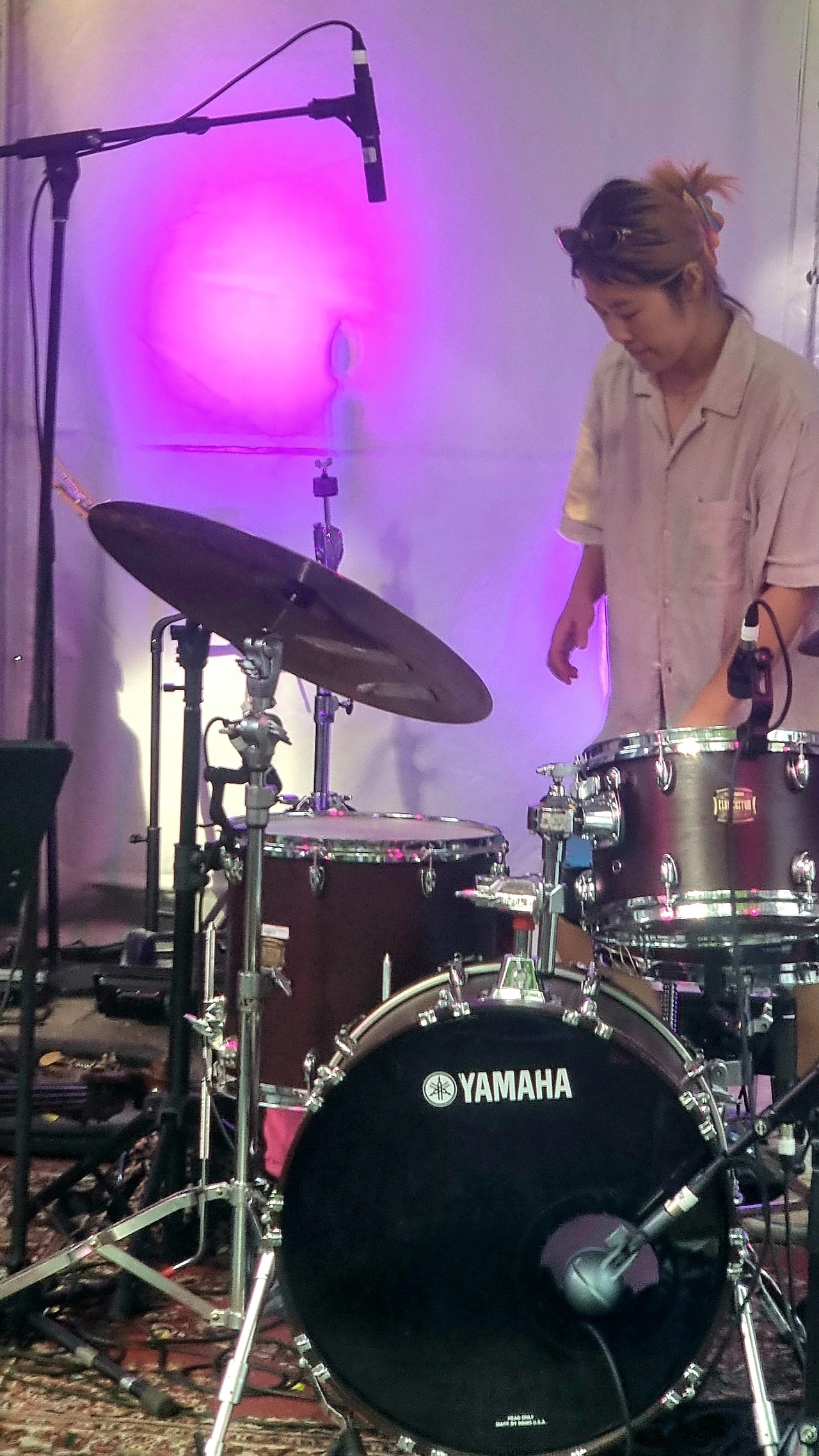 The unbounded cubicle is her UNIVERSE as a drummer creating sound and rhythm. She might be PERFECT, STABLE, and FREE inside the physically small but creatively vast space.