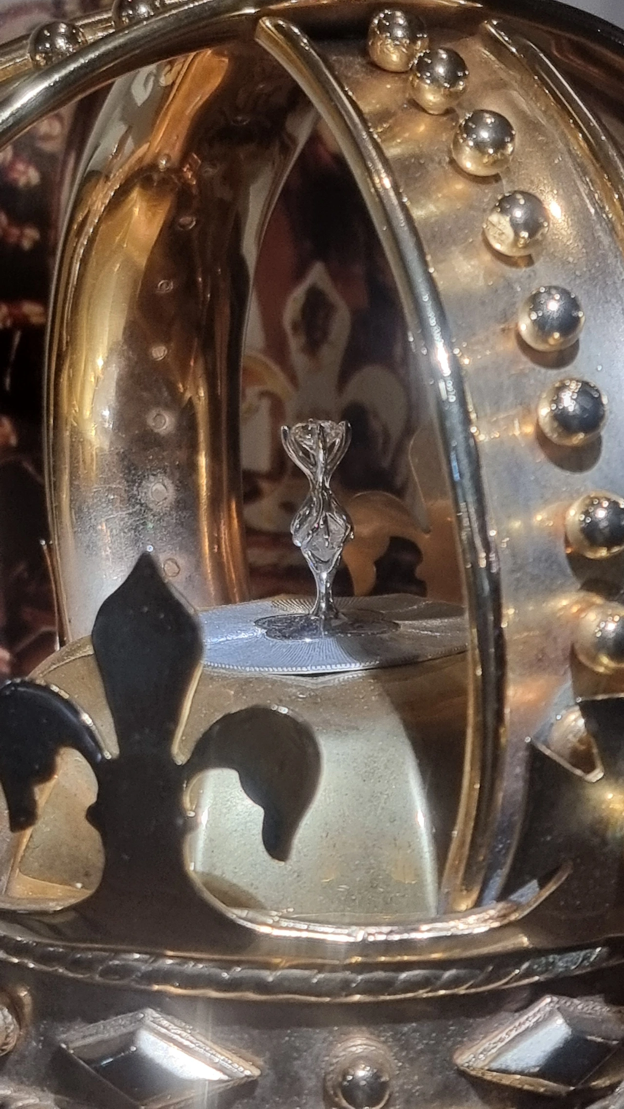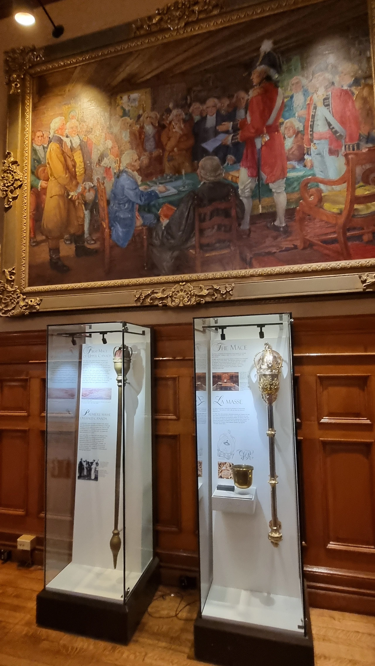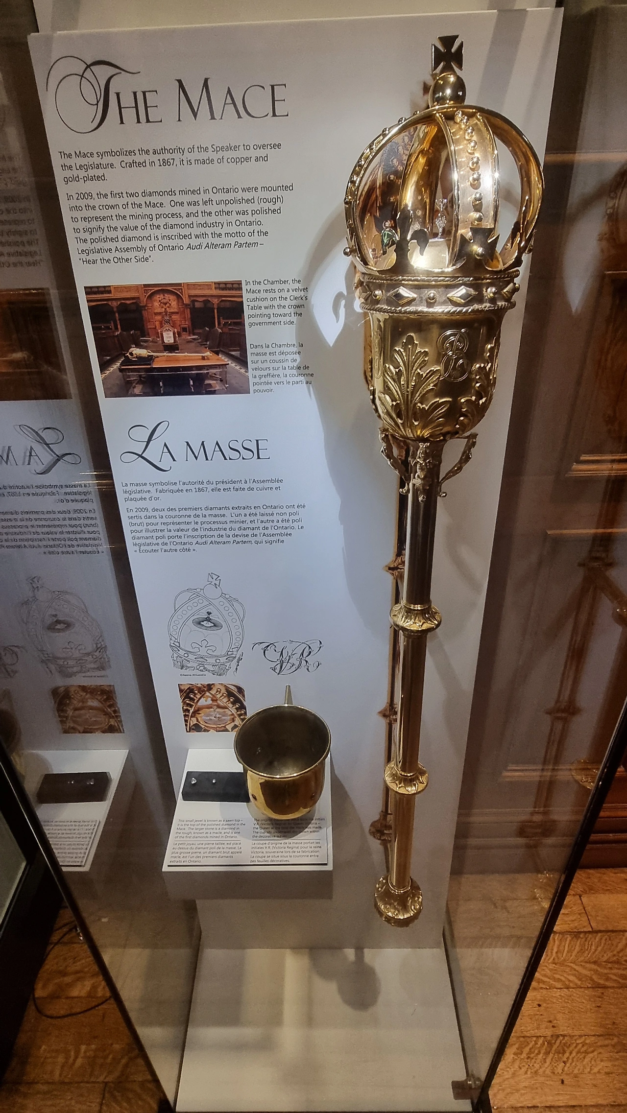 의회의 의장에게 주어지는 mace. 크라운의 정 중앙 공간에는 두개의 큰 다이아몬드가 놓여 있는데 온타리오의 다이아몬드 광산에서 채굴된 것이다. 캐나다는 세계 3위 다이아몬드 생산국으로 년 매출 $2.2 B 정도 규모다. 많은 캐나다 다이아몬드 컨설턴트들이 전세계 다이아몬드 광산에서 일하고 있다는..