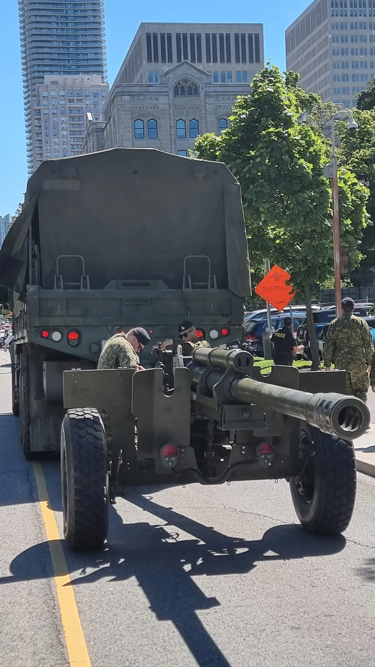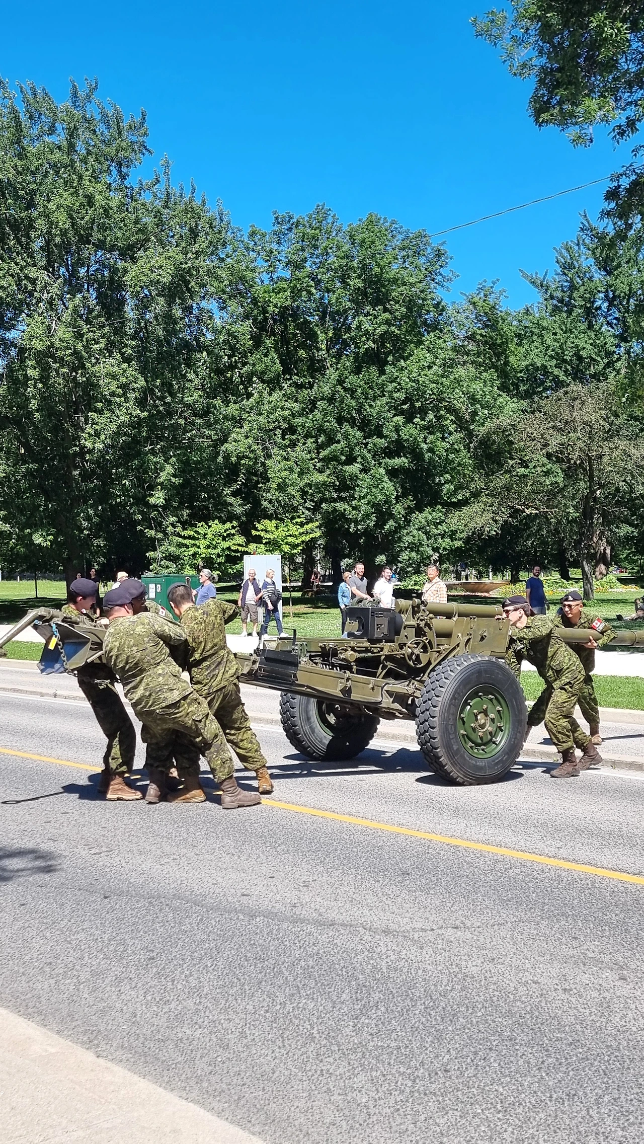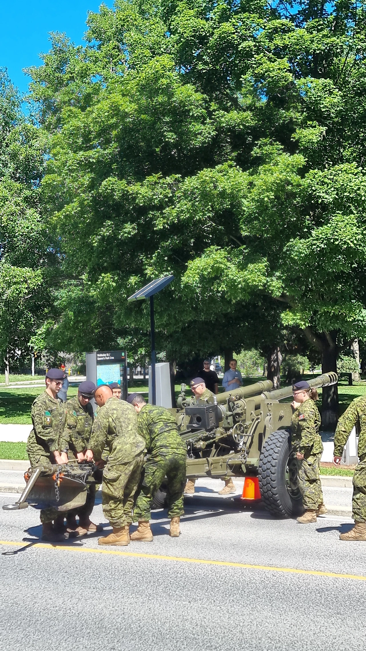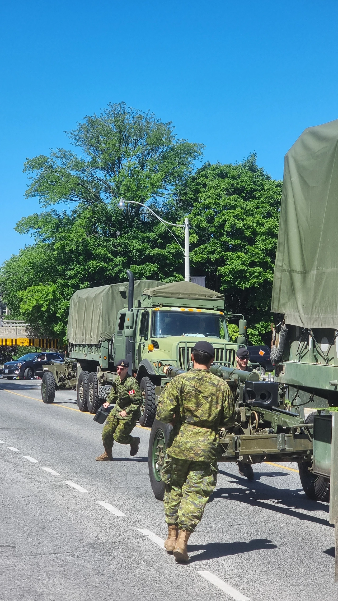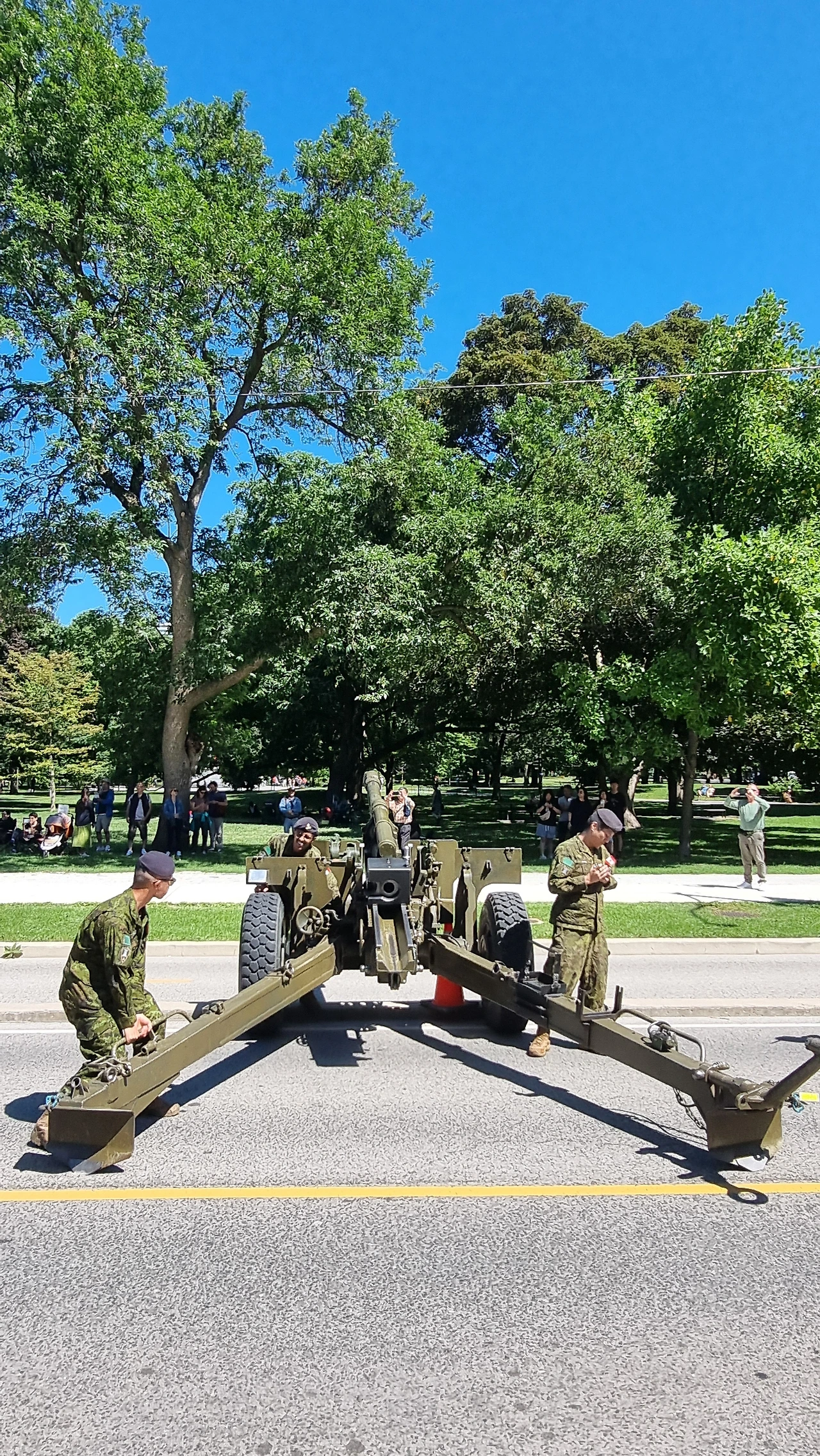 이후 이제는 퇴역한 105 mm 포 3 문이 현 캐나다 육군 포병여단의 트럭에 견인되어 입장한다.