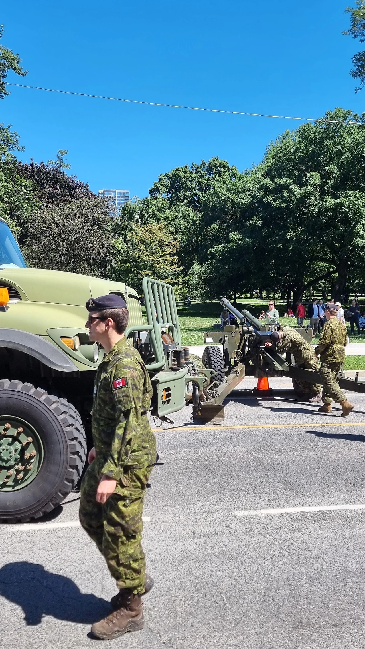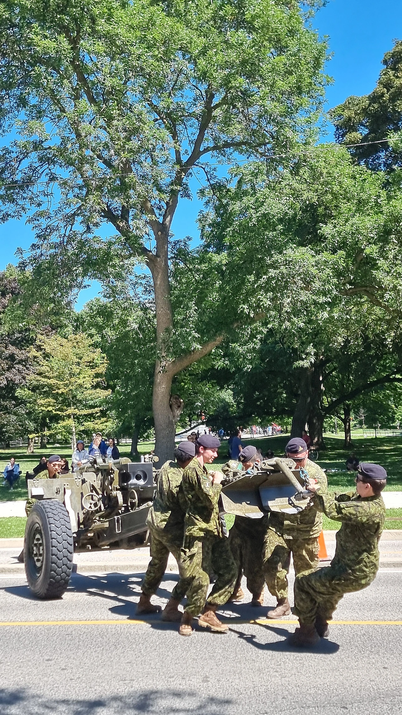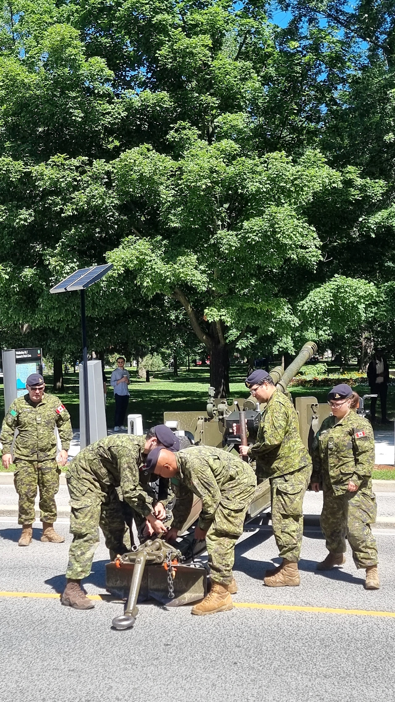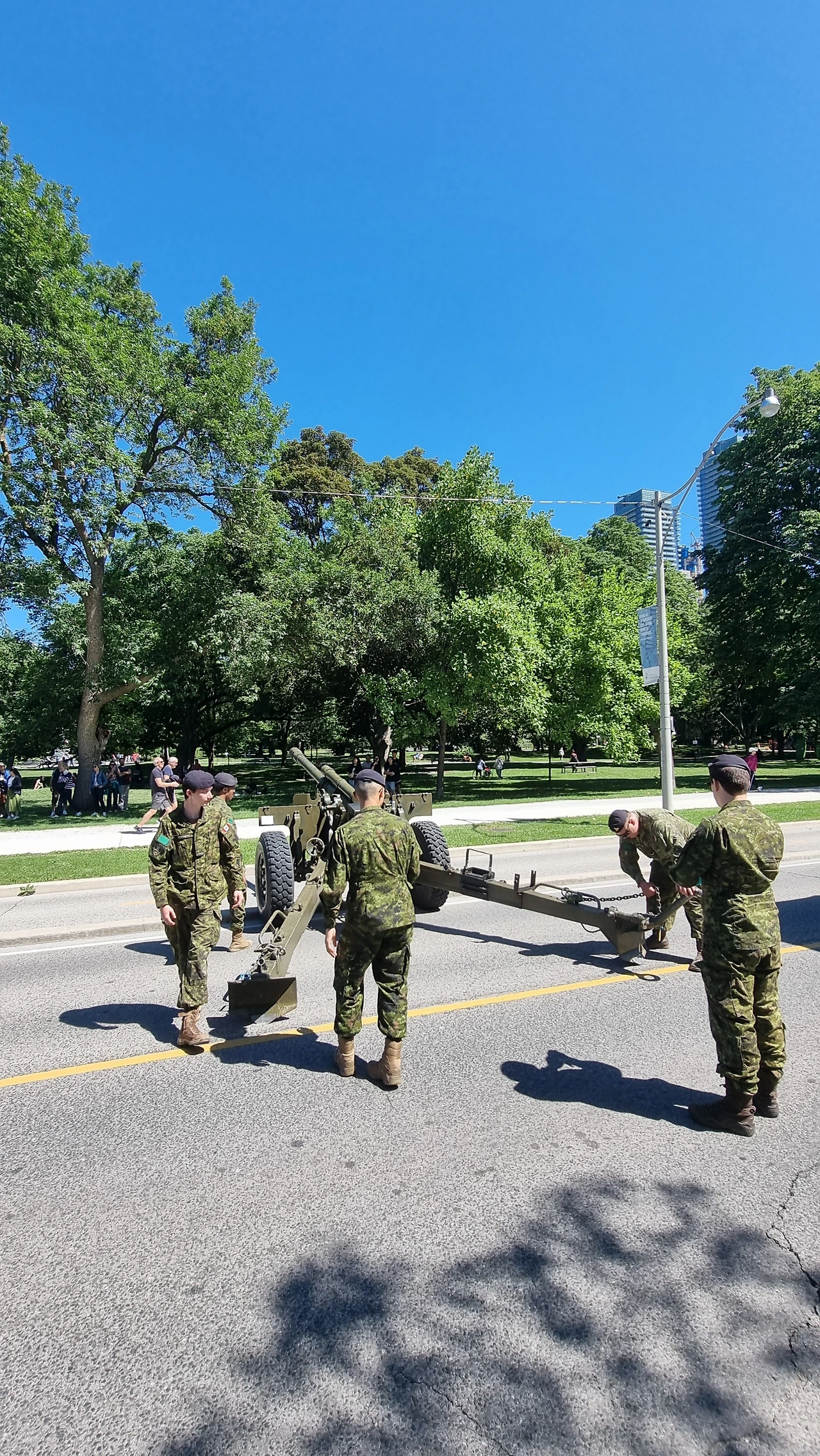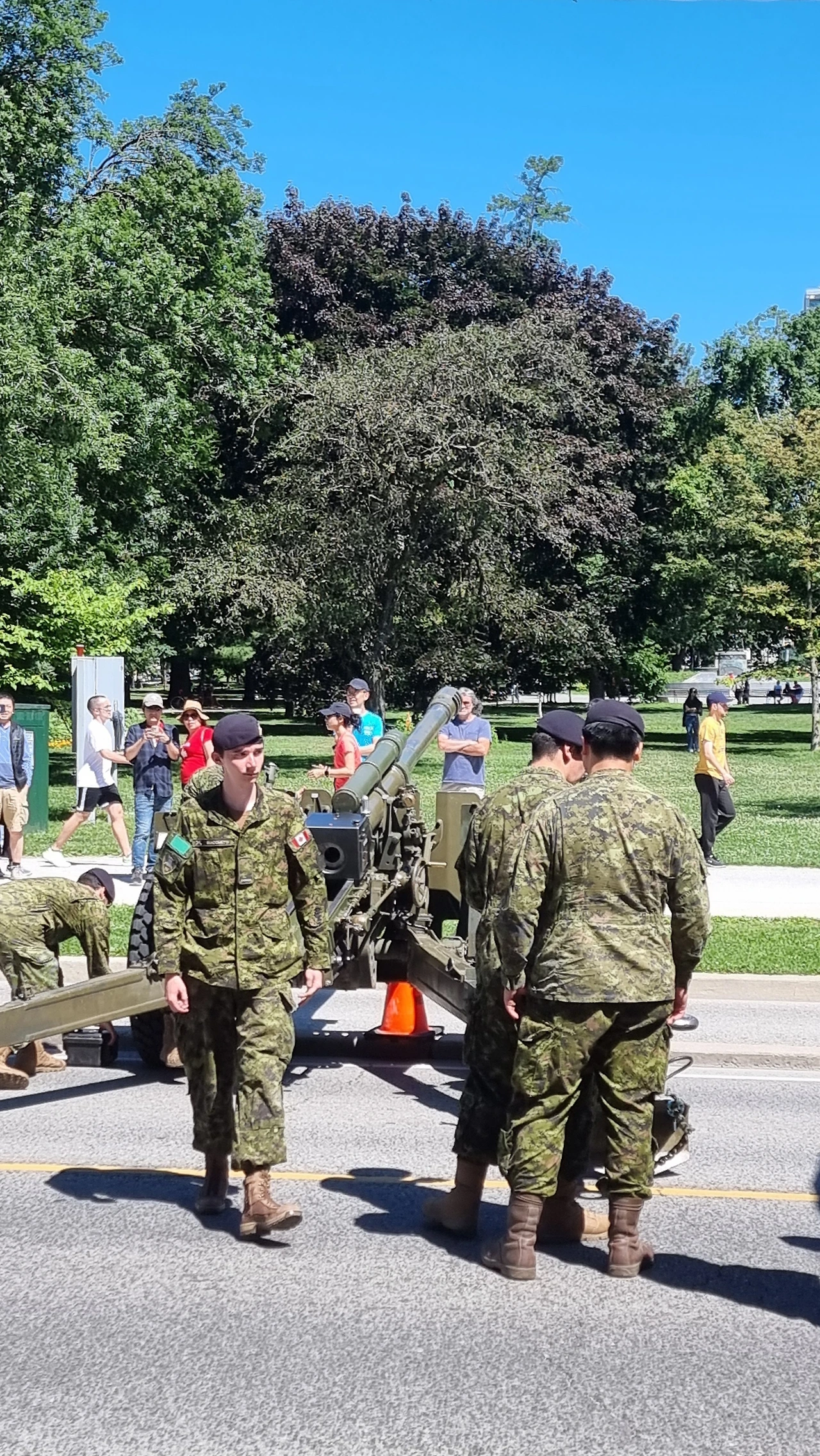이후 이제는 퇴역한 105 mm 포 3 문이 현 캐나다 육군 포병여단의 트럭에 견인되어 입장한다.