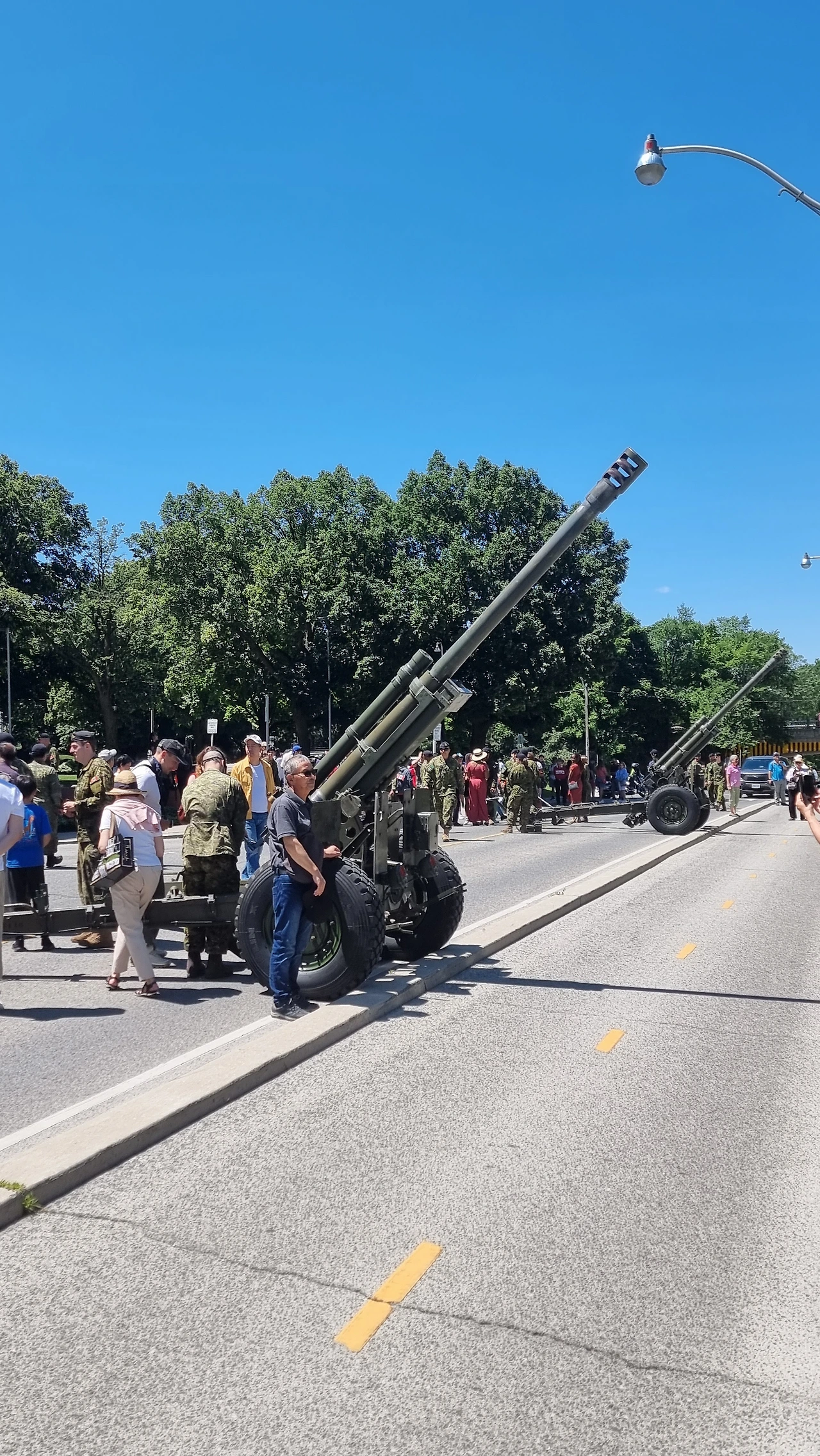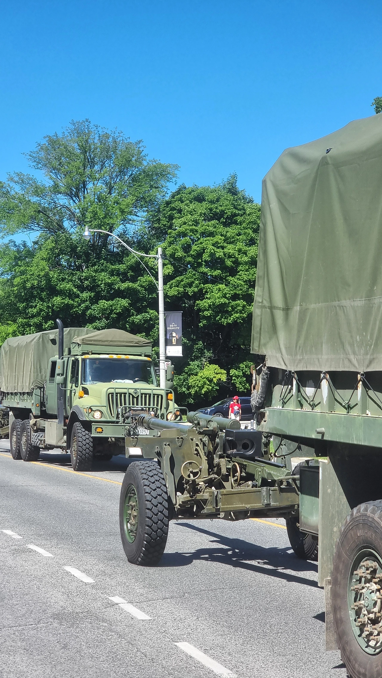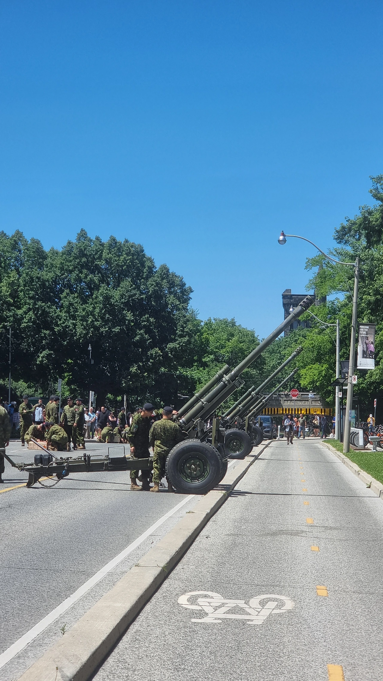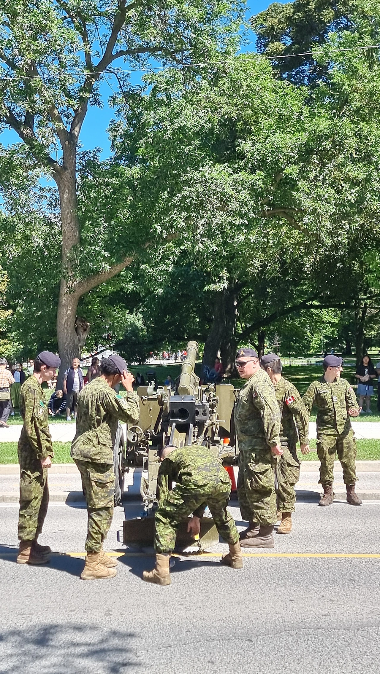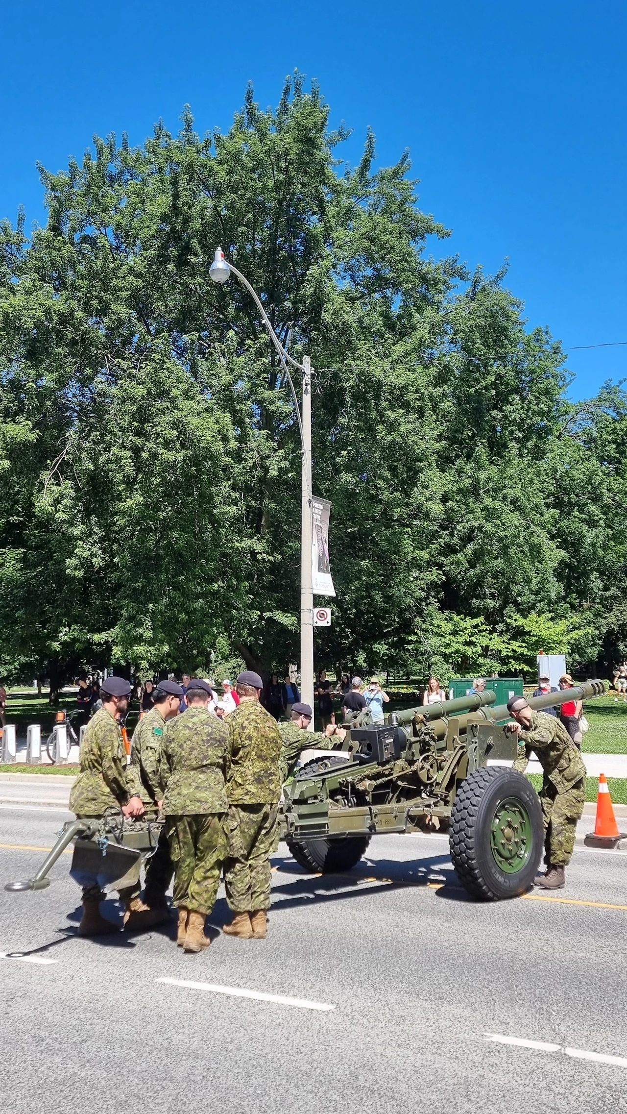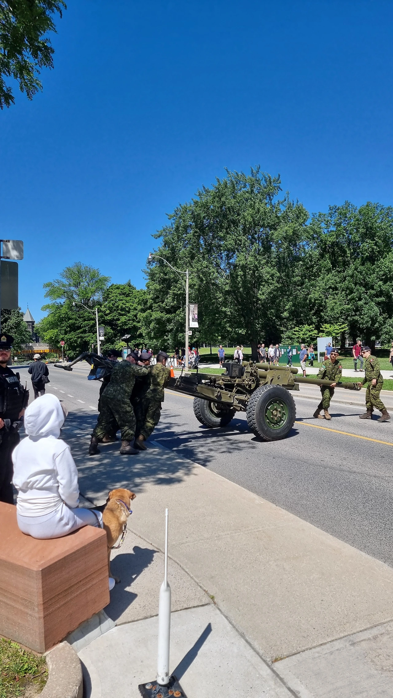 이후 이제는 퇴역한 105 mm 포 3 문이 현 캐나다 육군 포병여단의 트럭에 견인되어 입장한다.