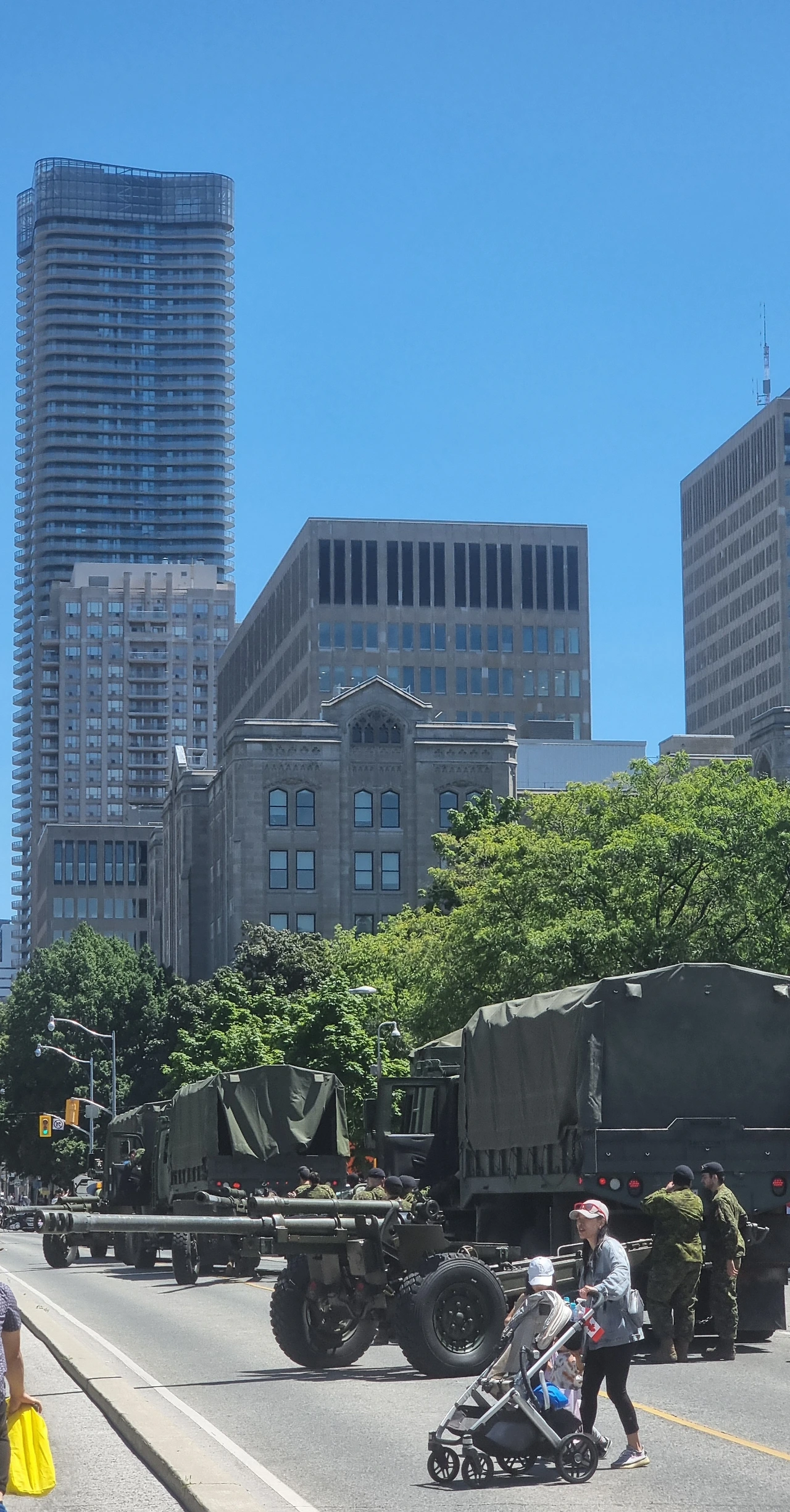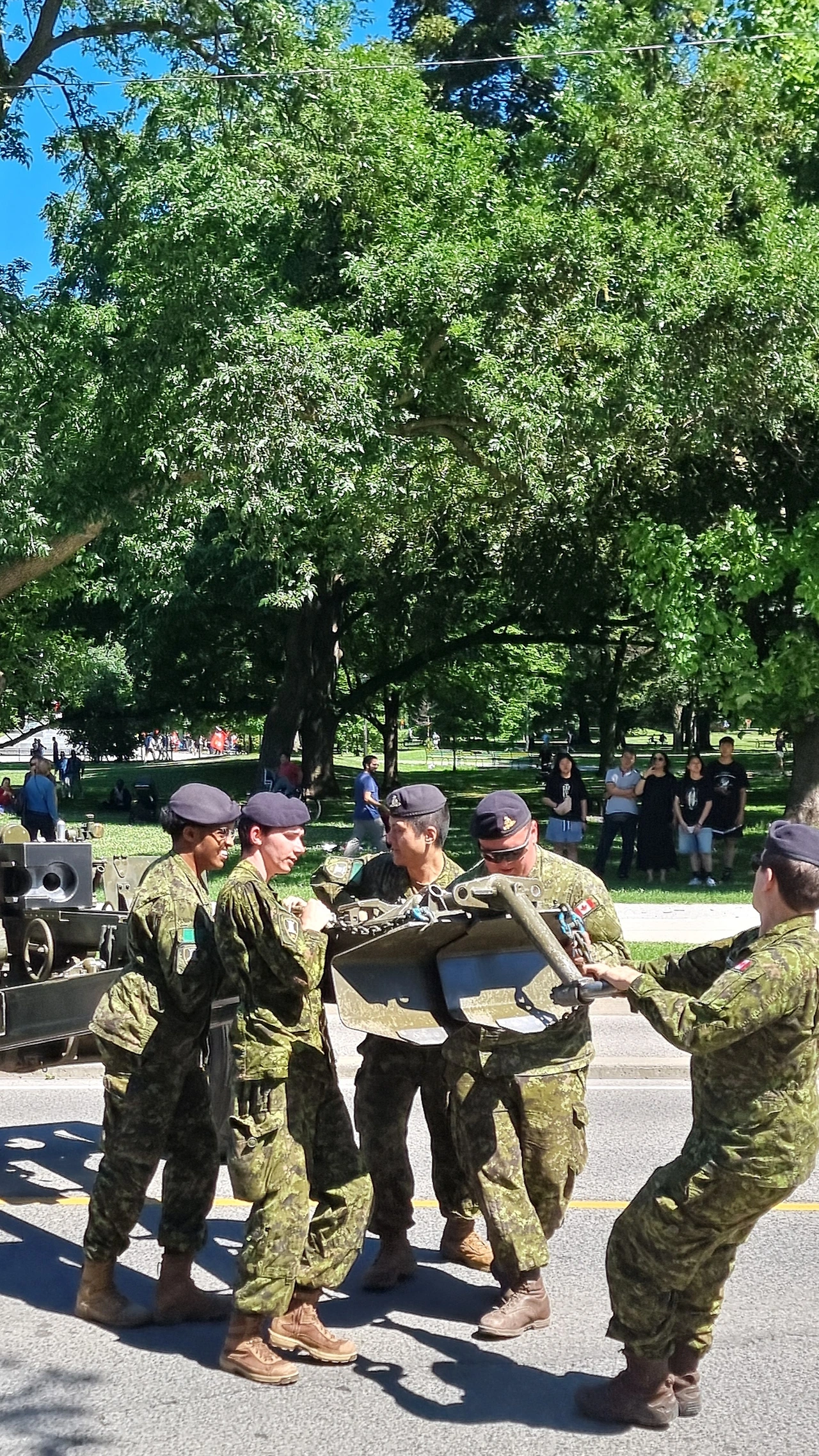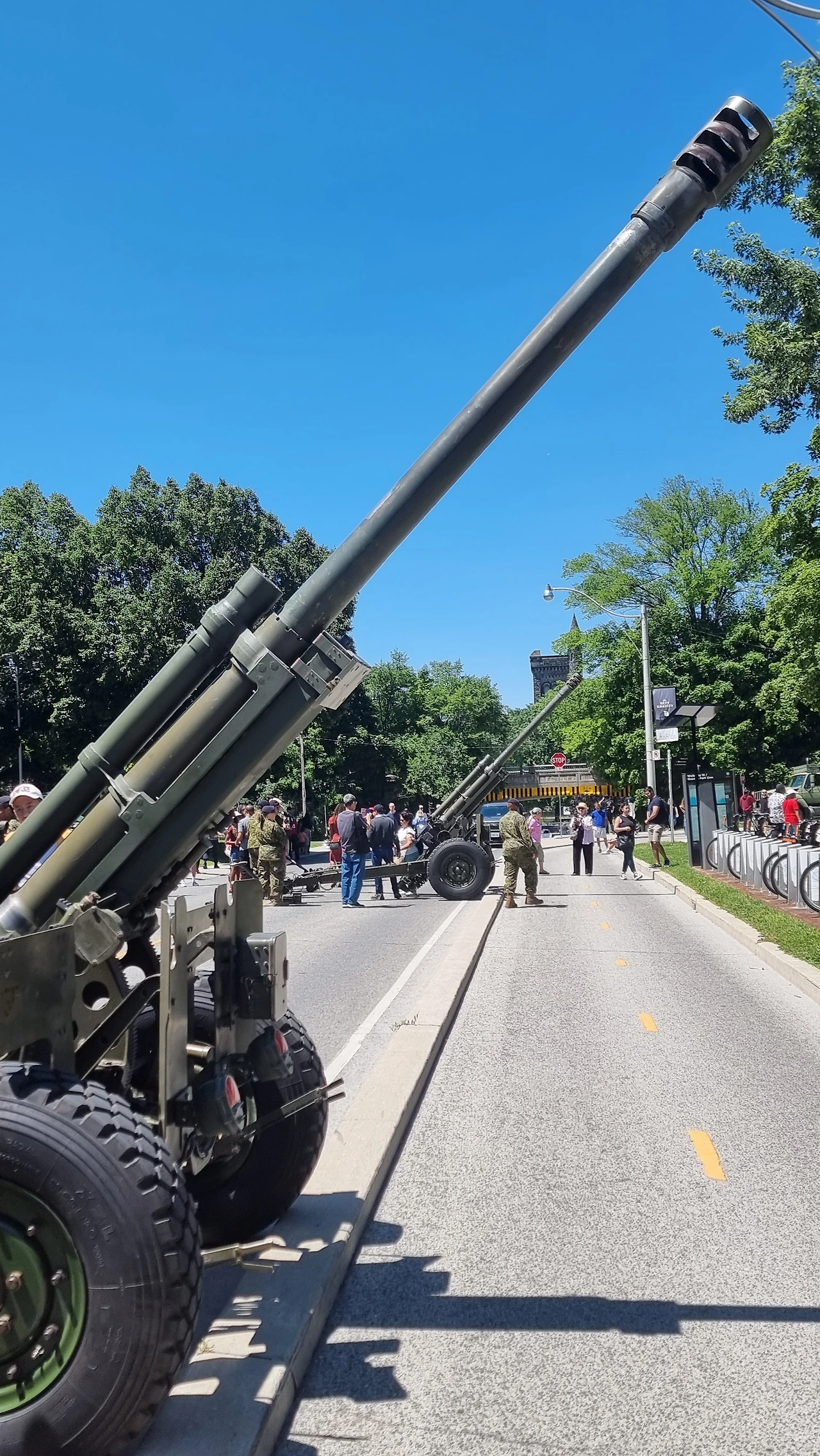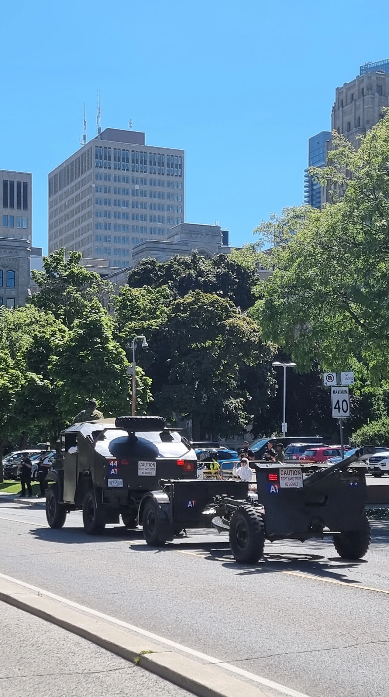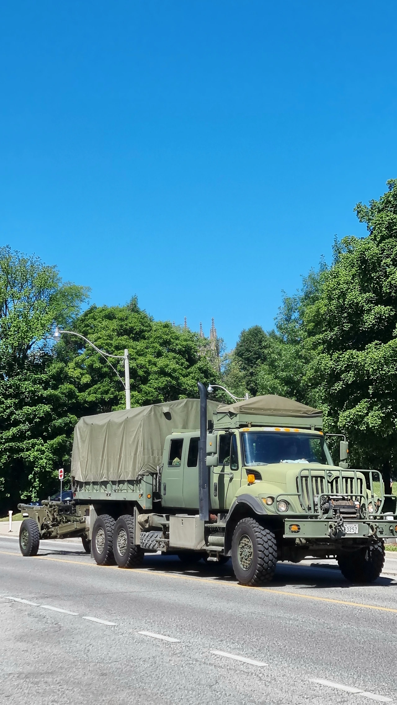 이후 이제는 퇴역한 105 mm 포 3 문이 현 캐나다 육군 포병여단의 트럭에 견인되어 입장한다.