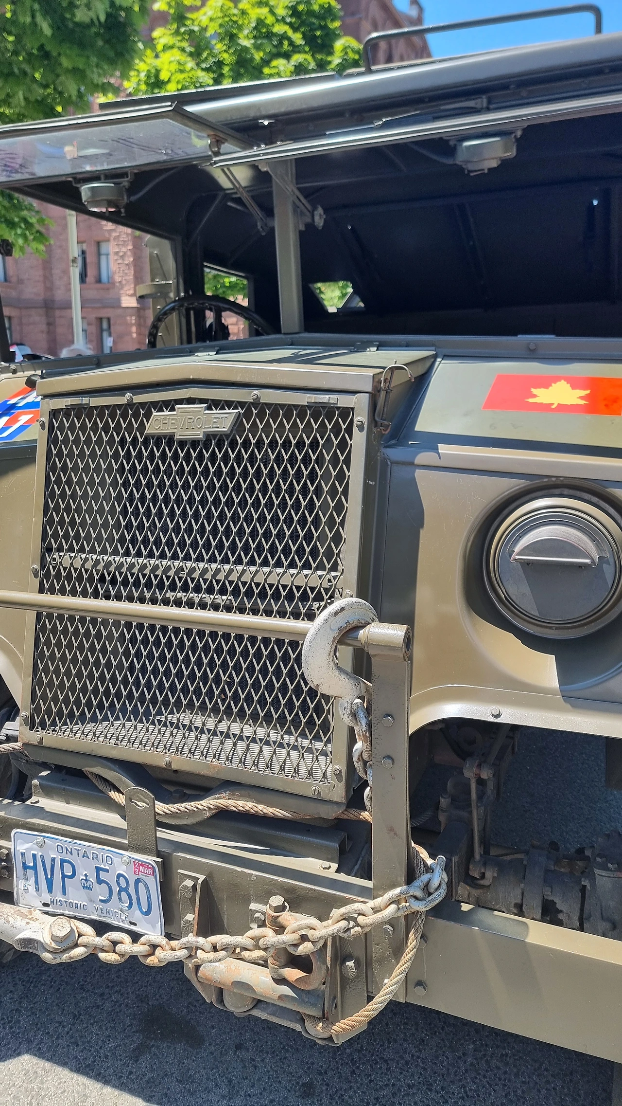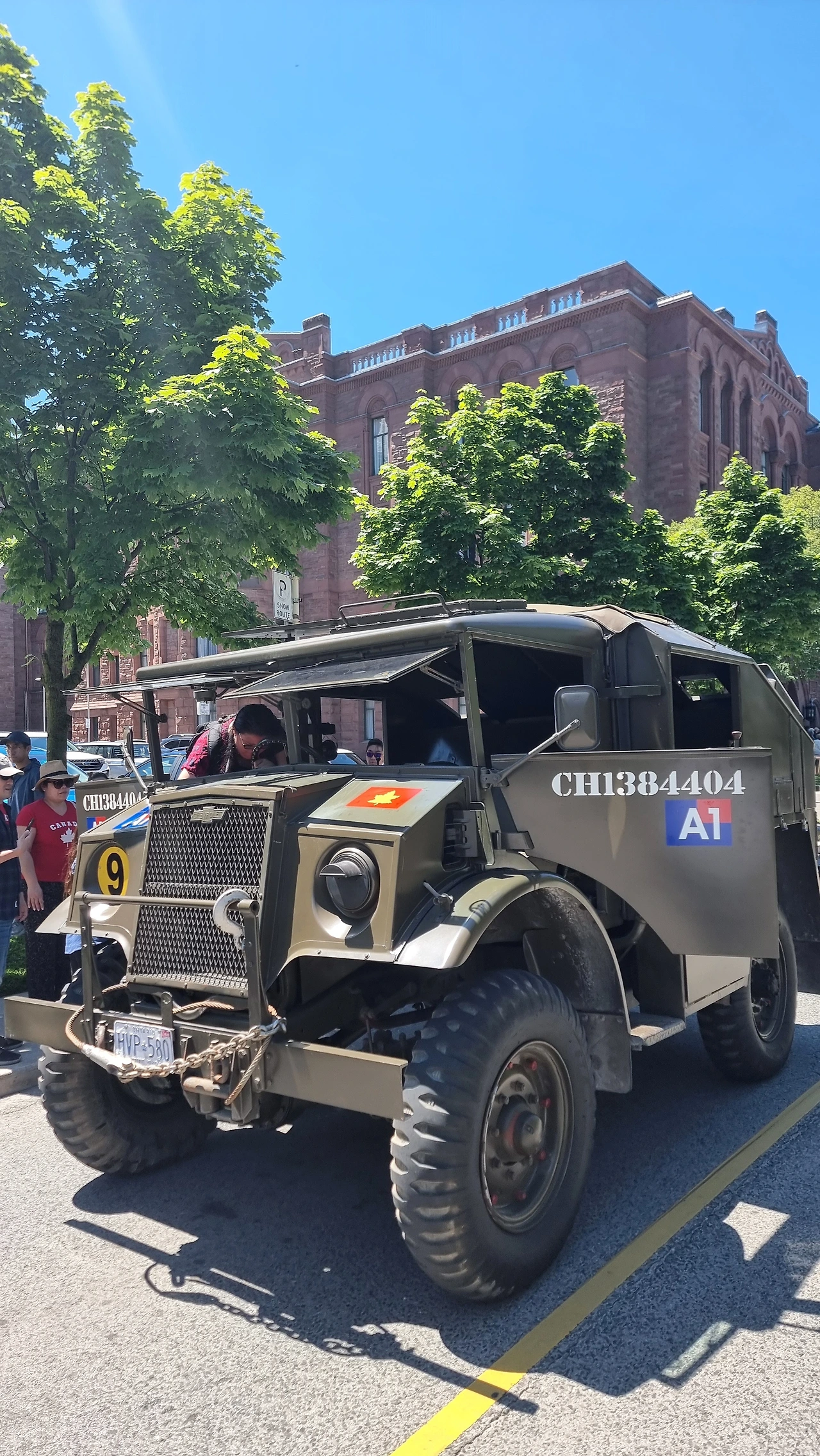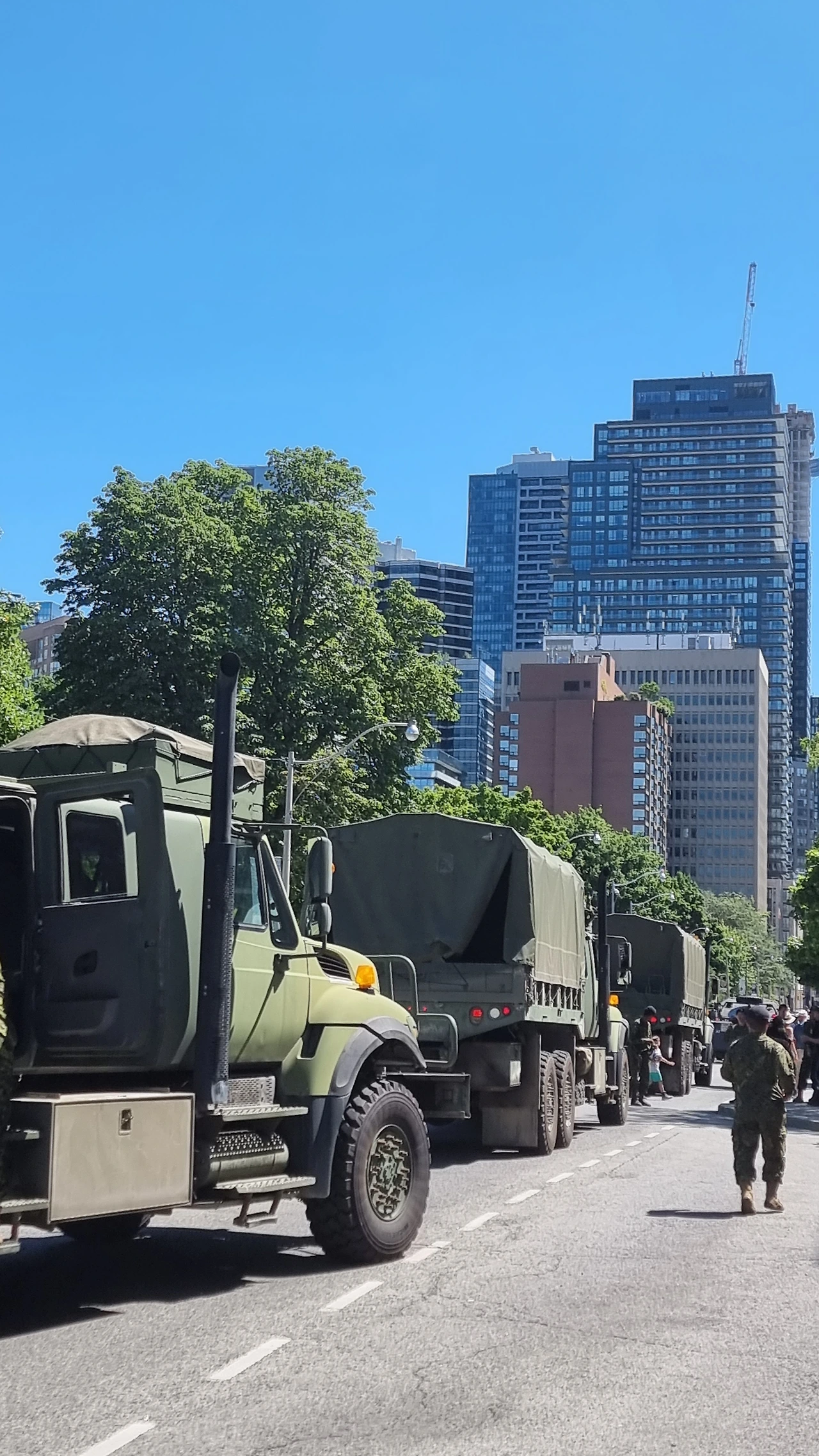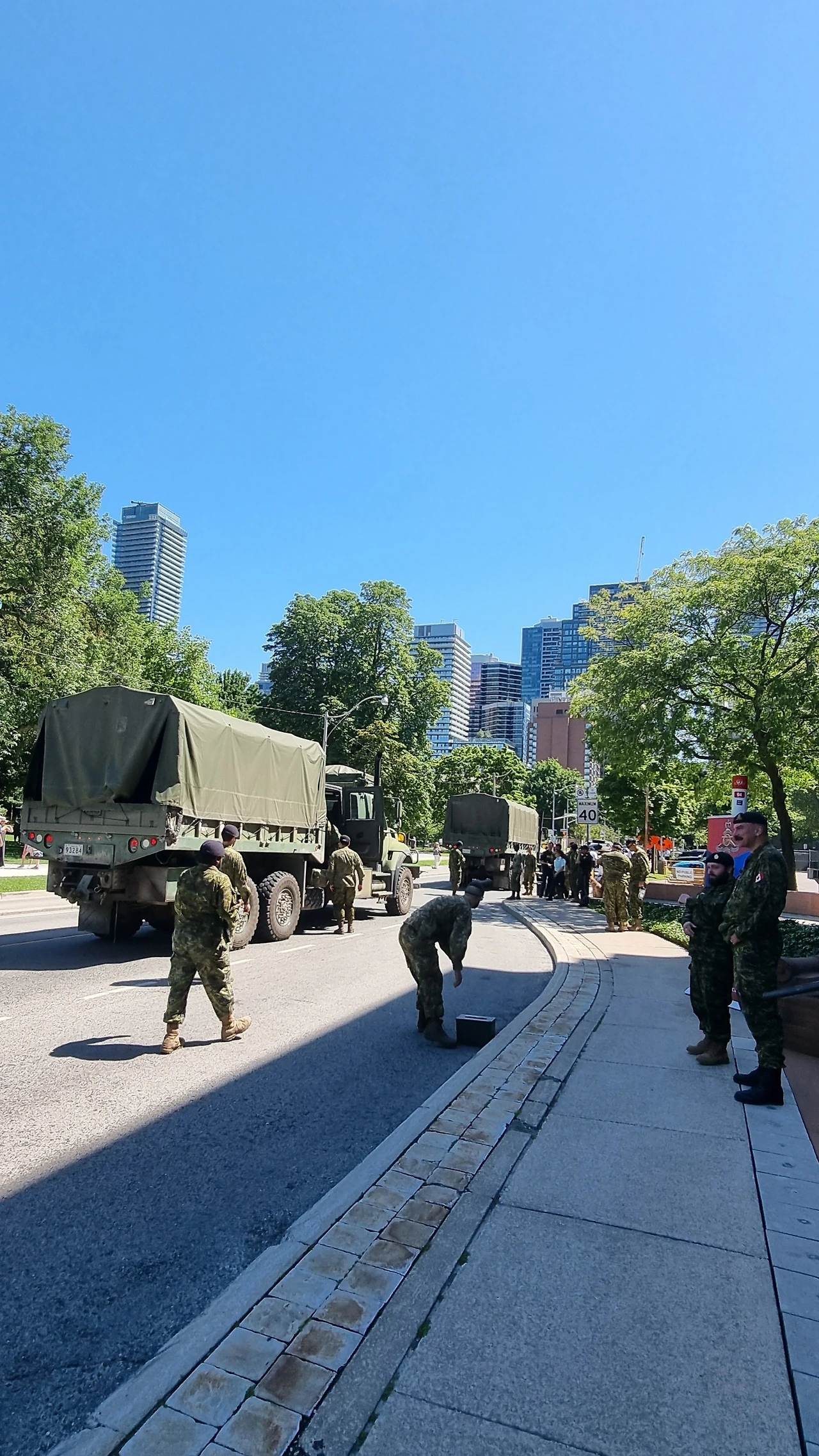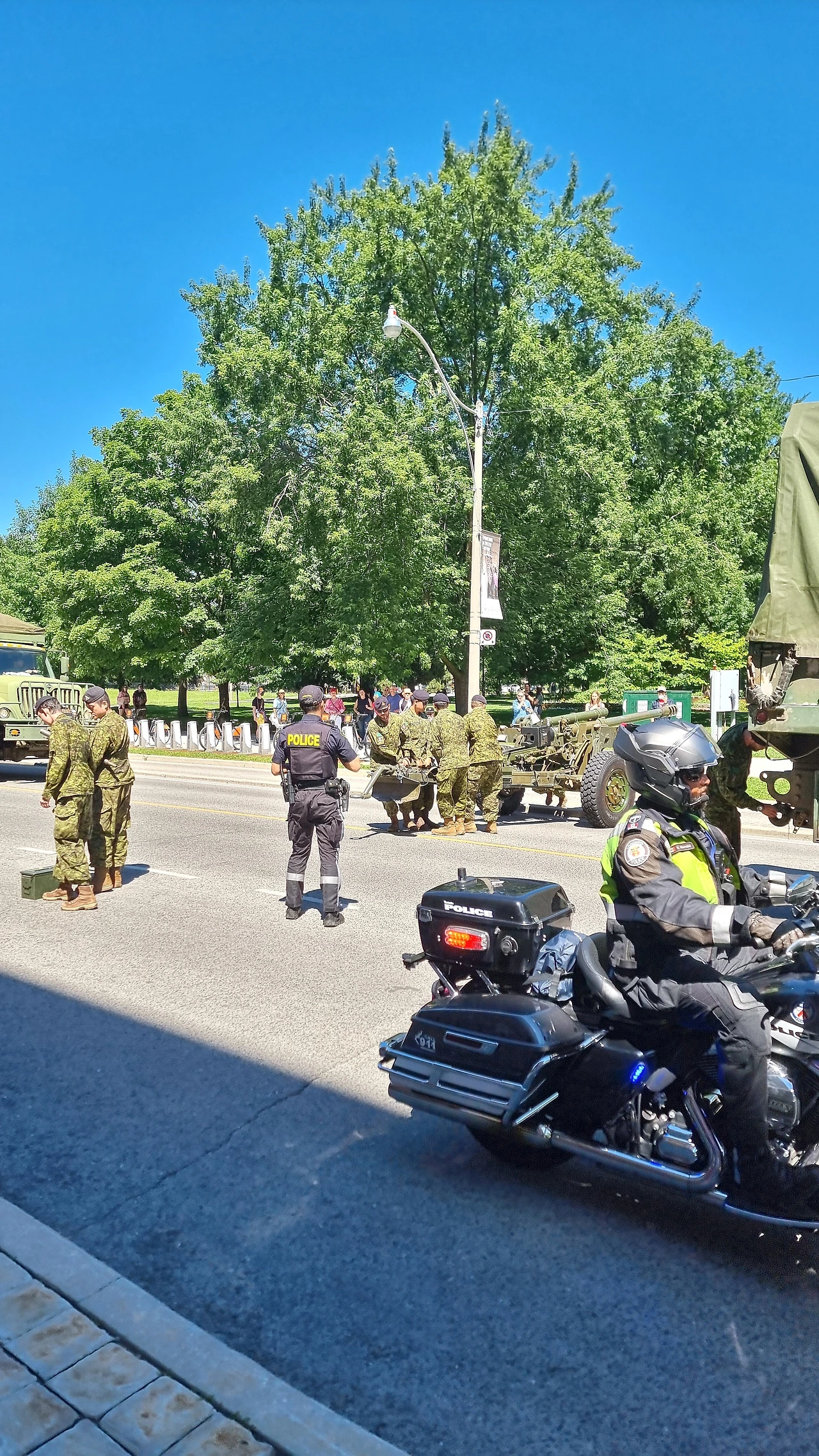 이후 이제는 퇴역한 105 mm 포 3 문이 현 캐나다 육군 포병여단의 트럭에 견인되어 입장한다.