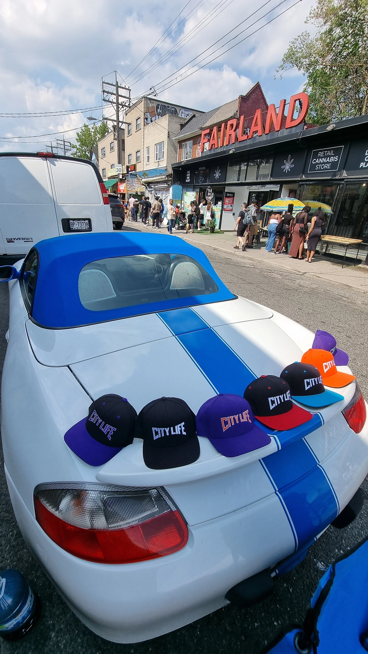 A blue-striped Porsche cabriolet selling hats. Cute!