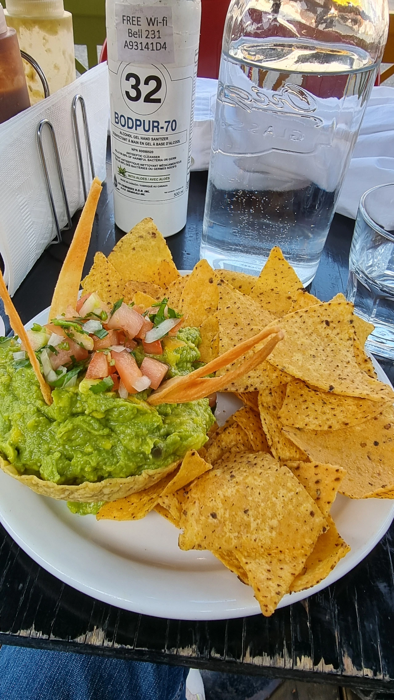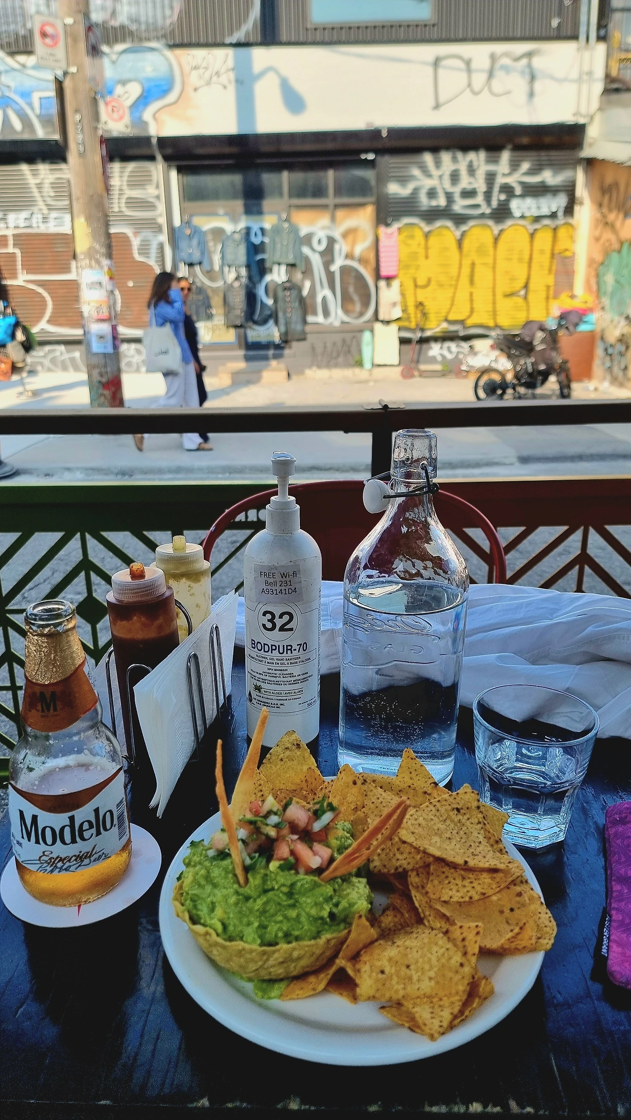 A bottle of Modelo with a typical Mexican finger food, Guacamole Vegan I ordered.