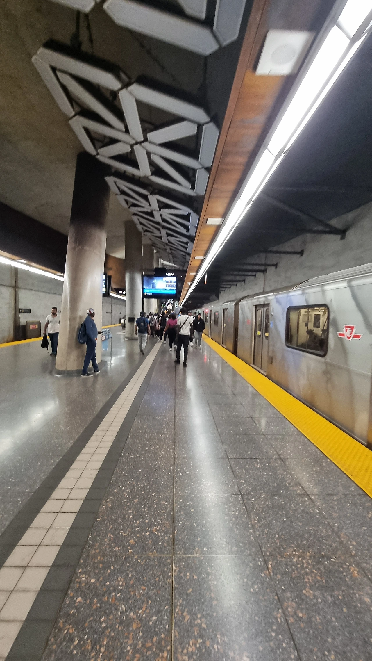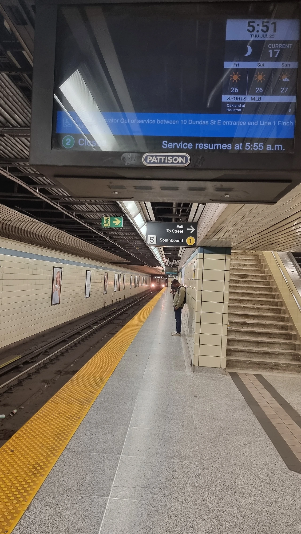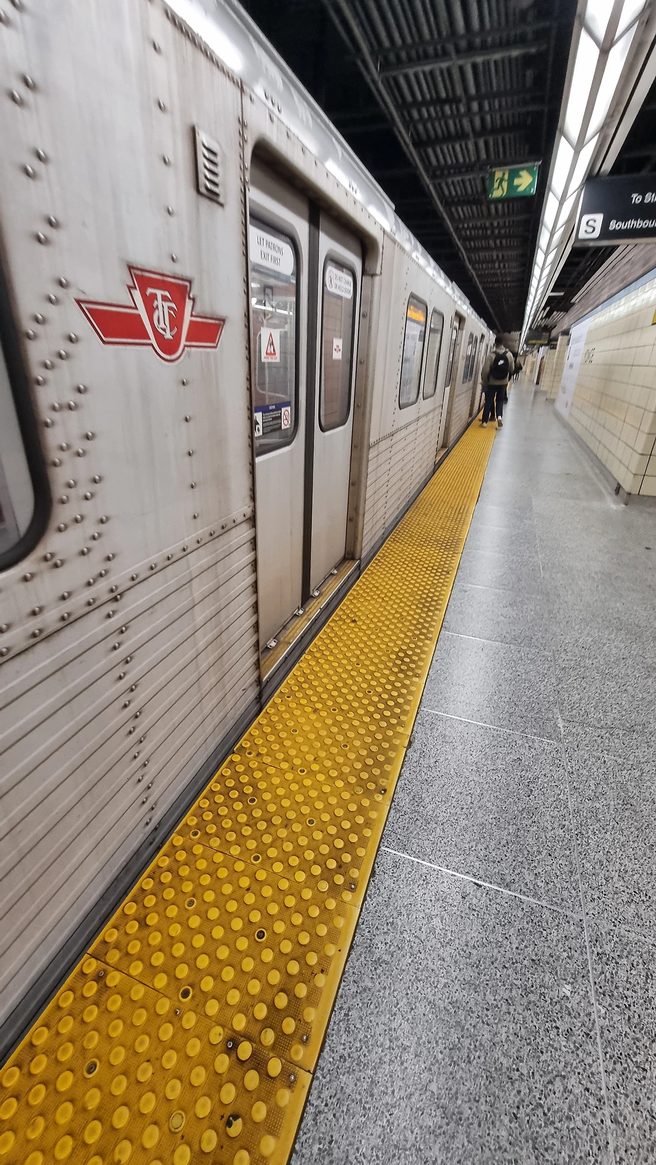 1호선 남북선의 첫 열차가 운행되기 직전의 플랫폼 풍경이다.Southbound 무인전동열차가 들어올 플랫폼에 트렁크와 함께 서있는 이들은 피어슨 국제공항으로 향하는 여행객들임이 분명하다.