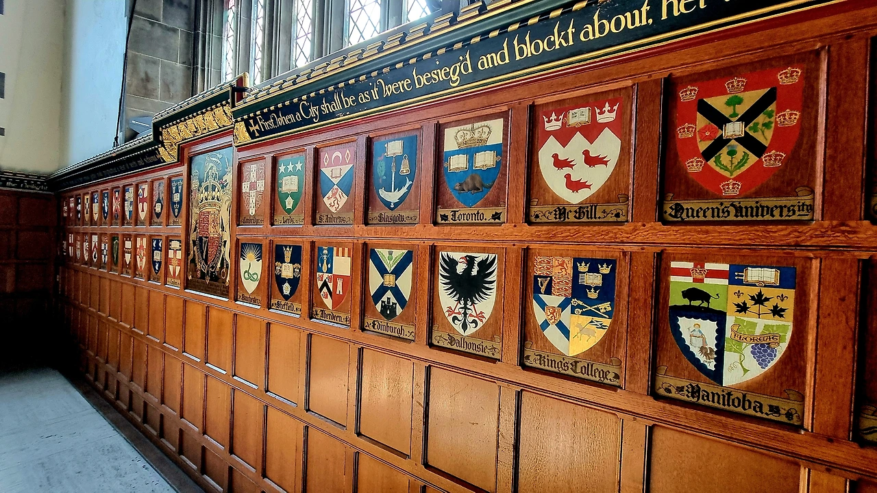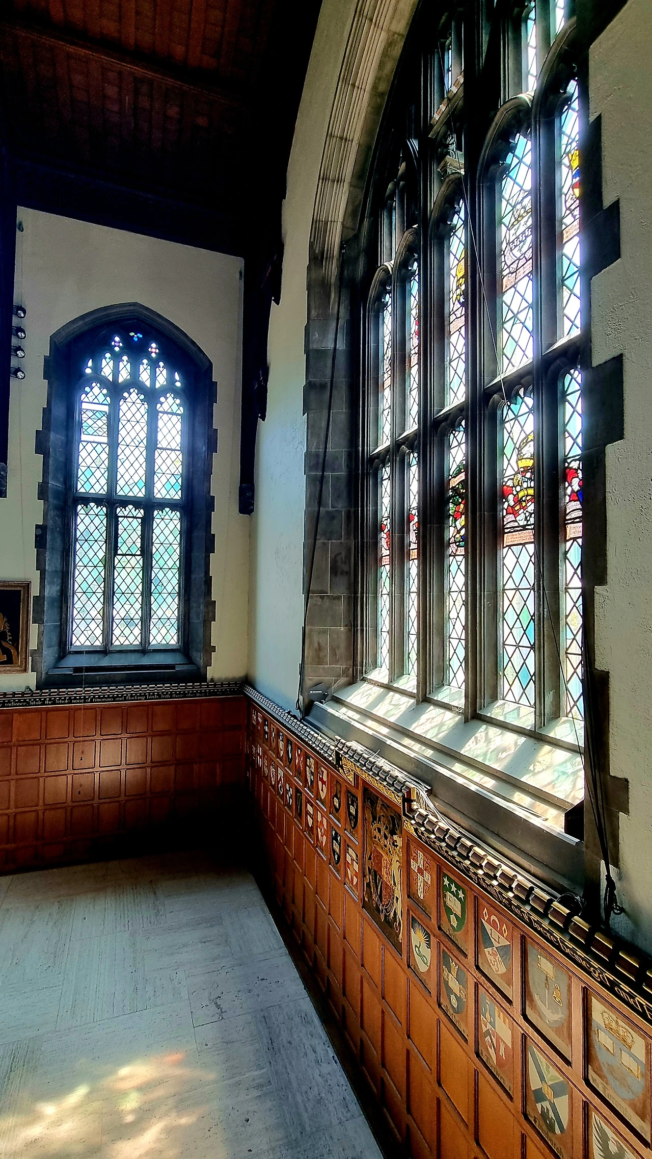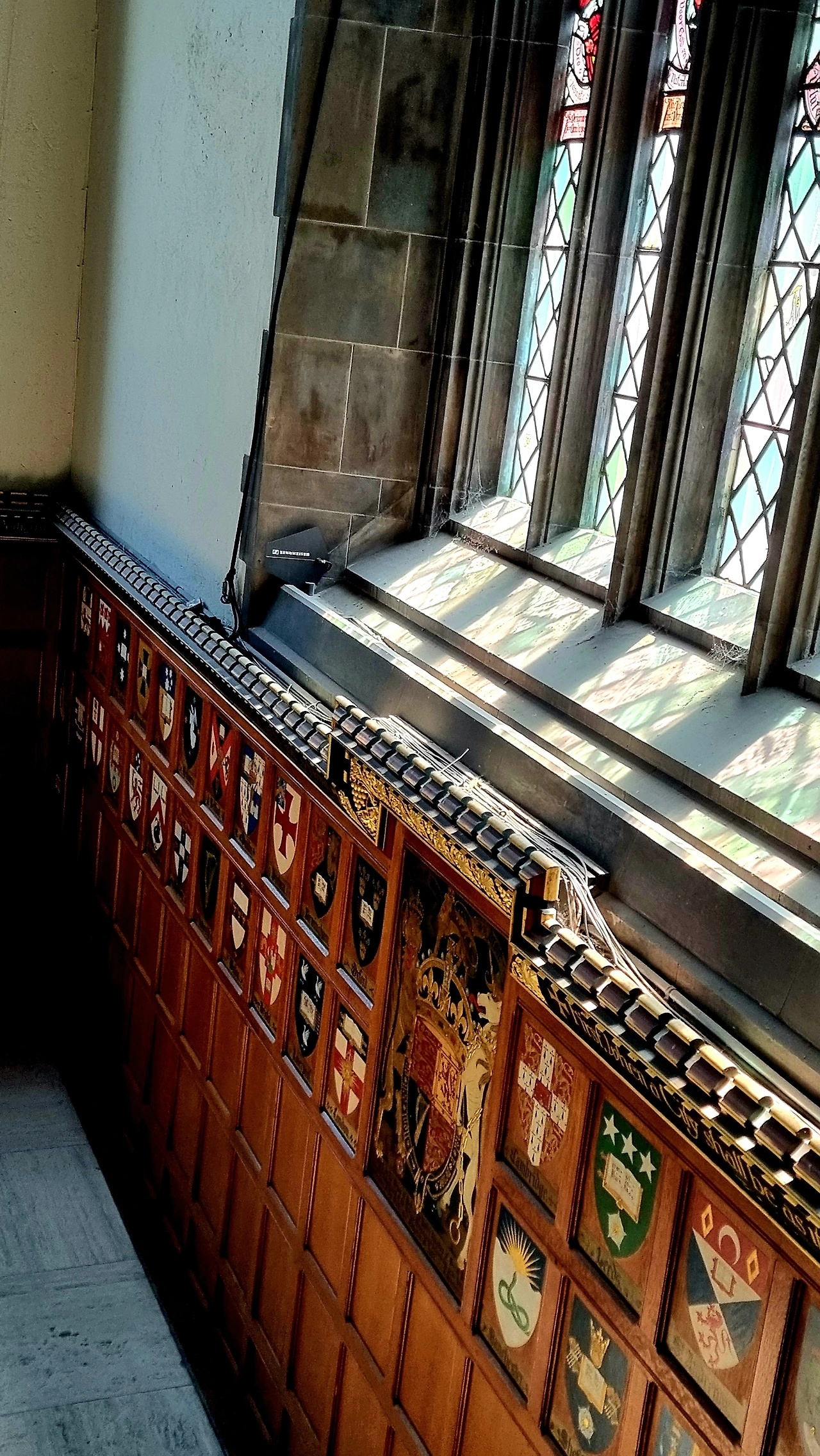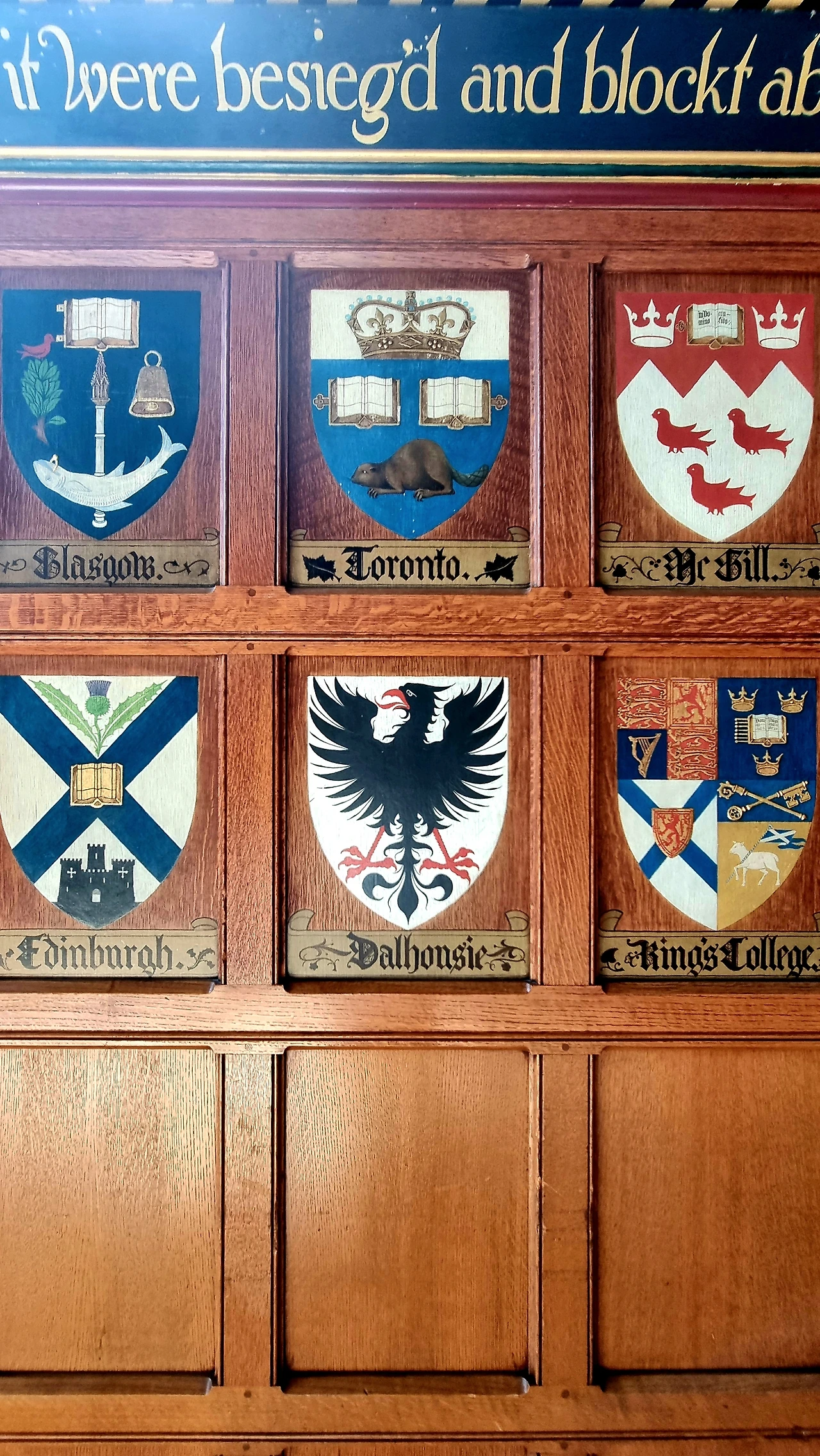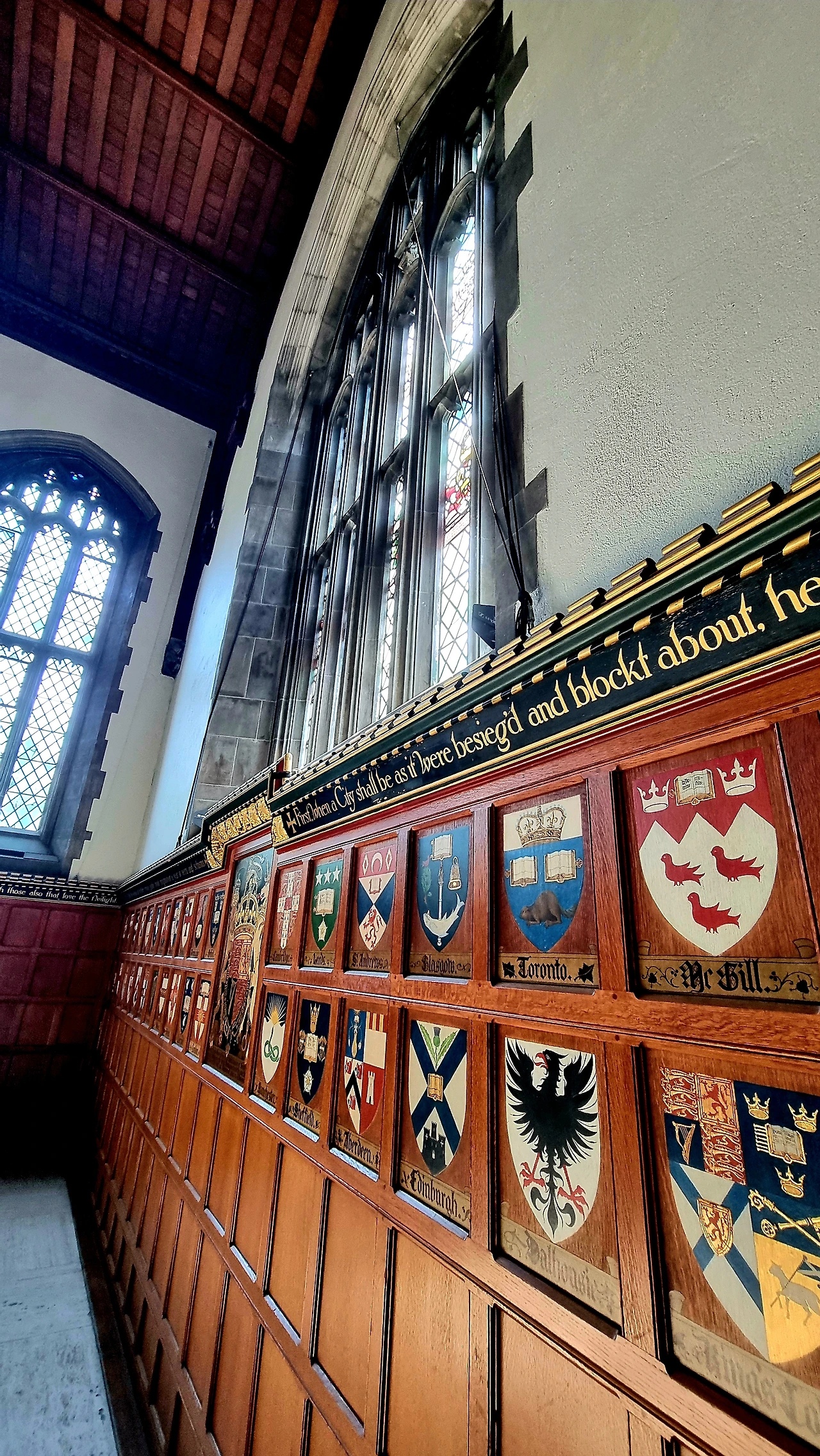 토론토대의 학생회관 격인 Hart House가 보유한 가장 큰 홀인 이곳은 대형 강연회, 컨서트, 웨딩, 연회 등등으로 쓰이는데 난 오늘 일요일 아침 산책중 처음으로 들어와 봤다. 들어서자 마자 난 그 건축적 규모와 아름다운 장엄함에 한동안 멍하니 서있었다. 스테인드 그라스 사이로 아침 햇살이 쏟아지는 한쪽 벽면엔 토론토 대학을 비롯한 캐나다의 모든 대학들의 문장이 그려져 있었고, fire place 가 놓여진 맞은편 벽면엔 유럽과 미국의 모든 대학들의 문장이 그려져 있었다. 이름만 들어도 설레는 그 모든 대학들의 이름이..