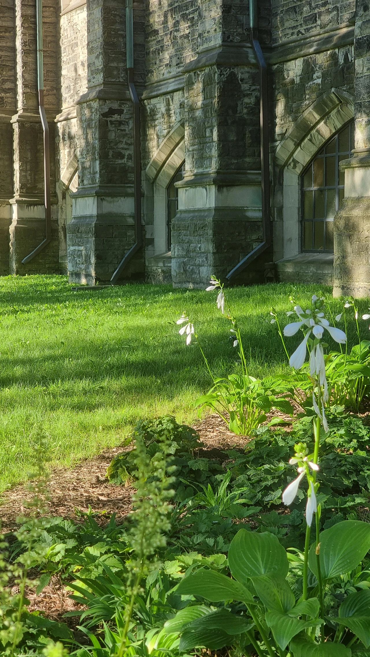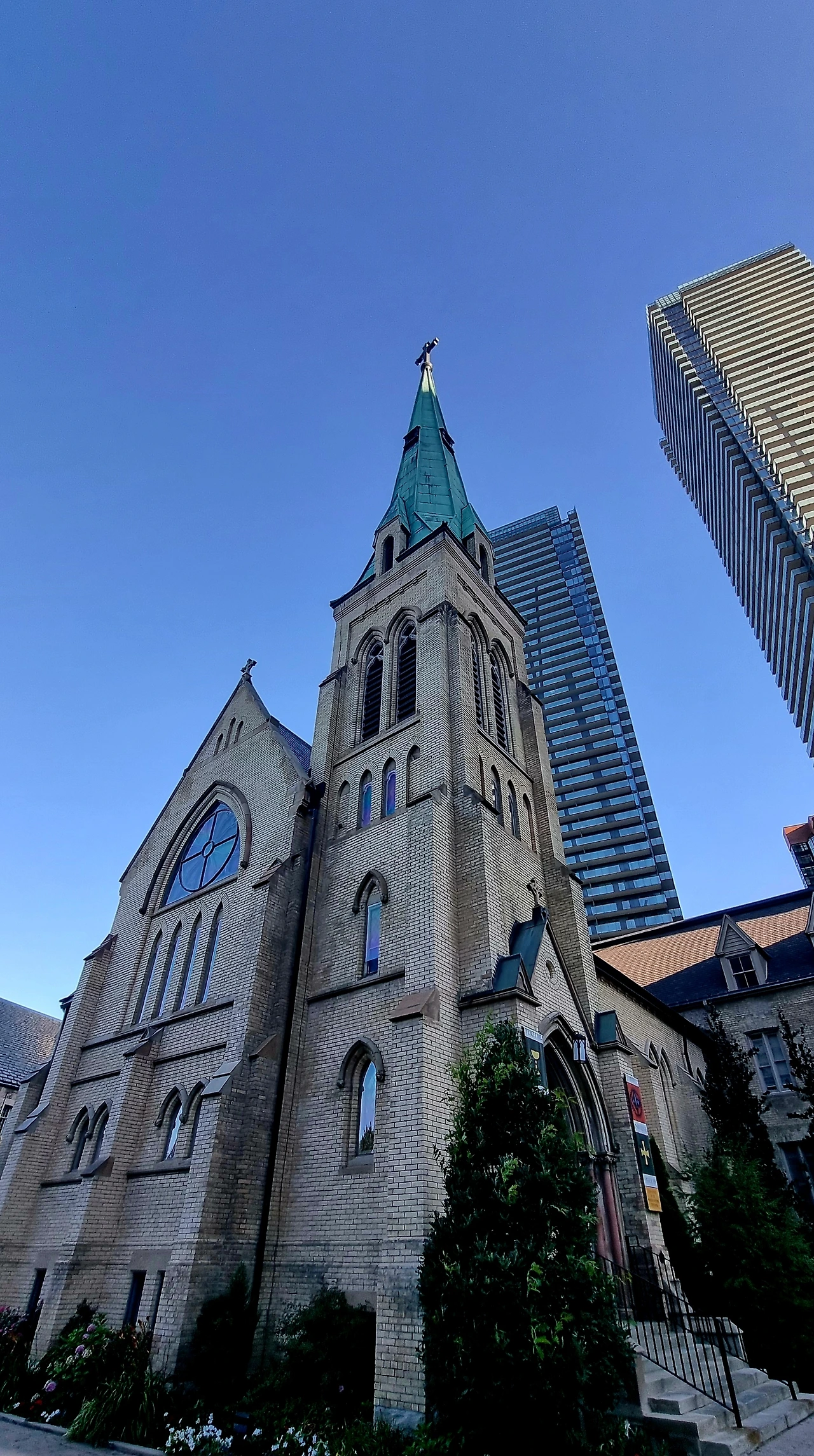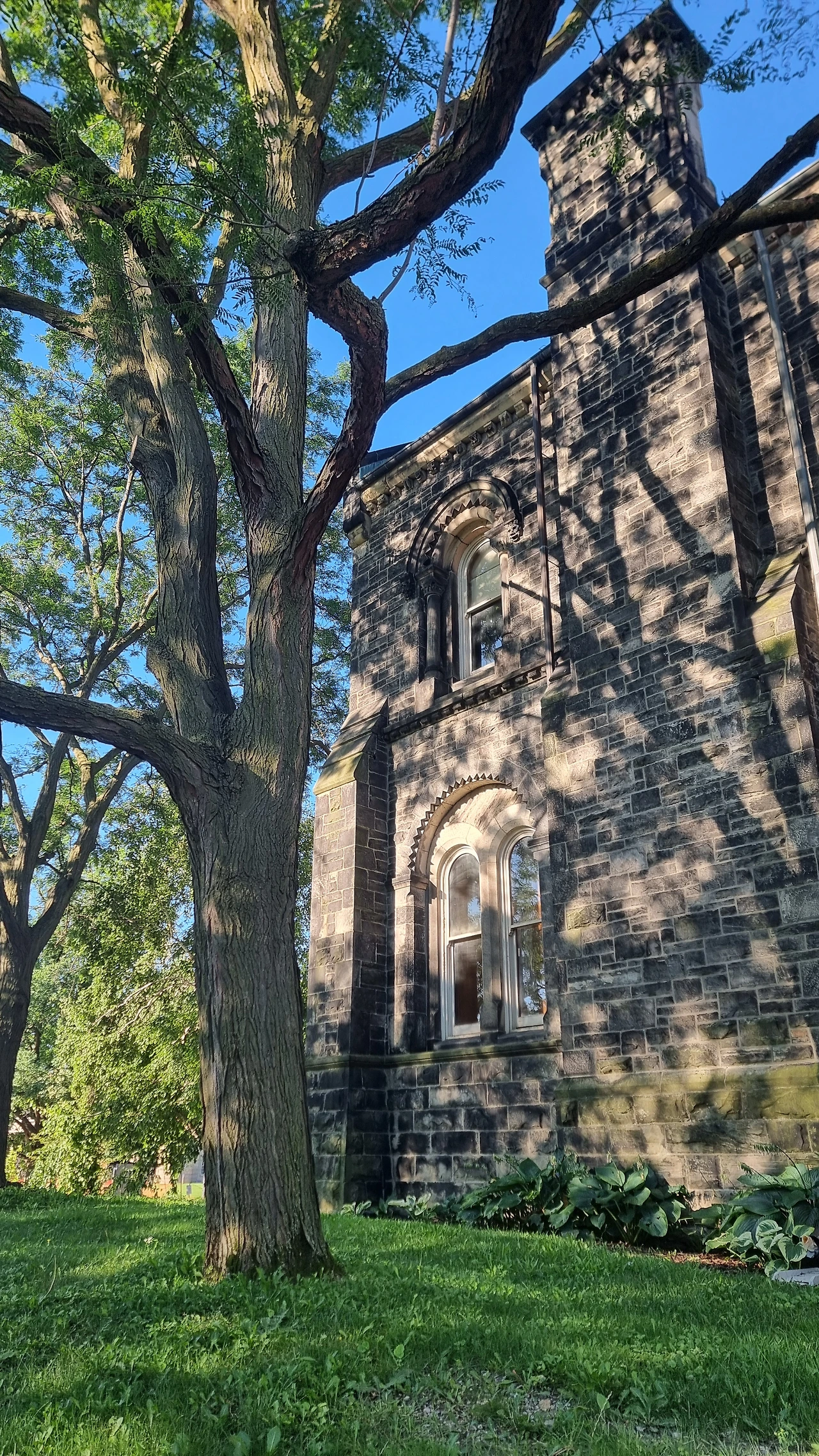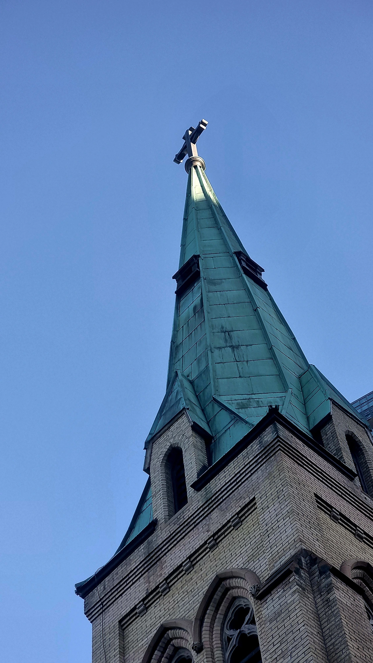 The gentle morning sun illuminates the cross atop the church roof. Thanks to Mother Nature..