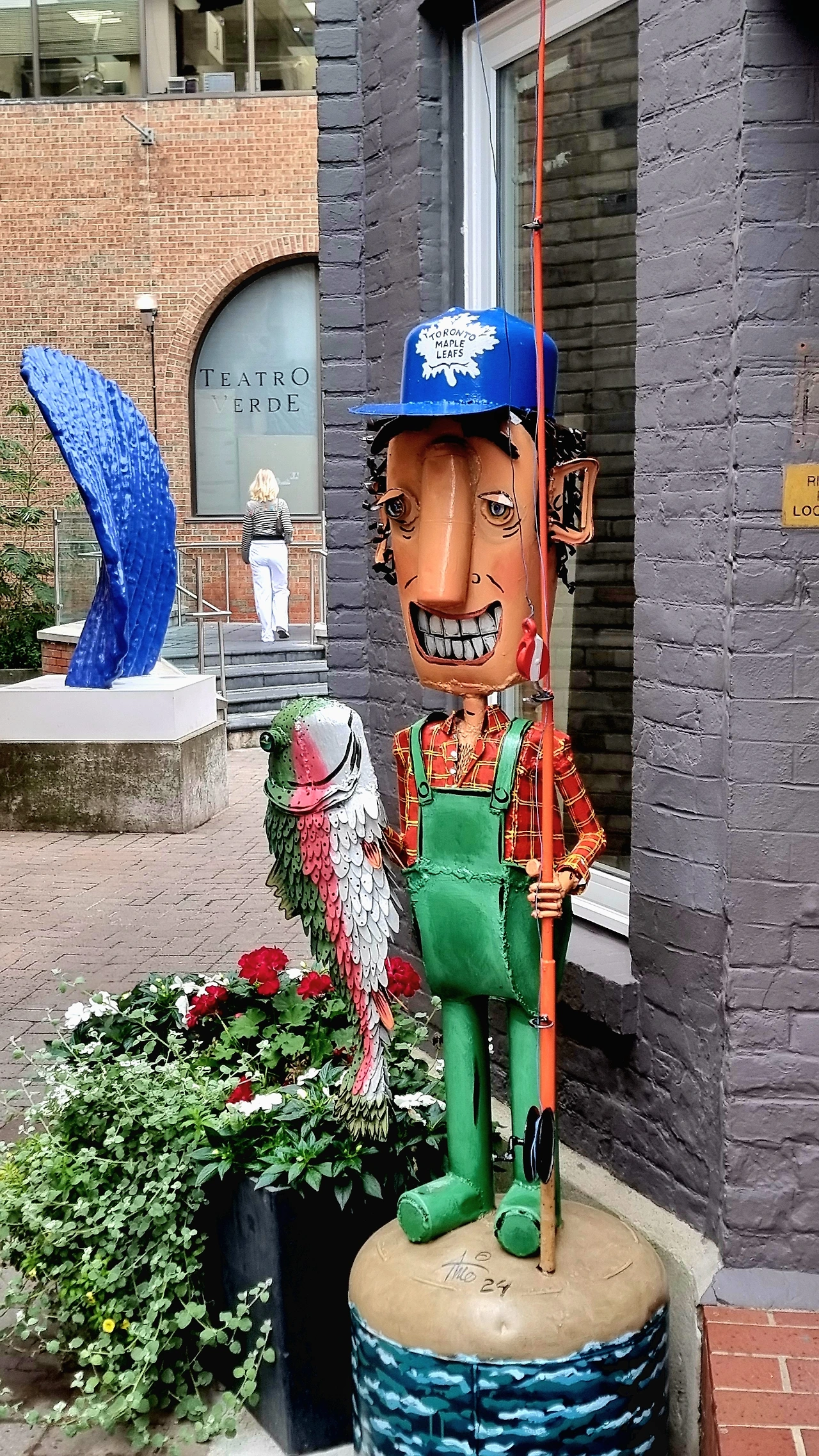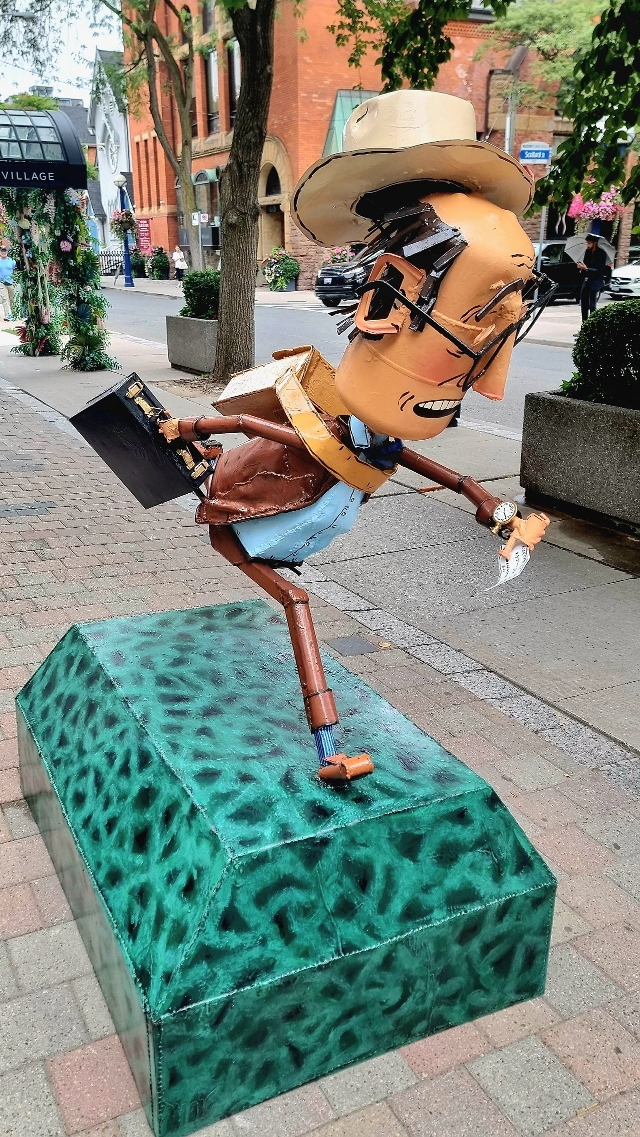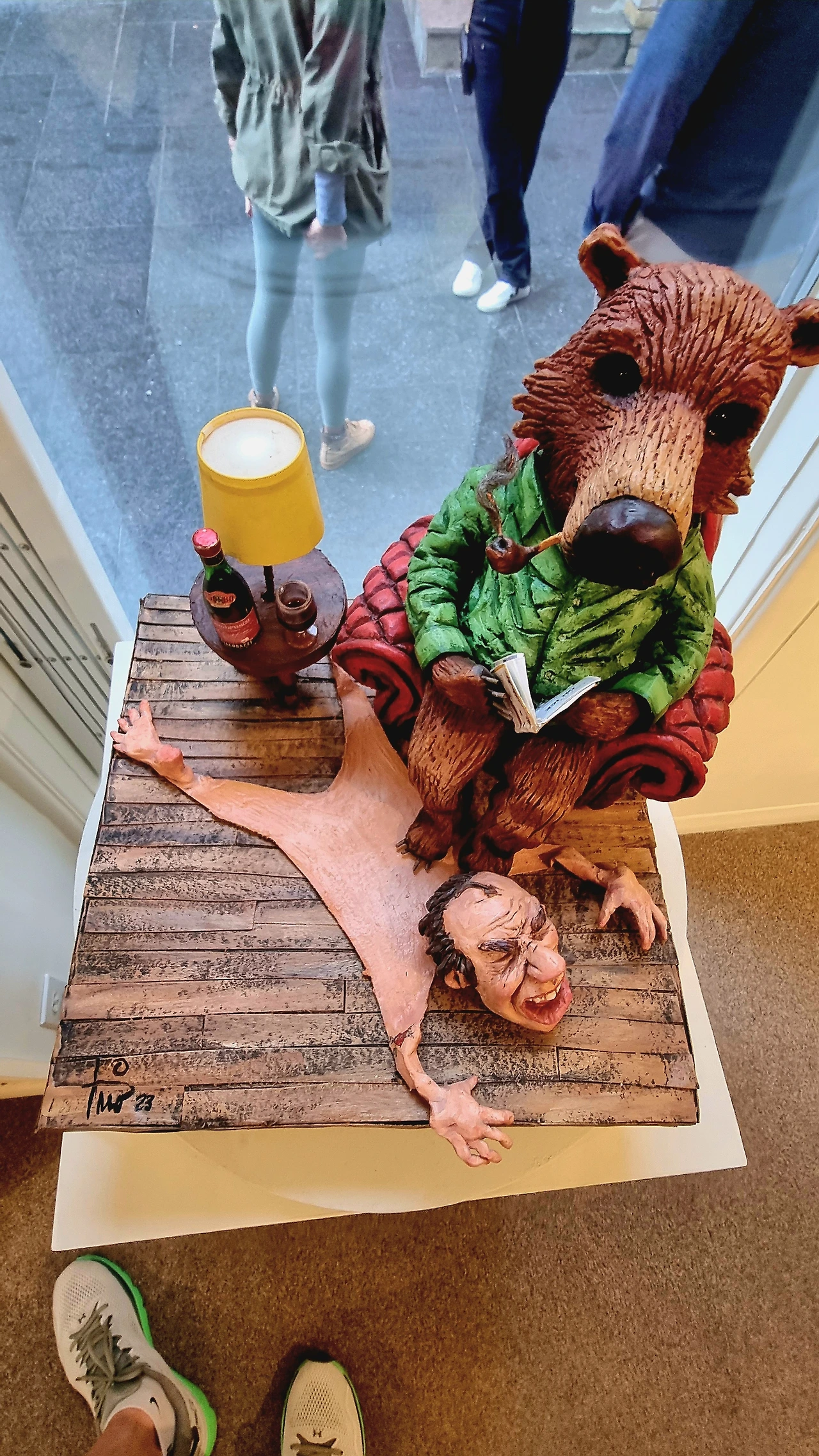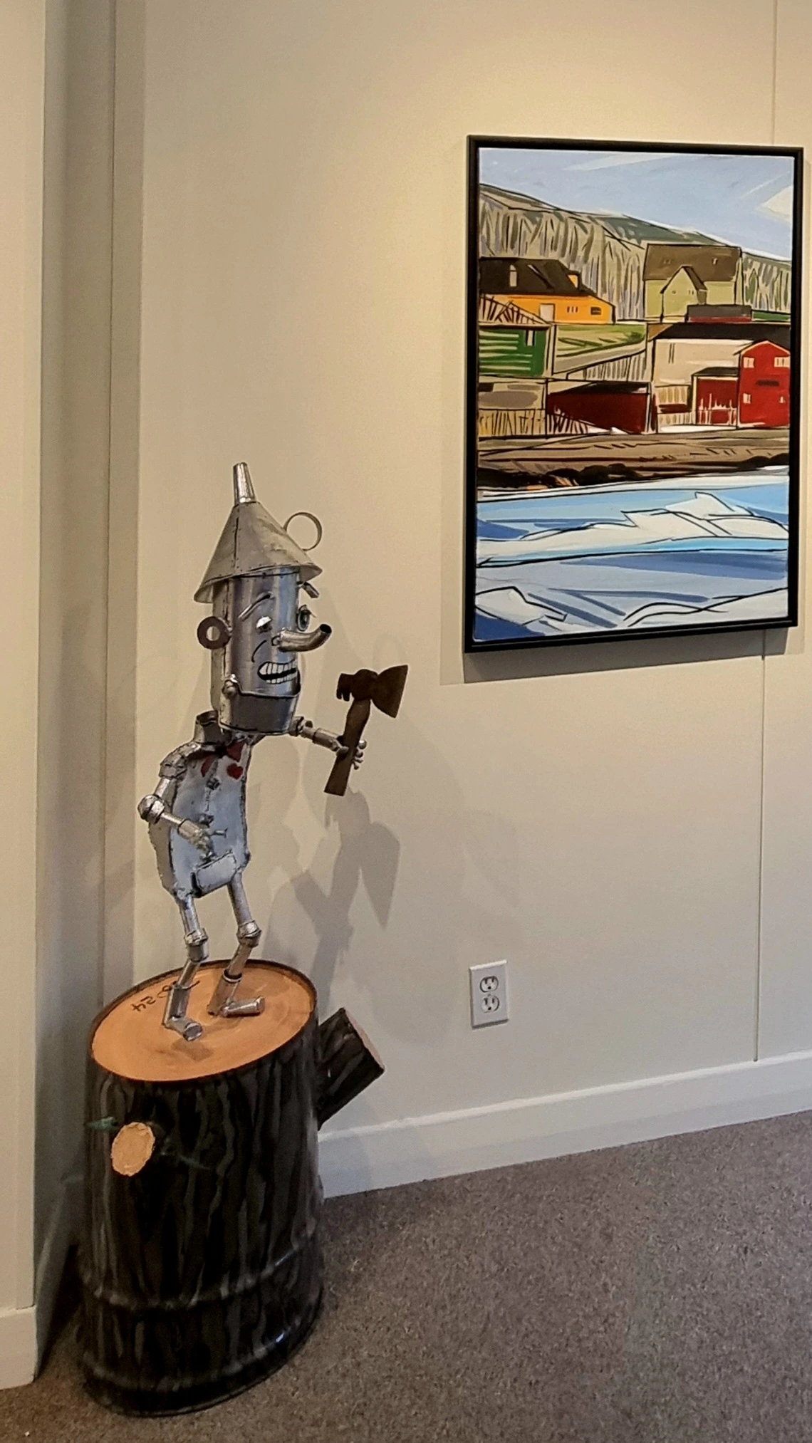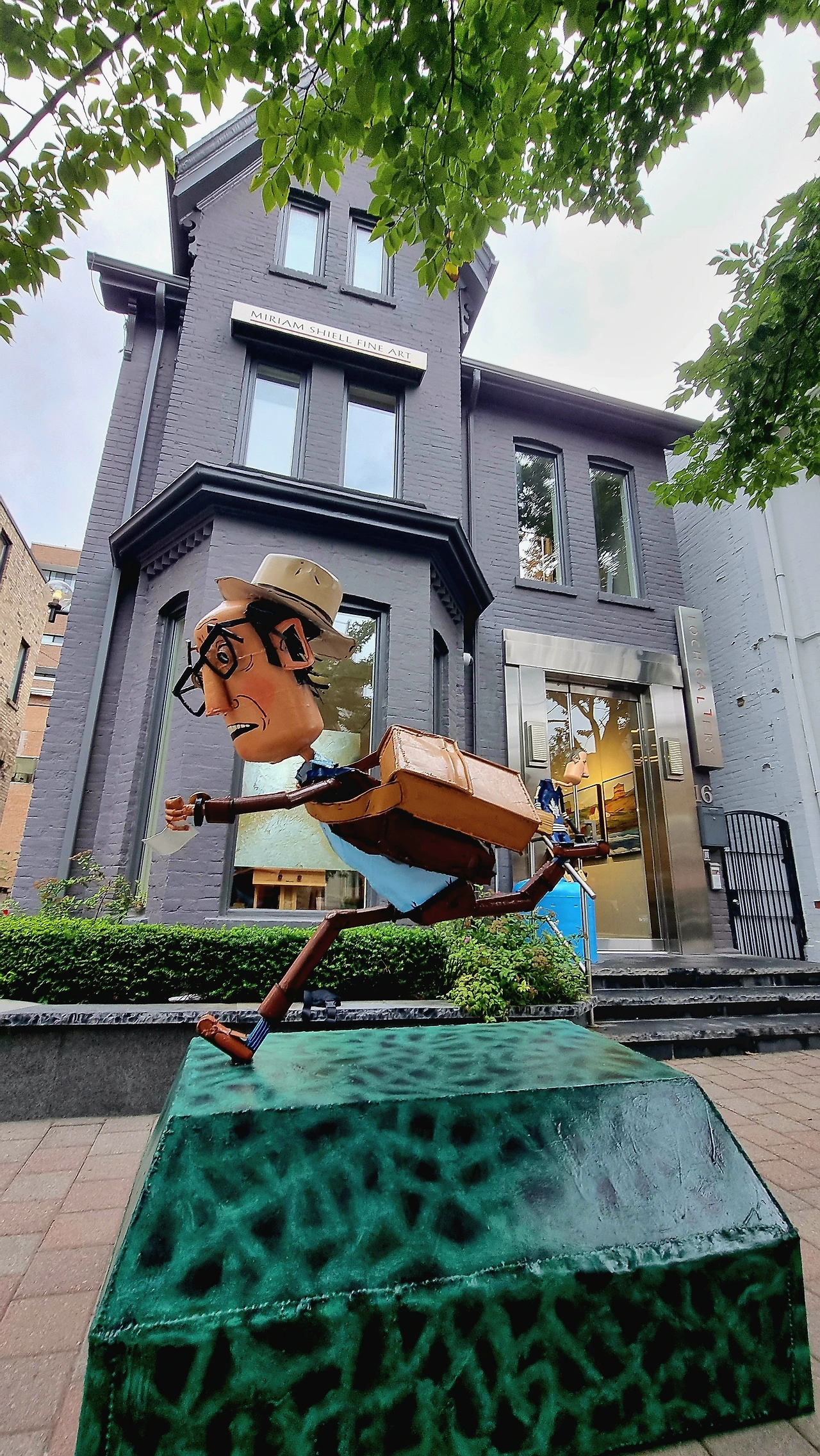 The space is dominated by the vibrant and humoresque sculptures of Patrick Amiot, a Quebec-born artist now residing in California. Amiot’s works, fashioned from steel or tin salvaged from junkyards or even landfills, stand out with their whimsical, larger-than-life characters. Each sculpture tells its own story, brought to life not only by Amiot’s masterful hands but also by the vivid colors and details added by his wife, who paints his creations.