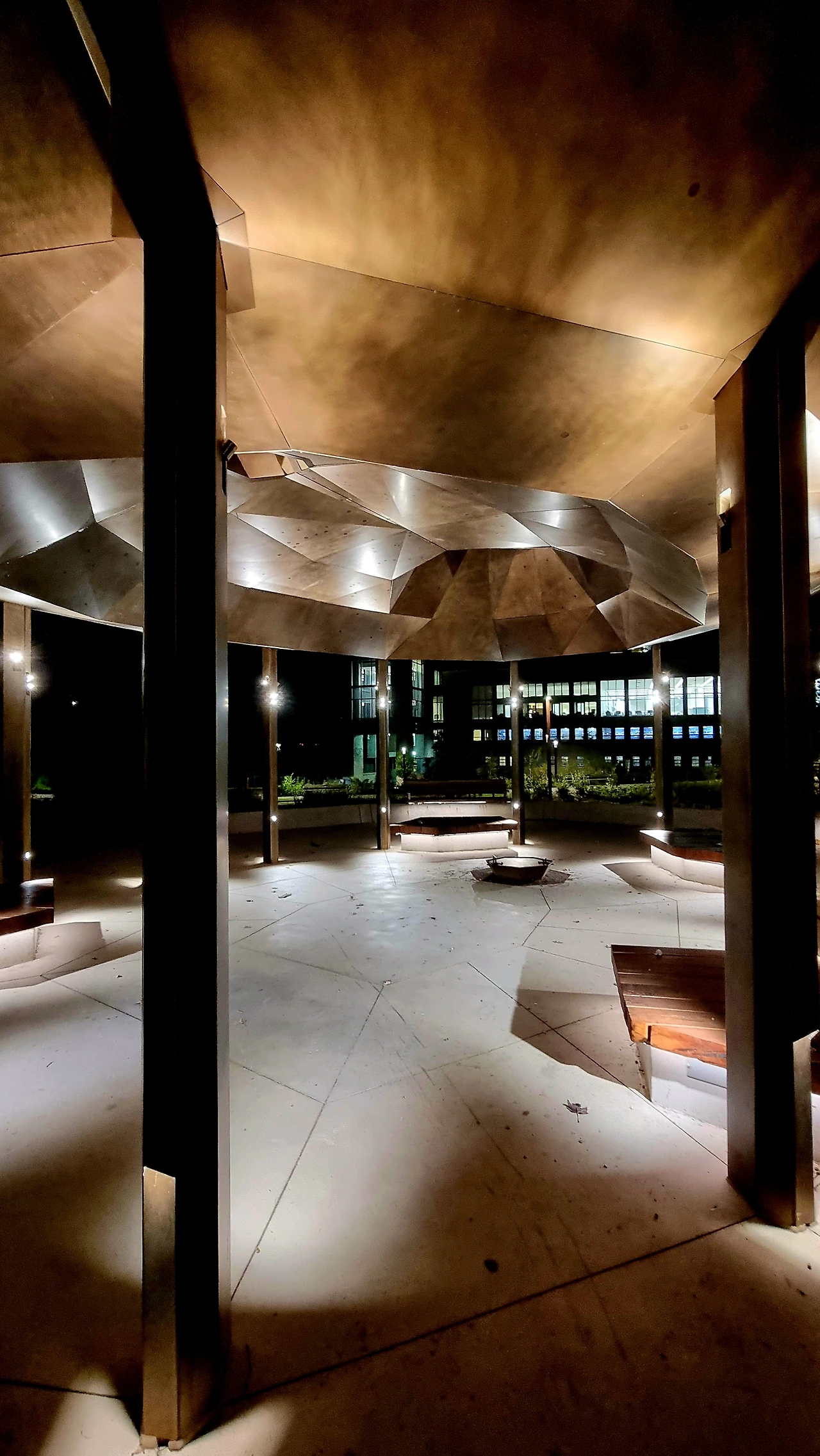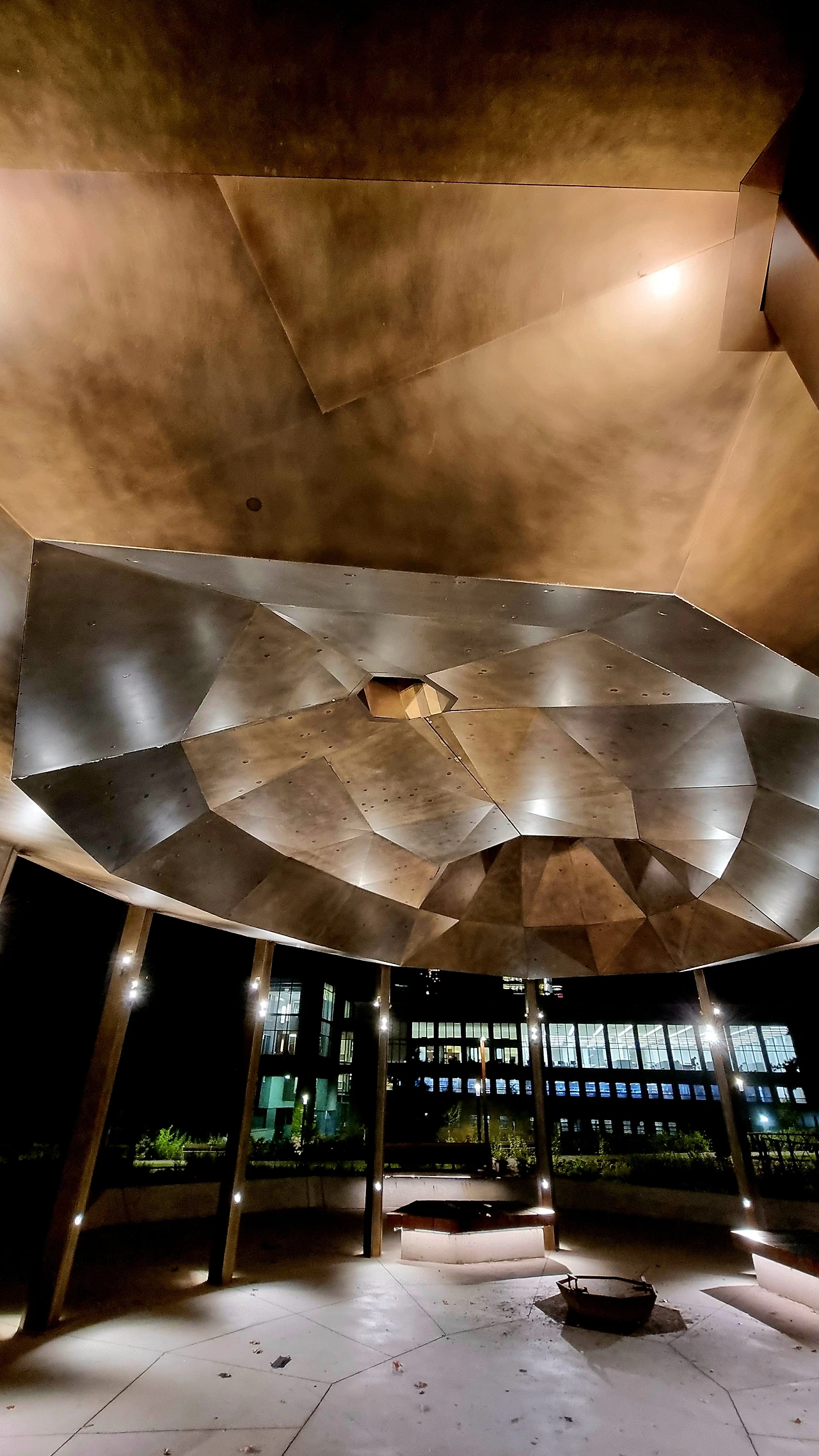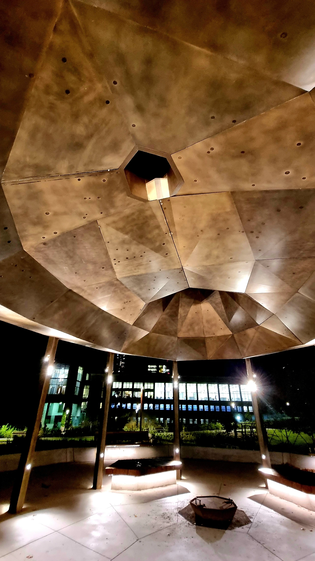 난 이곳 캠퍼스가 내 산책 중 거의 매일 지나는 곳이라 건축 process 를 누구보다 잘 알고 있었다. 지난 겨울부터 지어지기 시작한 이 건축물이 그저 전형적인 안정적 기하학적 계산에 따라 육각, 팔각, 혹은 원형등의 지붕에 볼품없는 두께의 기둥들이 늘어선 천편일률적 휴식 공간 일것이라 생각했지만 내 생각은 완전히 잘못된 것이었다. 난 토론토 대학의 안목을 제대로 파악하지 못하고 있었건 거다. ㅎ