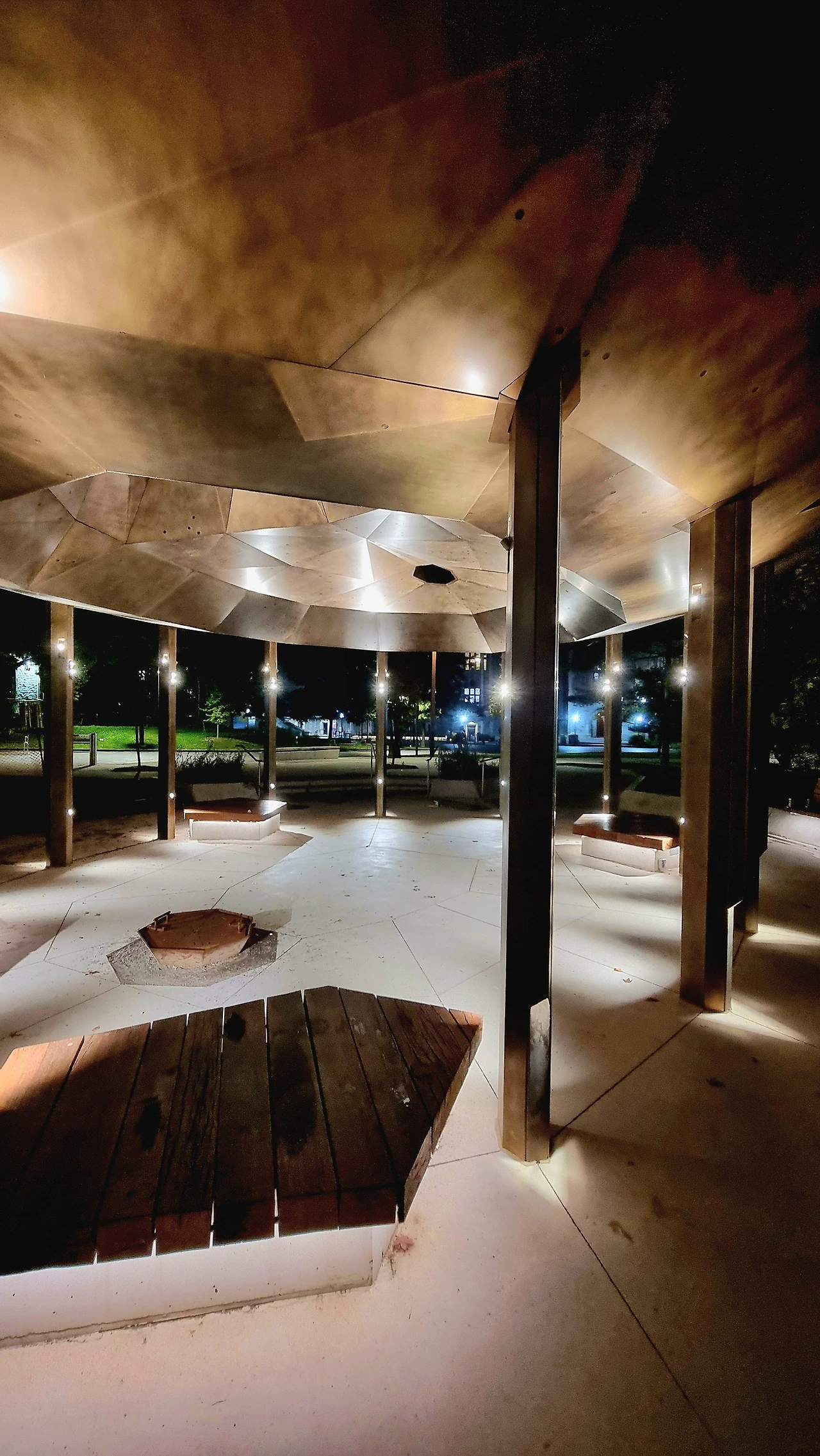 모닥불을 위한 fire place 위 지붕의 큰 구멍과 함께 타원형 지붕위 반대 대칭 지붕엔 작은 구멍을 만들어 놓았다. 모닥불에서 발생하는 연기가 작은 구멍으로 유입되는 찬 공기로 인해 휴식 공간내의 원활한 공기의 흐름을 만들어 주기위한 공기 역학적 설계인 셈이다.