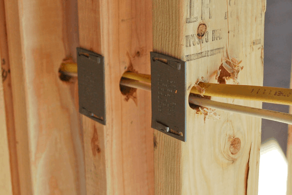 기둥을 가로질러 지나가는 전선은 기둥 내부에 구멍을 뚫고 나서 구멍이 지나가는 겉면에는 쇠로 만든 작은 판을 붙여서 드라이월 작업을 할 때나 작업이 끝난 후에라도 스크루나 드릴 작업을 하더라도 전선이 파손되지 않도록 보호판을 붙여야 한다.