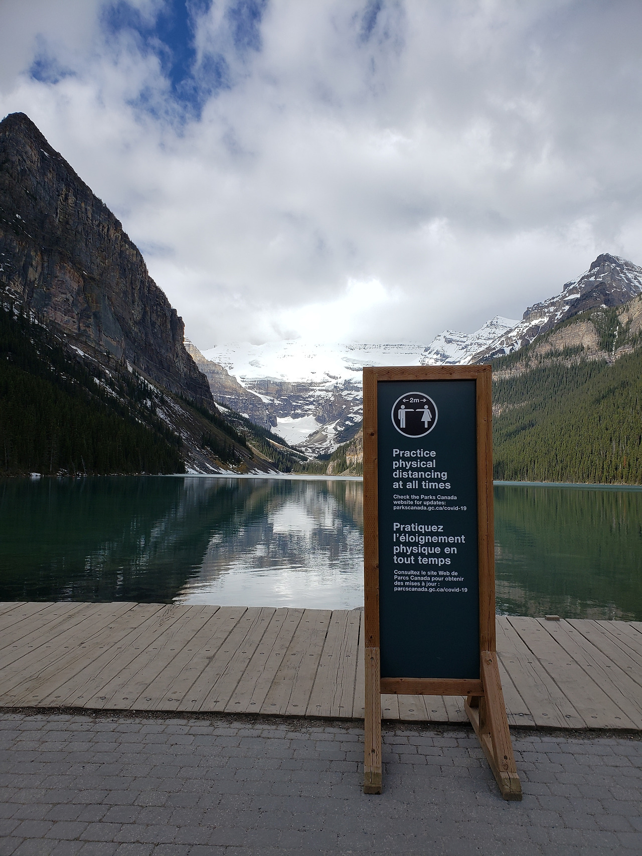 Lake Louise 호숫가에 설치되어 있는 COVID-19 상황에서의 사회적 거리두기 안내판