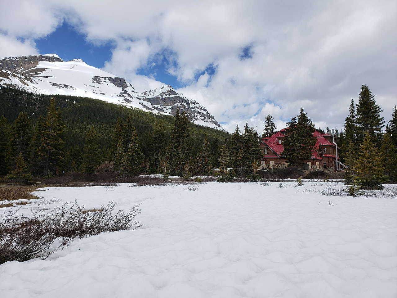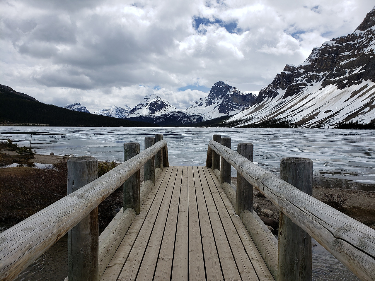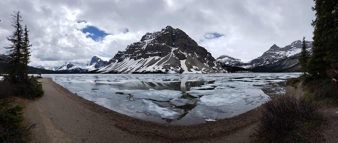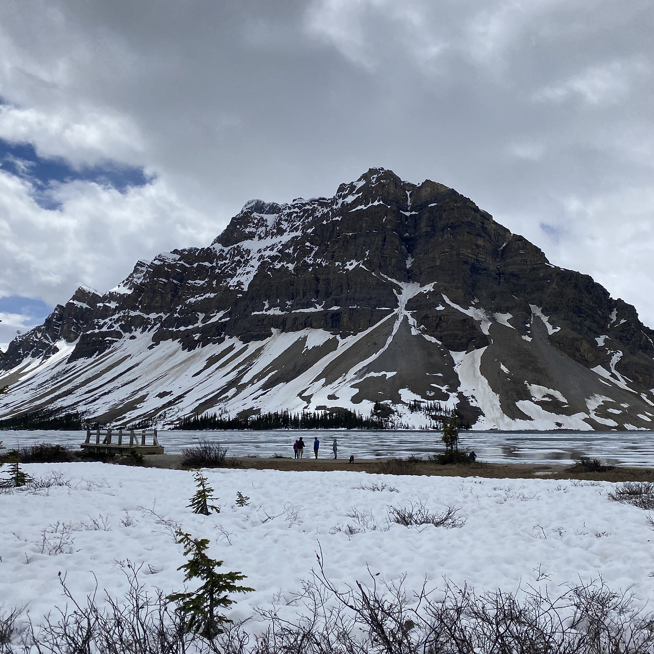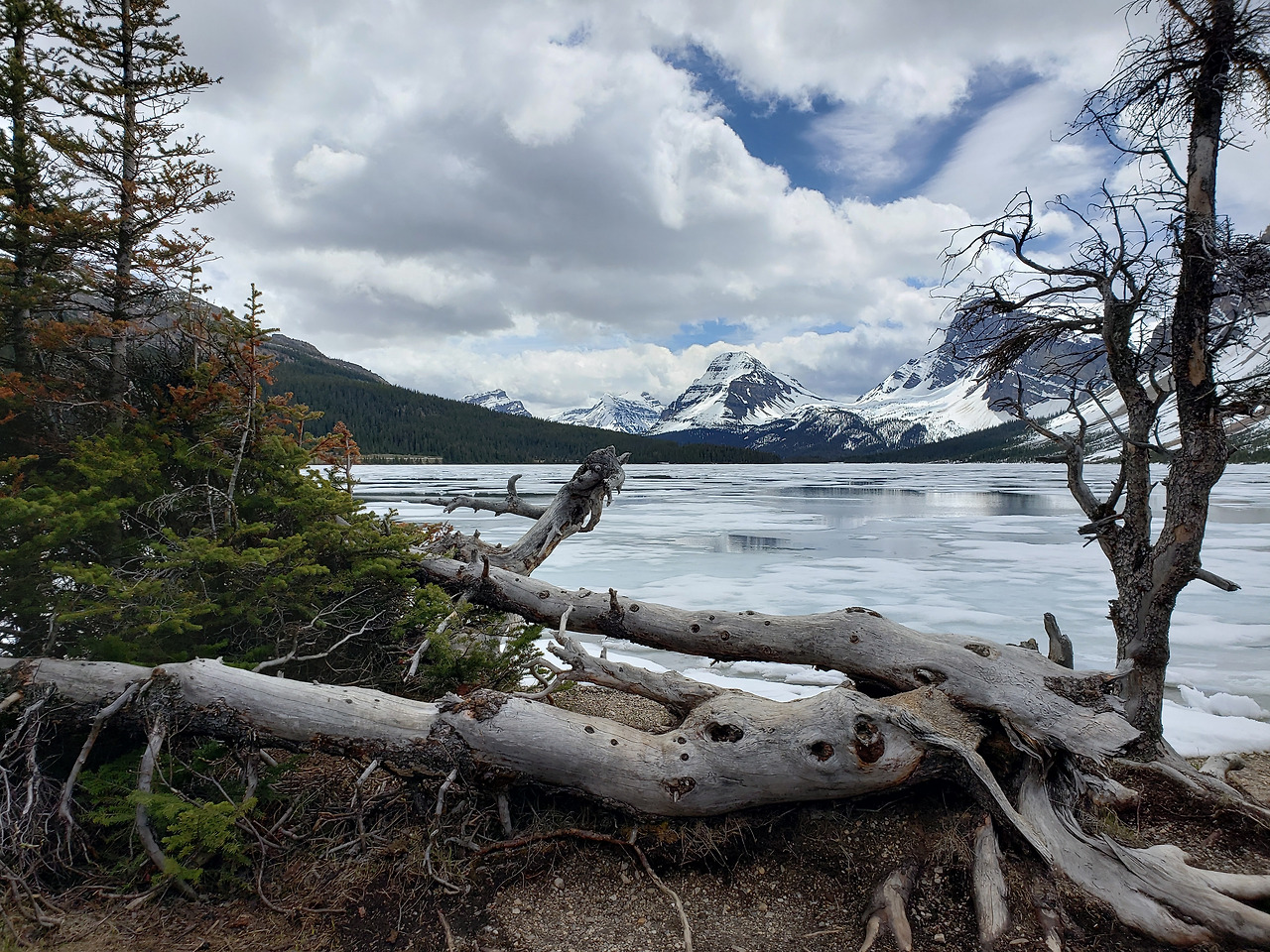 Bow Lake에 도착하고 보니 이곳은 Lake Louise 보다 더 많은 눈과 얼음이 남아 있다. 살아있는 록키의 느낌을 받아보라는 환영인사인지 우리가 호숫가에 도착하자마자 잠시 눈발이 날린다. 6월에 눈이라니... 이곳이 록키산 자락이라는 것을 잊지 말라는 의미로 하늘이 내려주시던 눈이 잠시 후 그친다.