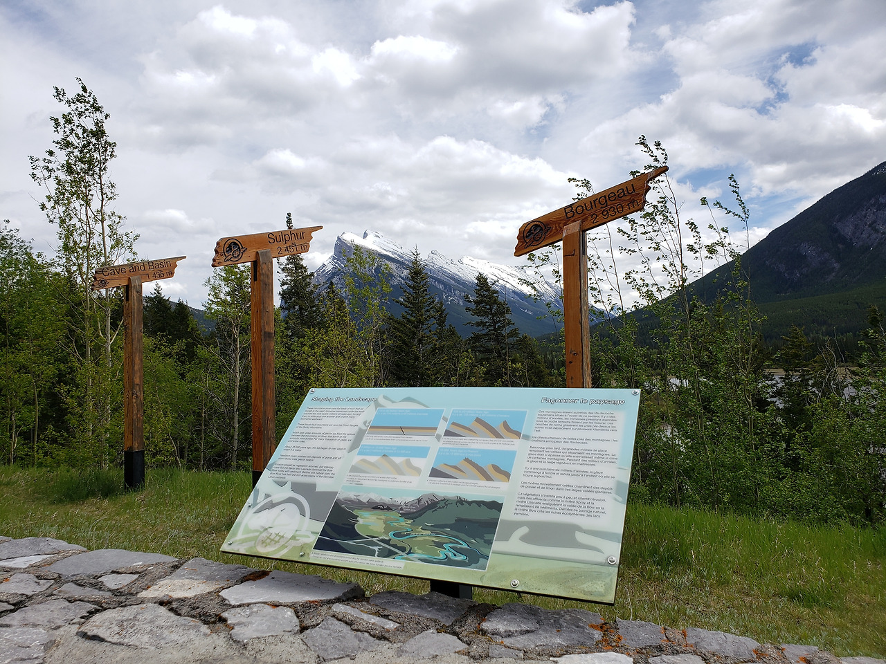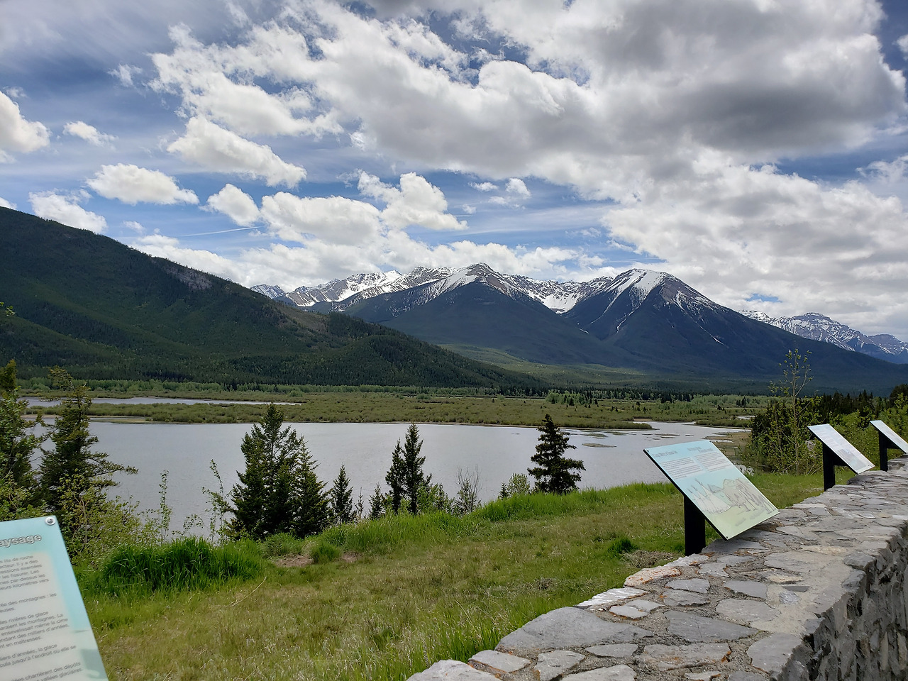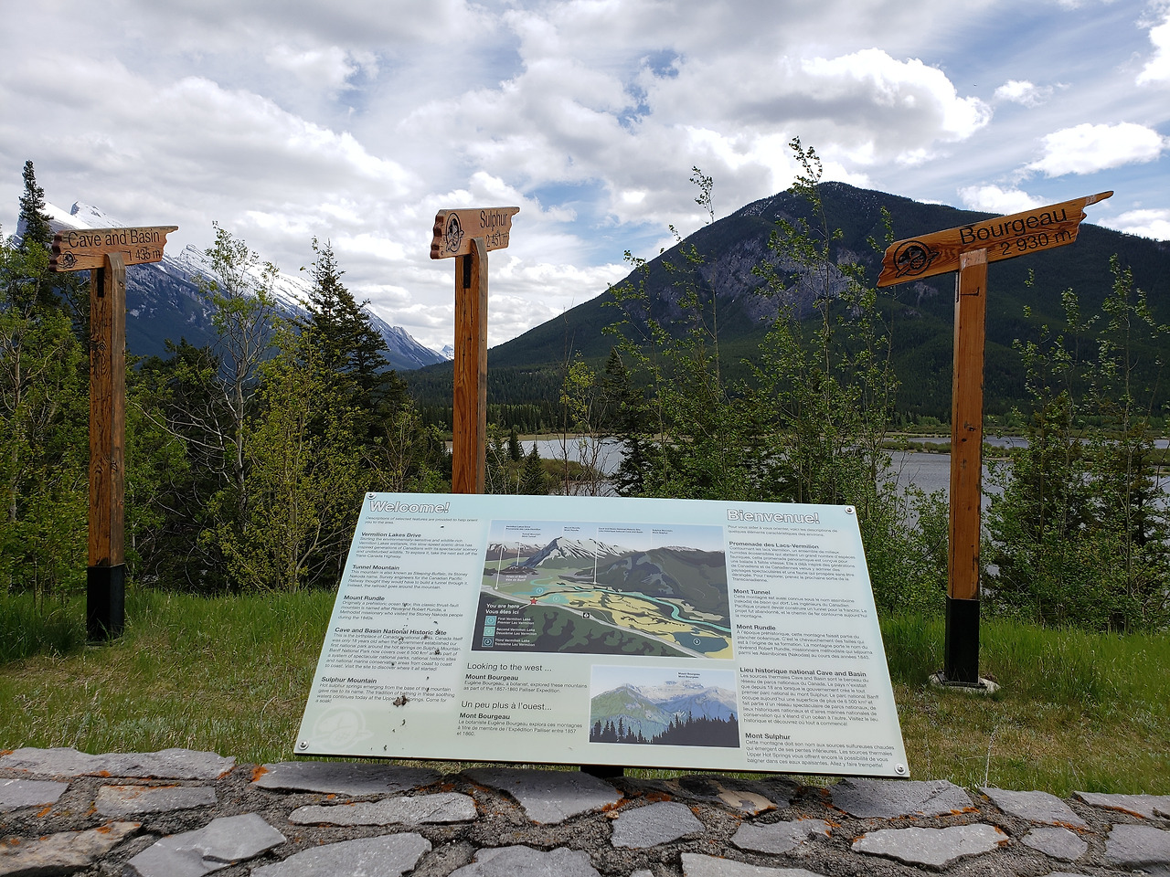 버밀리온 호수 전망대에서는 밴프 중심가 양쪽으로 솟아 있는 Rundle Mt. 와 Sulphur Mt. 를 볼 수 있다. 수백만 년 전부터 몇십만 년 전까지 지각의 변동으로 3000m 높이의 산이 경사가 생기고 지층이 형성된 내용을 자세히 설명해 놓은 안내문들이 늘어서 있다. 바로 앞에 펼쳐진 버밀리온 호수 옆으로 길게 나있는 도로에는 밴프 시내에서 자전거로 하이킹을 나온 사람들이 보인다.