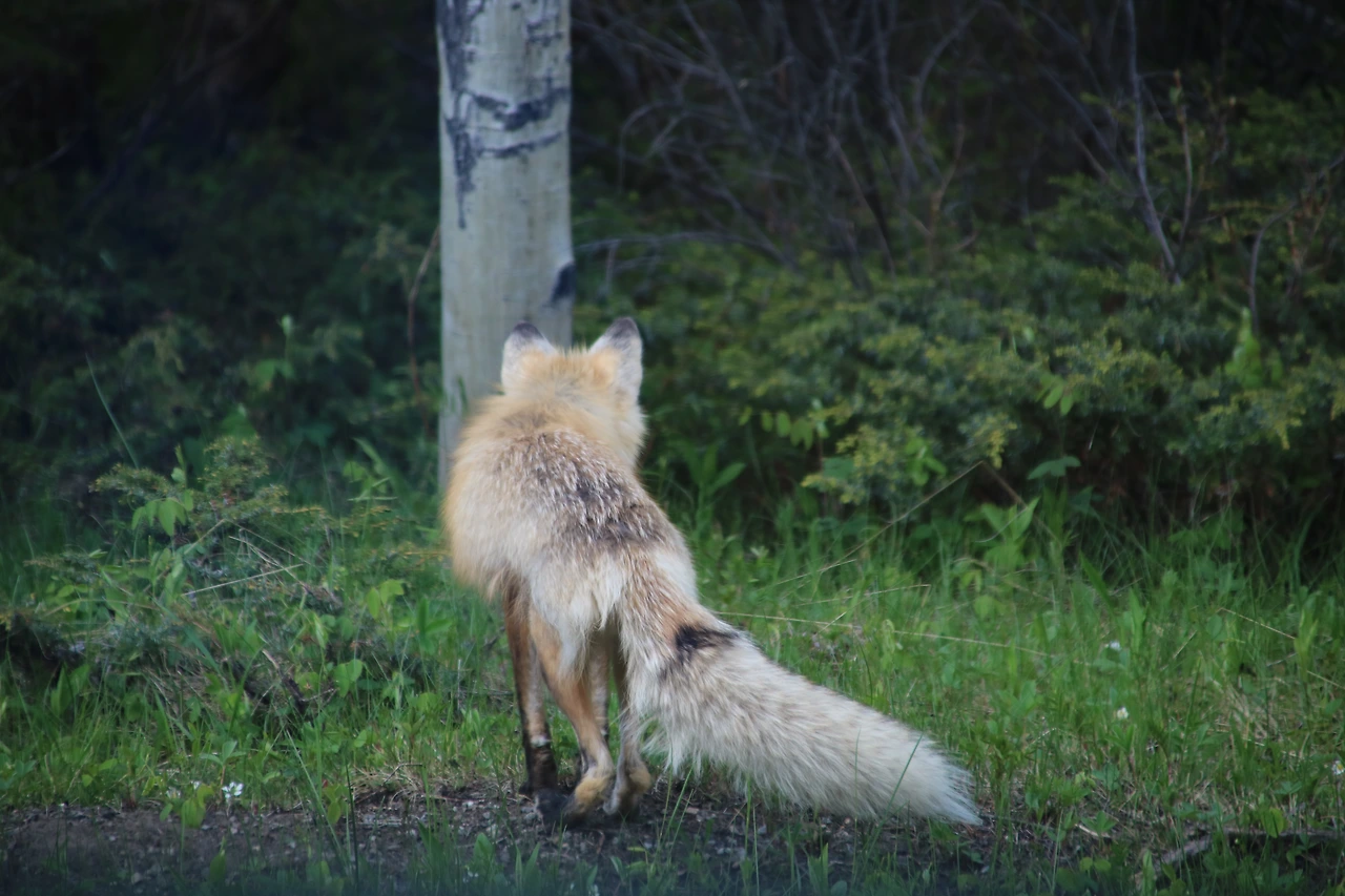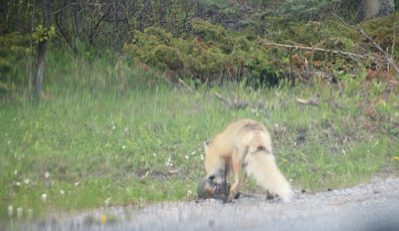 Tunnel mountain camp grounds옆으로 지나 도로를 따라 먹이를 물고 가는 여우를 발견했다. 역시 운이 좋은 조카 덕분에 새로운 야생의 모습을 만났다.여우가 다람쥐를 사냥해서 돌아가는 중인가 보다. 옆으로 지나가는 우리차는 신경도 안 쓴다. 다람쥐를 물고 가다가 새로운 먹잇감을 찾았는지 잠시 물고 있던 것을 내려놓고 길가 숲 속을 주시한다. 어떤 상황이 보일지 몰라 비상등을 켜놓은 채로 반대편 갓길에 차를 세우고 한참을 기다려 보았지만 한 발짝 두 발짝만 움직인 채로 한 군데만 주시하는 걸 보고 숲 속에서 먹잇감이 움직여주길 기다리는 것 같았다.