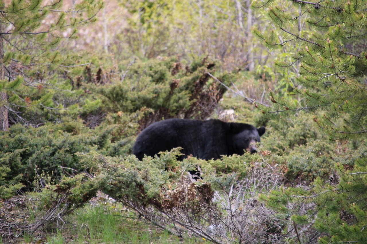 Icefield Parkway로 들어서자 얼마 가지 않아서 편도 1차선으로 길이 좁아진다. 조카에게 Jasper까지 계속 이동하는 것은 아니더라도 이제부터 전 세계인이 드라이브를 해보고 싶어 하는 Icefield Parkway에서 인생 샷을 남기려면 주변 경관도 둘러보고 혹시라도 야생동물이 나오는지 잘 살펴보라는 당부를 했다. 그 말을 꺼낸지 일분도 안 지나서 높지 않은 언덕 위에 검은 물체가 움직이는 것을 발견했다. 천천히 속도를 줄이면서 비상등을 켜고 차를 갓길로 세웠다. 검은색 털이 반짝이는 야생곰이다.