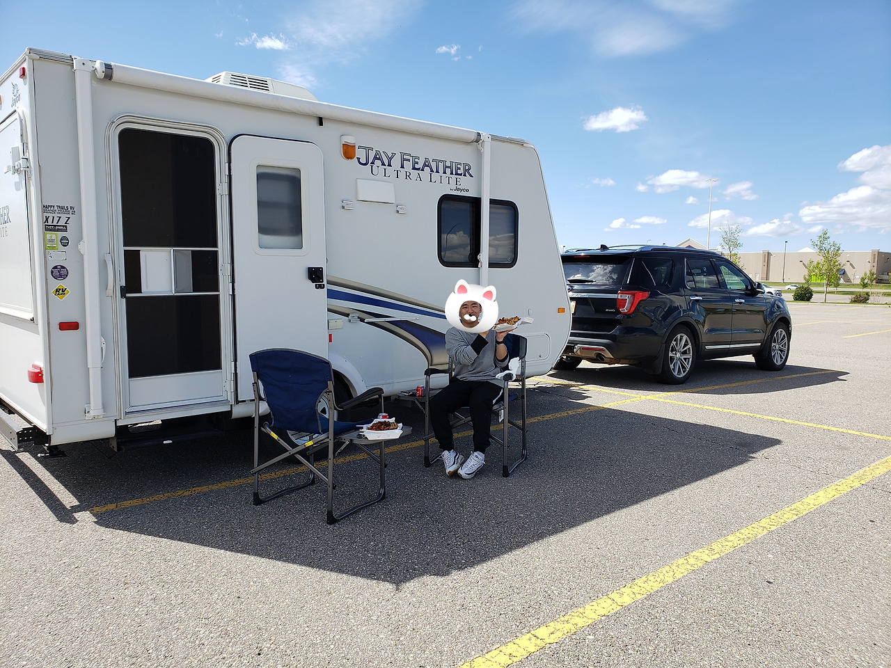 어느 정도 무게가 나가는 트레일러를 매달고 다니면 자동차 연료 주유를 자주해야 한다. Stoney trail을 이용해서 캘거리 북동쪽에 자리하고 있는 크로스 아이언 몰 옆에 있는 주유소에 들러 주유를 하고 나서 보니 팬데믹때문에 문을 닫아서 영업을 하지 않을 것으로 생각했던 쇼핑몰에 사람들이 드나드는 것이 보였다. 캘거리에 확진자가 줄어들면서 경계수위를 조정하고 대형몰도 오픈을 결정한 모양이다. 출출하던 참에 몰 안에도 둘러보고 푸드코트에서 간단한 먹거리를 사서먹을 생각에 마스크를 쓰고 안으로 들어갔다. 쇼핑몰 안에 매장들은 아직도 열지 않은 곳이 많이 보였다. 조카는 아이언 쇼핑몰이 한국의 아웃렛과 비슷한 것 같다면서 푸드코트로 가는 길에 매장들을 구경하며 갔다. 쇼핑몰 안 푸드코트가 보여 음식을 고르다가 타이음식으로 주문하고 테이크 아웃으로 받아서 트레일러로 돌아와 의자를 꺼내서 펴고 앉아 도시락을 열었다. 도시락도 좋았지만 한적한 주차장에서 의자를 펴고 앉아서 음식을 먹는 것도 여행의 재미가 된다.