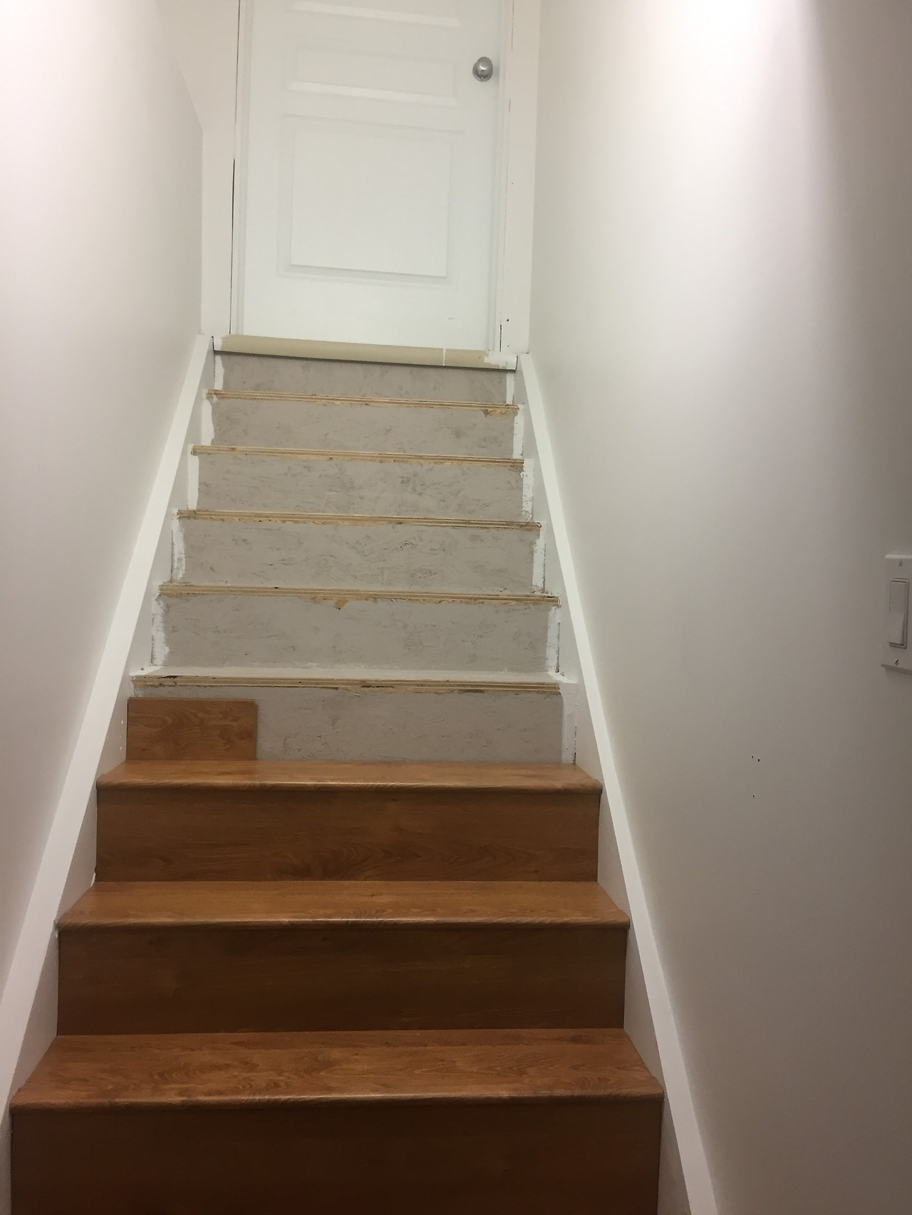 마지막으로 계단에 마루를 까는 작업이 까다로웠다. 마루 한 장으로는 다 덮을 수가 없고 두장은 너무 넓은 폭이라서 두 번째 이어지는 마루를 한 계단씩 사이즈에 맞게 가로방향으로 길게 잘라서 이어준 다음 계단턱에서 미끄러지는 것을 방지해주는 쫄대를 붙여야 하는데 처음 집을 지을 때 일반 외부용 자재로 설치해 놓았던 거친 목재로 덧대놓은 계단 턱을 소형 전동톱으로 제거하는 작업이 선행되어야 했다. 전동톱으로나무를 절단하는 동안 집진 주머니를 연결한 홀에 진공청소기를 붙여서 빨아들여서 톱밥과 먼지를 해결할 수 있었다.