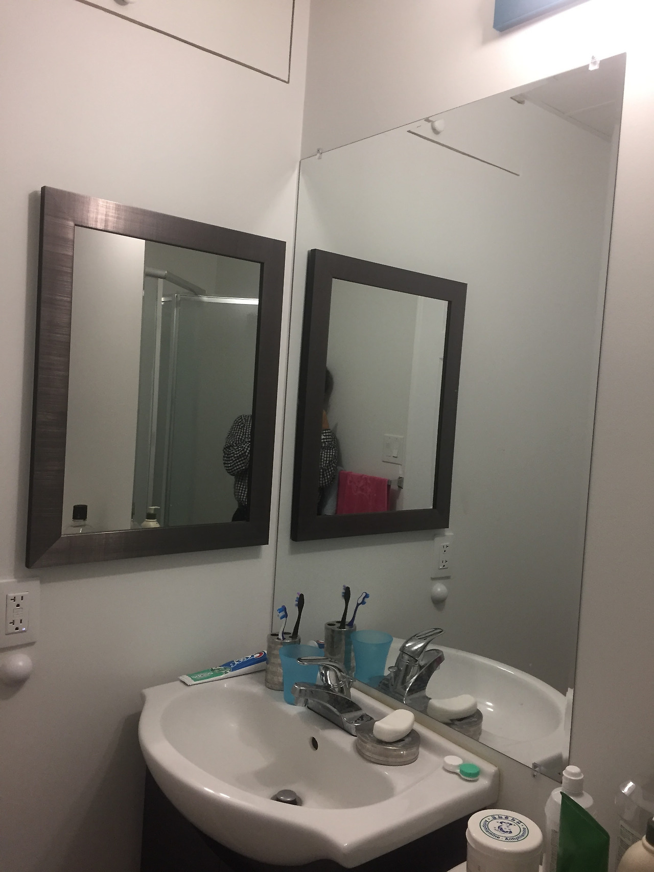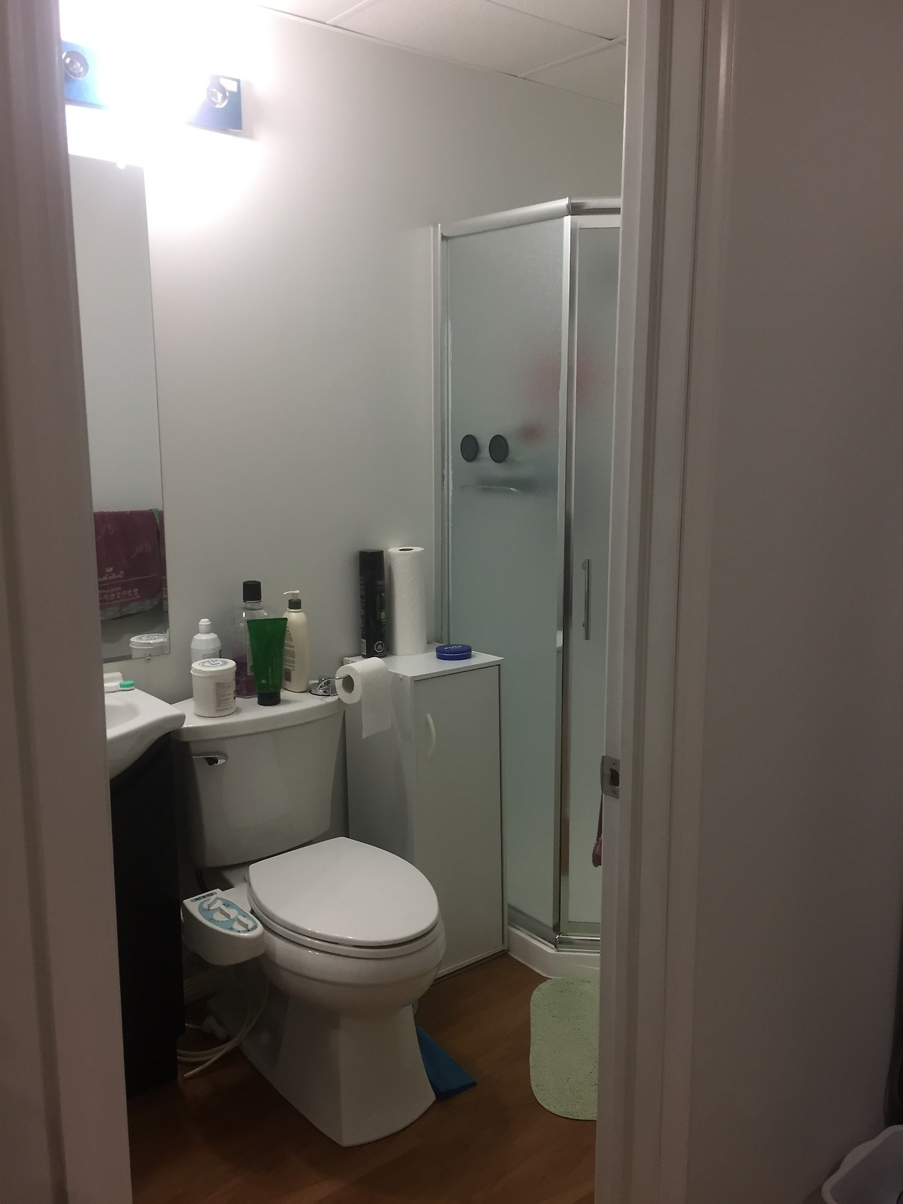 화장실 내부에는 거울과 세면대를 설치하고 변기를 앉히고 샤워부스를 설치했다. 화장실은 안쪽부터 샤워부스 베이스를 제일 먼저 바닥에 고정한다. 이때 샤워 베이스의 배수구에 하수관을 정확하게 맞춰야 누수없이 사용할 수 있다. 그리고 샤워부스 문과 유리벽을 세우는 과정은 샤워부스 문을 중심으로 양쪽 벽에 스테인리스 몰딩을 볼트로 고정하고 출입문과 연결되는 유리벽을 끼워서 흔들리지 않도록 단단하게 고정해야 한다.
