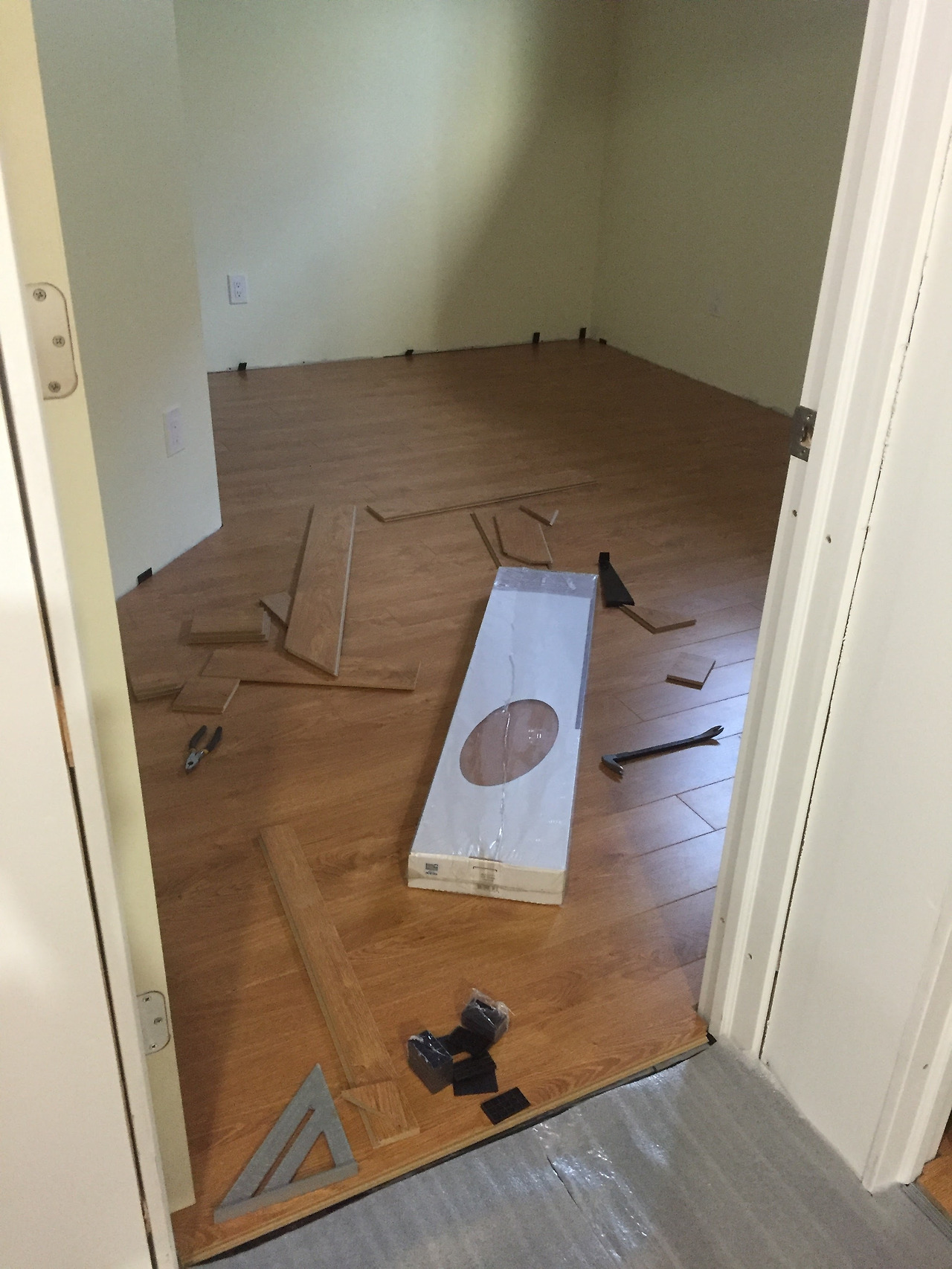 바닥에 마루를 까는 것은 시멘트 바닥에 방수용 비닐커버와 단열재를 설치하고 마루를 시공하면 완성이다. 우리 집 지하실 바닥은 시멘트로 평탄 작업을 매끈하게 해 놓아서 맨발로 다녀도 괜찮을 정도였지만 수평계를 대보면 중간에 들어간 부분도 있고 양쪽 끝 부분이 높이가 조금씩 차이가 나는 부분도 있어서 중간중간 단열재를 겹으로 더 깔고 작업을 해야 했다. 방문으로 사용할 공간을 남기고 양쪽에 기둥을 세워 놓은 부분이 양쪽 높이가 달라서 방문 작업을 할 때 문짝을 떼고 뒤집어서 문의 바닥 부분을 대패로 조금씩 깎아 맞추기도 했다.