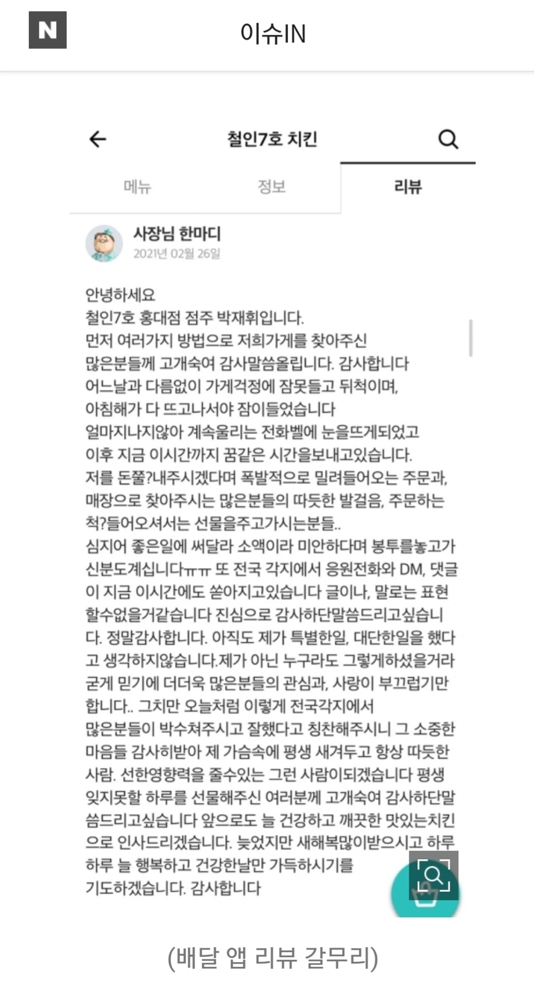 안구 건조증이 심해졌다고 안과 의사에게 처방을 받은 게 며칠 전인데 눈물이 샘솟듯 흘러내린다. 안타까운 상황에 놓인 형제도 마음이 쓰이지만 그런 사람을 지나치지 않고 작은 마음이라도 베풀어 준 치킨집 사장님이라는 분이 너무 고마워서 눈물이 난다.