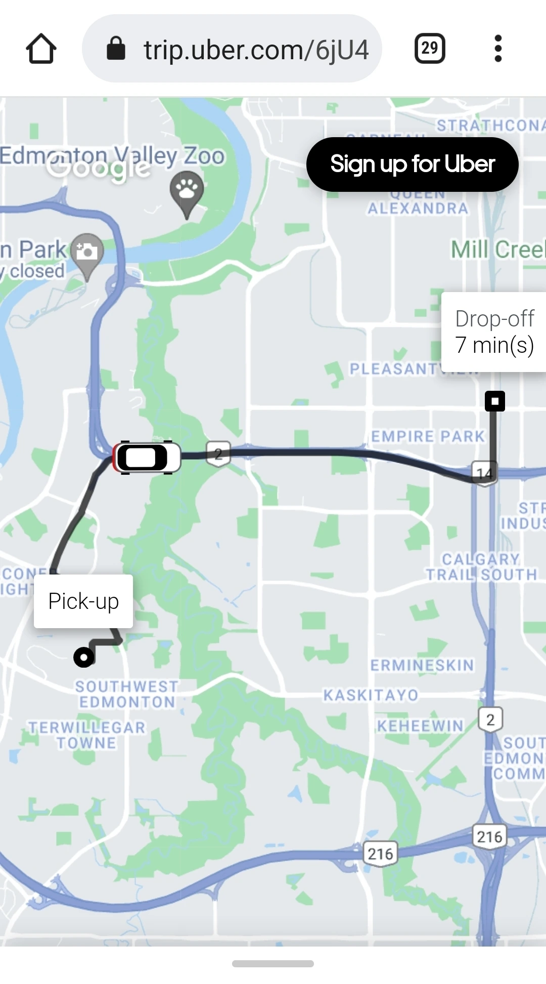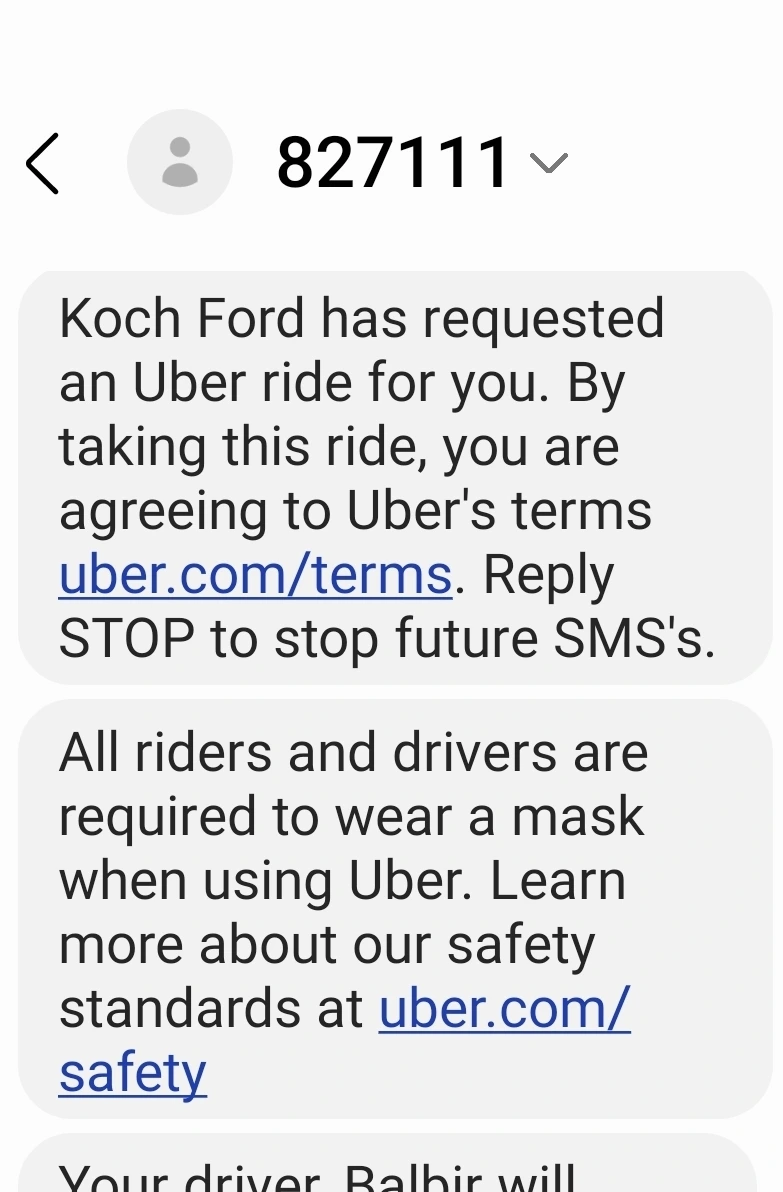 Uber에서 텍스트 메시지가 들어온다. 5분 후에 니싼 알티마를 운전하는 발버라는 운전기사가 집까지 모시고 갈 거라는 문자다.