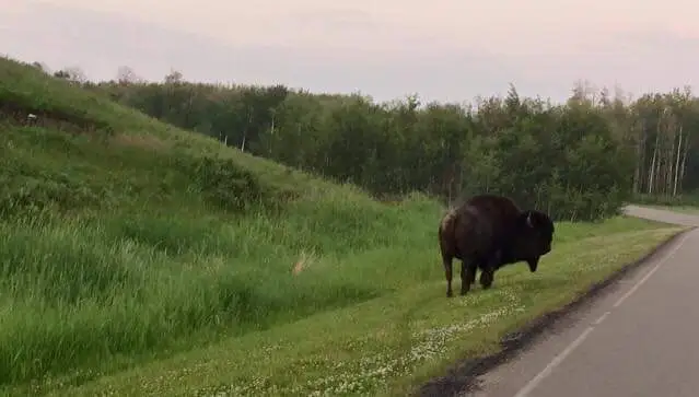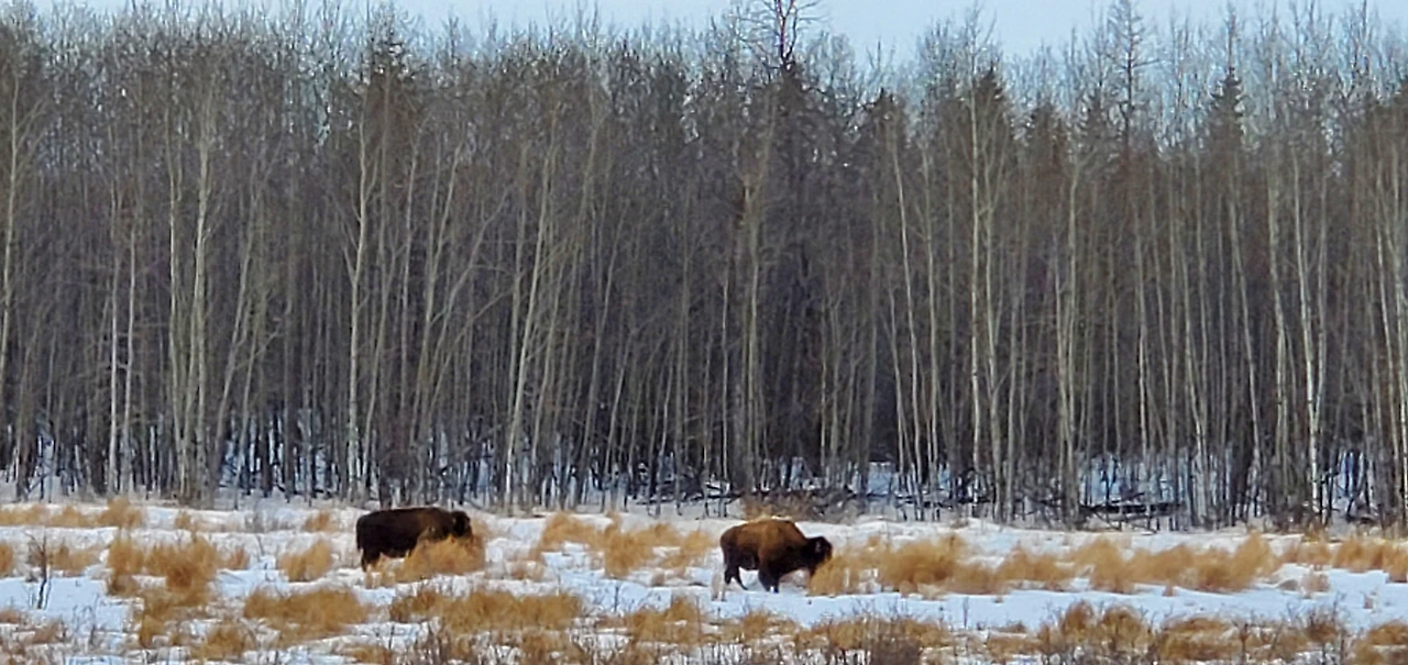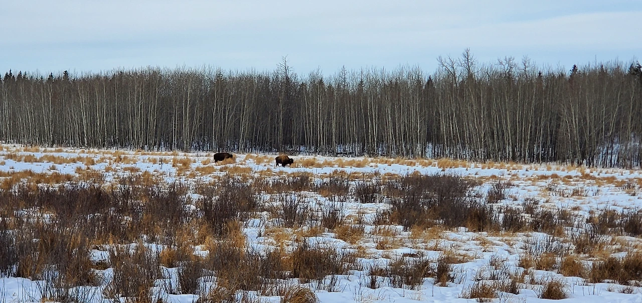 한두 해 전에 이곳에서 40 ~50마리 정도의 바이슨 무리를 본 적이 있는데, 무리를 벗어난 바이슨 몇 마리가 먹이를 찾는 모습인듯하다. 이곳 캐나다인들은 영하 15도의 날씨는 그렇게 춥다고 하지 않지만, 들판의 동물들이 눈밭을 돌아다니며 먹이를 찾는 것은 생존의 문제이기 때문에 어서 날씨가 풀려서 꽁꽁 언 땅을 헤치고 새순들이 올라와 바이슨들이 마음 놓고 먹이를 찾을 수 있으면 좋겠다는 생각을 잠시 해본다.