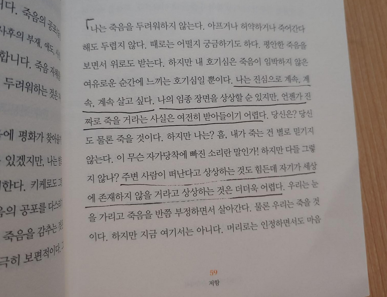 나는 죽음을 두려워하지 않는다. 아프거나 허약하거나 죽어간다 해도 두렵지 않다. 때로는 어떨지 궁금하기도 하다. 평안한 죽음을 보면서 위로도 받는다. 하지만 내 호기심은 죽음이 임박하지 않은 여유로운 순간에 느끼는 호기심일 뿐이다. 나는 진심으로 계속, 계속, 계속 살고 싶다. 나의 임종 장면을 상상할 순 있지만, 언젠가 진짜로 죽을 거라는 사실은 여전히 받아들이기 어렵다. 당신은? 당신도 물론 죽을 것이다. 하지만 나는? 흠, 내가 죽는 건 별로 믿기지 않는다. 이 무슨 자가당착에 빠진 소리란 말인가! 하지만 다들 그렇지 않나? 주변 사람이 떠난다고 상상하는 것도 힘든데 자기가 세상에 존재하지 않을 거라고 상상하는 것은 더더욱 어렵다.