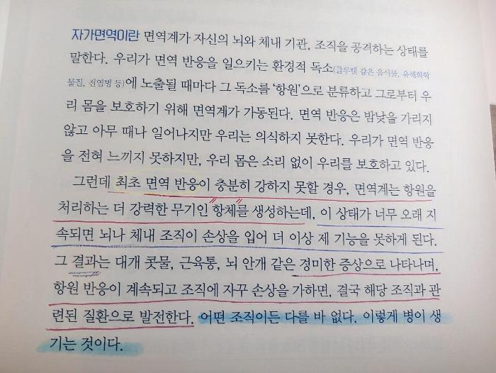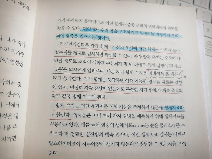 자가면역질환은 자가 항체-자신의 조직에 대한 항체-수치가 높아졌는지를 제대로 검사하면 확인할 수 있다. 자가 항체 수치는 증상이 나타날 정도로 조직이 심하게 손상되기 몇 년 전에도 특정 질병이 '자라고 있음'을 의사에게 알려준다. 나는 자가 항체 수치를 미래에서 온 메신저라고 생각한다. 자가 항체는 등장하면 예측 가능한 경로를 따르는 경향이 있어, 여전히 자각 증상이 없는데도 특정한 자가 항체가 계속 축적되다가 결국 병에 이르게 된다. -<당신은 뇌를 고칠 수 있다>, 165p.