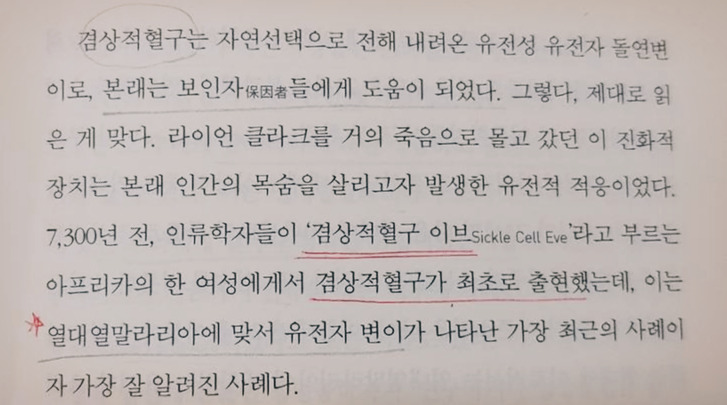 겸상적혈구의 출현은 약 8천 년 전, 아프리카의 반투족 농부들은 농경을 확장해가는 과정에서 발생했다. 곤히 잠자고 있던 흡혈귀 같은 열대열말라리아를 깨워버린 것이다. 인간의 유전자도 이로부터 단 700여 년 만에 곧장 진화적 맞대응에 나섰다. 헤모글로빈에 무작위로 돌연변이가 나타나 적혈구가 초승달 모양을 띄게 된 것이다.