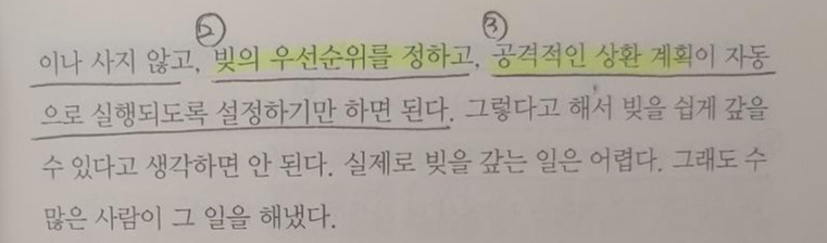 문제는 그것이 의도한 것이 아니라는 점이다.나는 그냥 마음 내키는 대로 돈을 썼을 뿐이다.의도했다면 조금 더 공격적으로 할 수 있었다. 지출 내역을 세밀하게 파악하고 좀 더 계획적으로 쓸 수 있었다. 예를 들면 주택담보대출을 계약 조건에 맞춰서 수동적으로 상환하는 것이 아니라 추가금을 더 내서 더 빨리 갚는 방법을 고민해보았을 것이다. 신용카드를 만들 때 신중하게 선택하고, (카드가 너무 많아서 감당이 안 된다면 해지하되) 기본적인 카드는 최대한 오래 카드를 유지하는 것이 나의 신용에 도움이 된다는 것을 아는 것이다. (카드 빚이 없고 제 때 결제할 수 있는 경우) 카드 이용한도를 늘리면 신용 활용률이 낮춰진다는 것을 아는 것이다.