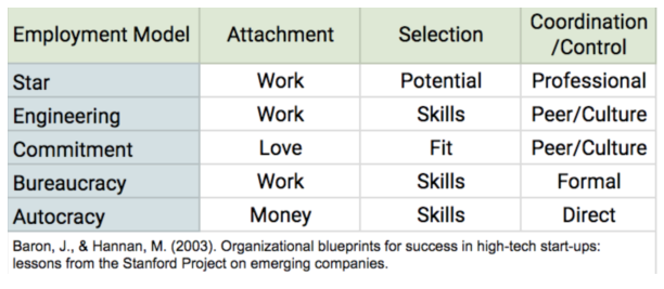 3) 헌신형 (Commitment model) : 회사가 표방하는 가치, 규범과 어울리는 사람들을 최우선으로 고용