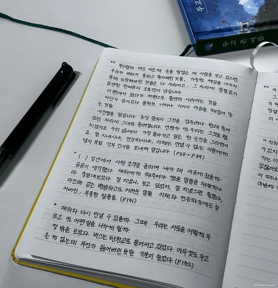 성해나 작가는 제15회 젊은 작가상 수상작, <혼모노>의 저자이기도 하다. 작년에 읽었던 기억이 나서 필사 노트를 뒤적여봤는데 그다지 인상 깊은 작품은 아니었던지 소설에 관한 기록은 없고, 대신 저자의 말인 <작가 노트>를 필사해 놓은 부분이 있었다. "'흐르다'라는 말이 좋다. 움켜쥐고 붙잡아두는 것도 좋지만 가끔은 (아니 꽤 자주) 그저 흐르도록 내버려 두고 싶다. 그렇게 흐르다 보면 슬픔이 기쁨으로 바뀌고, 팽팽한 긴장도 한 풀 꺾이고, 절망이 견딜 만해지는 순간도 오는 것 같다. 모든 것을 붙잡아두지 않고 가만히 흘려보내는 것. 뭐가 될 것이라고 여기는 것."(283면) 이처럼 작가님은 마침표를 찍어 끝내는 것보다 가만히 흐르는 삶을 그리는 듯했다. 그저 흐르도록 두는 것이 최선일 때도 있다. 돌아가고 싶지만 돌아갈 수 없는 순간이 있다. 지금도 문득 떠오르는 얼굴들이 있다. 그들과 함께한 찰나를 천천히 뒤돌아보며 그들에게 안녕을 비는 것으로 인사를 대신한다.