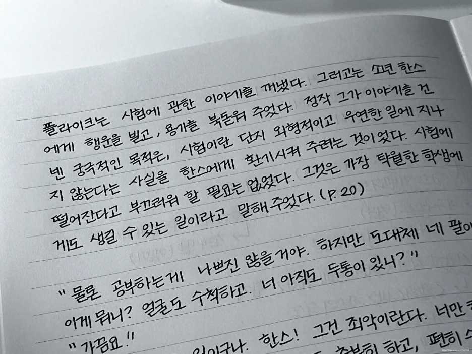 되돌릴 기회는 얼마든지 있었을 것이다. 그의 꿈은 아무것도 아니어도 좋았을 것이고, 성실한 그는 무엇이라도 되었을 테니까, 그냥 어린 시절에는 그가 좋아하는 낚시를 하다 지치면 풀밭에 드러눕고, 부드러운 토끼를 더 만지도록 놔두어도 괜찮았을 것이다. 한스는 그저 너무 어렸고, 여렸으며 어른들의 기대감을 충족시키기 위해 노력했을 뿐이었다. 한스가 고향으로 돌아왔을 때 누구라도 조금 더 따뜻하게 품어줬으면, 조금 쉬고 다시 생각해 보자고 말해줬다면 한스는 강물에 떠밀려가지 않았을 것이다. 플라이크는 한스의 마지막을 함께하며 그의 아버지에게 말했다. “당신이나 나, 우리 모두 저 아이에게 소홀했던 점이 적지 않을 거예요. 그렇게 생각하진 않으세요?”(262면)