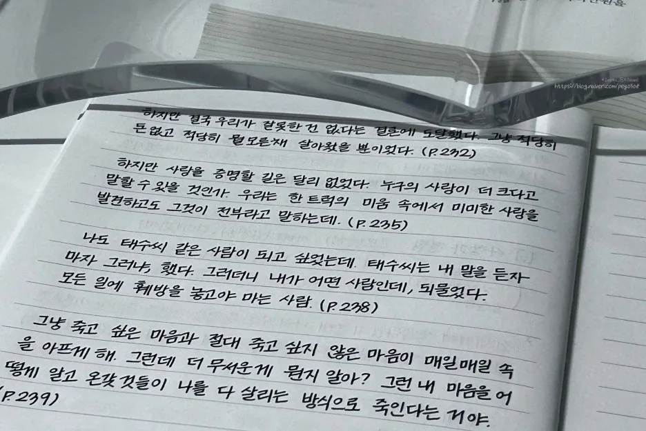 하지만 사랑을 증명할 길은 달리 없었다. 누구의 사랑이 더 크다고 말할 수 있을 것인가. 우리는 한 트럭의 미움 속에서 미미한 사랑을 발견하고도 그것이 전부라고 말하는데. (p. 235)