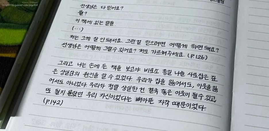그리고 나는 손에 든 책을 보고야 비로소 종일 나를 사로잡은 깊은 상실감의 원인을 알 수 있었다. 우리가 집을 잃어서도, 이웃을 잃어서도 아니었다. 우리가 정말 상실한 건 좋은 이웃이 될 수 있고, 또 될지 몰랐던 우리 자신이었다는 뼈아픈 자각 때문이었다. (p.142)