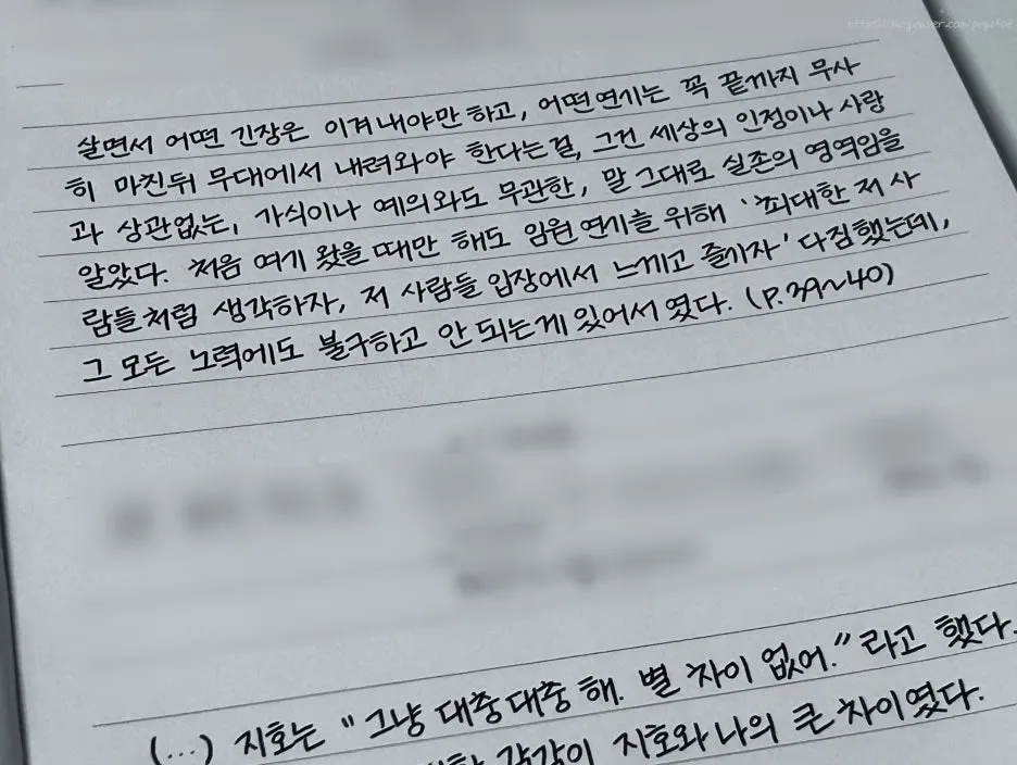 살면서 어떤 긴장은 이겨내야만 하고, 어떤 연기는 꼭 끝까지 무사히 마친 뒤 무대에서 내려와야 한다는 걸, 그건 세상의 인정이나 사랑과 상관없는, 가식이나 예의와도 무관한, 말 그대로 실존의 영역임을 알았다. 처음 여기 왔을 때만 해도 임원 연기를 위해 '최대한 저 사람들처럼 생각하자, 저 사람들 입장에서 느끼고 즐기자' 다짐했는데, 그 모든 노력에도 불구하고 안 되는 게 있어서*였다. (p.40)
