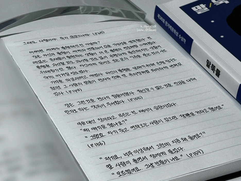 이 책은 처음 보는 작가님인데, 민음사의 <오늘의 젊은 작가> 시리즈라서 한 번 읽어봤다. 시작은 흥미로웠으나 갈수록 엥(?!) 하는 장면이 좀 많았다. 물론 『말뚝들』도 그랬지만, 그건 좀 긍정적인 의아함이었다면 이건 음... (생략). 게다가 많은 부분이 회수되지 않은 채로 끝나는 느낌도 들었다. 누군가는 또 취향에 맞을지도? 그래도 함의된 부분이 나름 좋아서 기록으로 남겨본다.