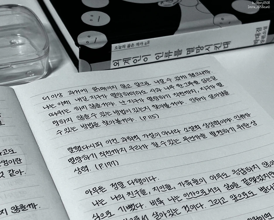 더 이상 과거에 얽매이지 않고 앞으로 나아갈 수 있게 됐으니까. 나는 이제 내일 지구가 멸망하더라도 사과나무 한 그루를 심는 일 따위는 하지 않을 거야. 난 지구가 멸망하기 직전까지, 지구가 멸망하지 않을 수 있는 방법이 있는지 찾아볼 거야. 인류가 살아남을 수 있는 방법을 찾아볼 거야. (p. 115)
