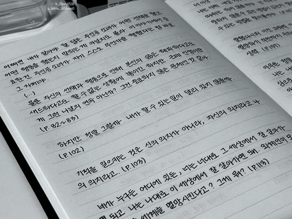 물론 자신의 선택과 행동으로 인해 본인의 삶은 해피하다고도 새드하다고도 할 수 없는 상황에 놓이긴 하지만. 근데 인생이란 게 그런 나날의 연속 아닌가? 그건 중요하지 않은 문제인 것 같아. (p. 83)