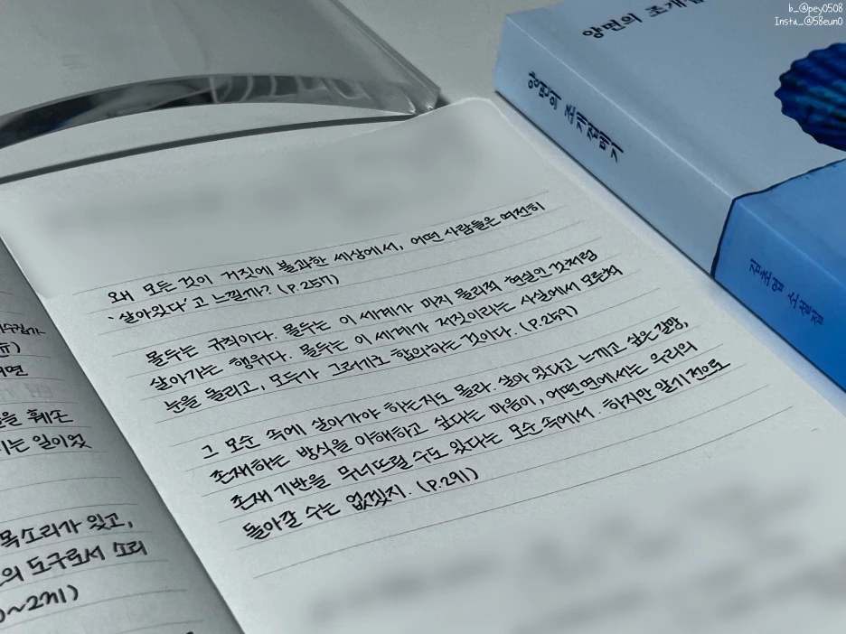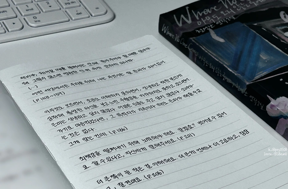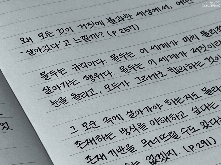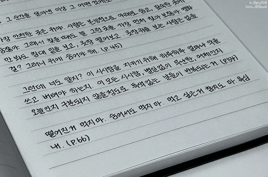 도망치고 싶은 게 당연하다고 생각했거든요. 특별한 불행의 연쇄가 아니어도요. 다들 그랬던 적이 있지 않나요? 눈 감았다가 뜨면 다른 곳이기를 바란 적이요. 지금 여기만 아니면 좋겠다고, 제발 숨을 쉬게만 해달라고요. (p. 355)