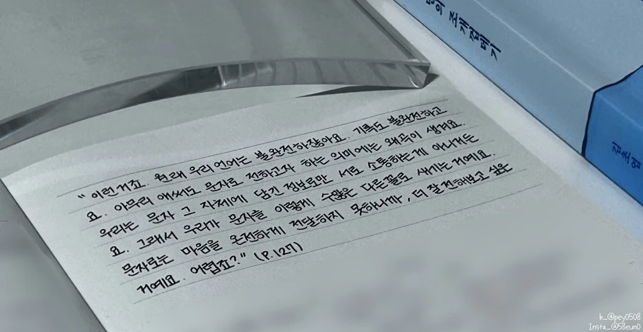 원래 우리 언어는 불완전하잖아요. 기록도 불완전하고요. 아무리 애써도 문자로 전하고자 하는 의미에는 왜곡이 생겨요. 우리는 문자 그 자체에 담긴 정보로만 서로 소통하는 게 아니거든요. 그래서 우리가 문자를 이렇게 수많은 다른 꼴로 새기는 거예요. 문자로는 마음을 온전하게 전달하지 못하니까, 더 잘 전해보고 싶은 거예요. 어렵죠? (p. 127)