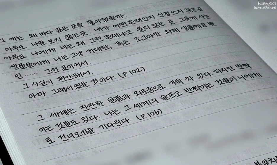 그 세계는 잔잔한 슬픔과 외로움으로 가득 차 있다. 하지만 반짝이는 것들도 있다. 나는 그 세계의 슬프고 반짝이는 것들이 나에게로 건너오기를 기다린다. (p. 106)