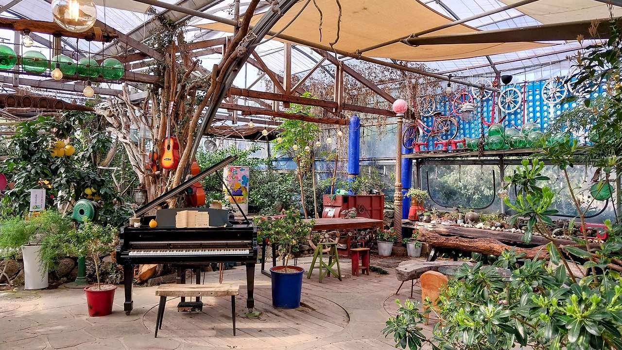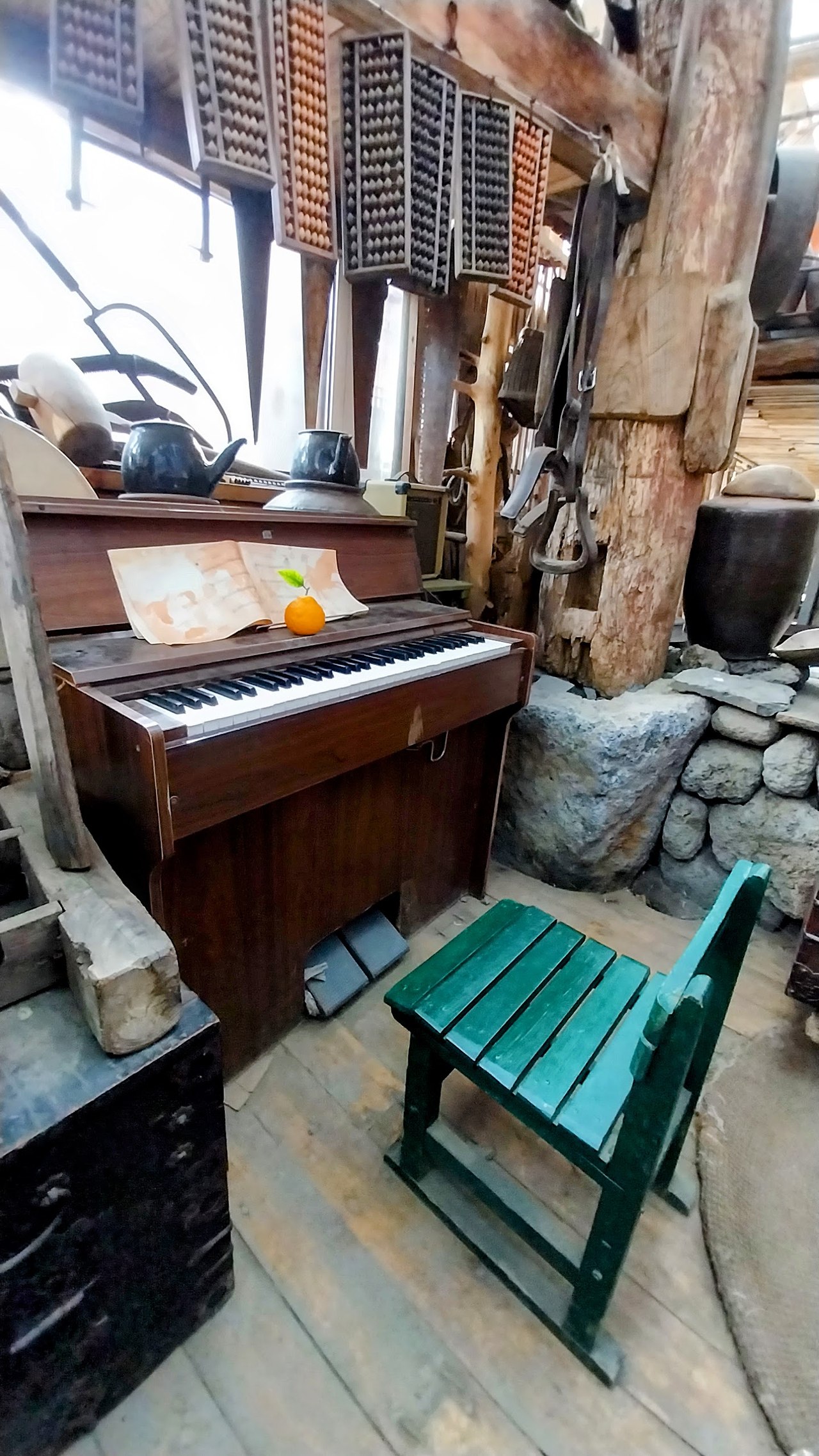 첫 번째 장소는 '쇠소깍 산물 관광농원(https://www.instagram.com/sanmool_jeju)'입니다. 제주도의 대표적인 관광지 쇠소깍 바로 옆에 있는 곳이에요. 한의원 원장님이 운영하는 감귤 농장 + 이색 박물관 + 빈티지 카페로 큰 기대 없이 들어갔다가 그 독특한 분위기와 다양한 수집품에 입이 떡 벌어졌습니다. 농원에는 모루, 농기구, 악기, 제주 전통 고재, 총, 군복 등 정말 다양한 수집품이 가득한데 넓은 공간 구석구석에 잘 배치되어 있어 관람방향을 따라 걸으며 다음에는 무엇이 또 나올까 기대하게 만드는 곳이었습니다. 무엇보다도 이곳이 제 기억에 크게 자리 잡은 이유는 바로 아래 사진 속 오래된 피아노 때문입니다.