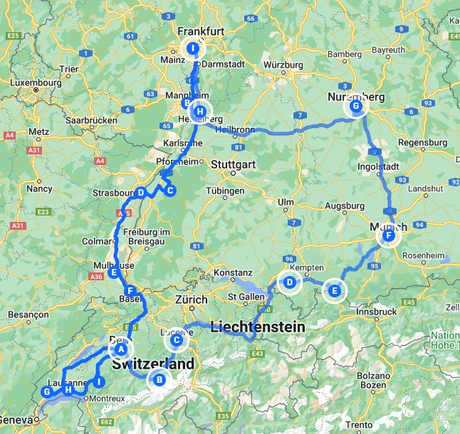독일에서 프랑스를 거쳐 스위스를 지나 다시 독일로 들어가는 커다란 원에 가까운 루트로 이동하였다. 최대한 하루에 300km 이상은 운전하지 않도록 계획했고 3~4일에 한 번은 1박 이상 머물러서 짐을 풀고 싸는 수고를 줄였으며 가족 모두의 취향을 고려하여 와이너리 투어, 브루어리 방문, 수영장&스파 데이, 놀이동산, 초콜릿 박물관 등 골고루 배치하였다. 보다 자세한 루트는 아래 링크에 있다.
