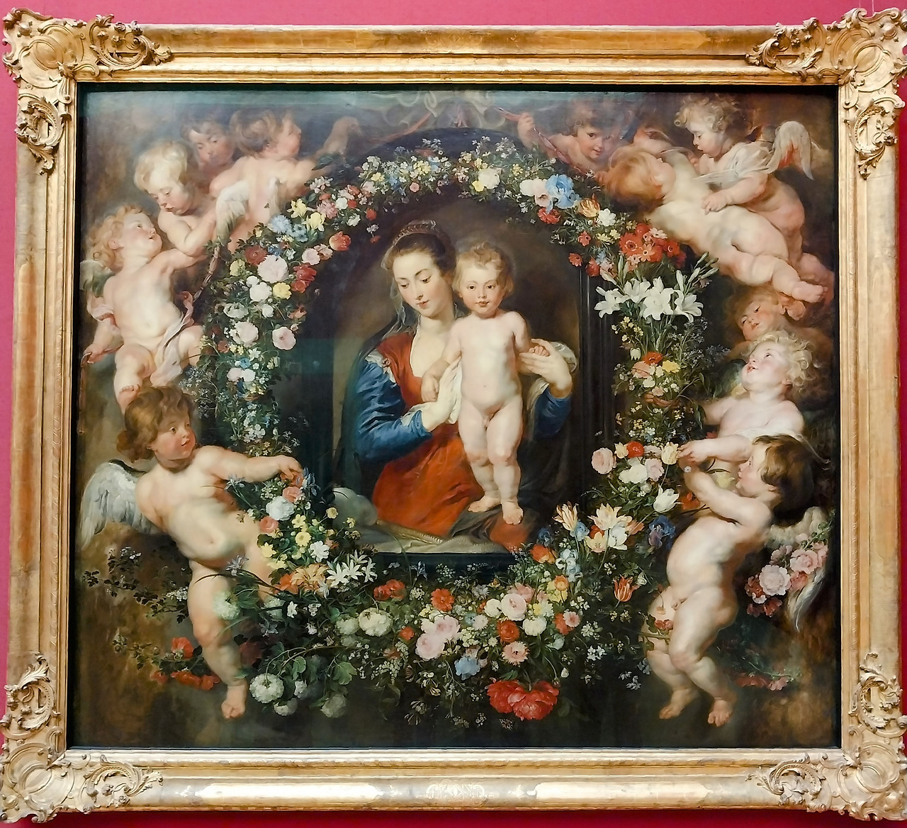 안 쪽의 성모자는 루벤스가 바깥쪽의 천사와 꽃은 브뤼헬이 그린 협업작품. 피터 폴 루벤스와 얀 브뤼헬은 친한 친구사이로 루벤스가 브뤼헬의 아이들의 대부이기도 했다. 액자도 정말 예뻐서 한참을 바라봤던 그림.