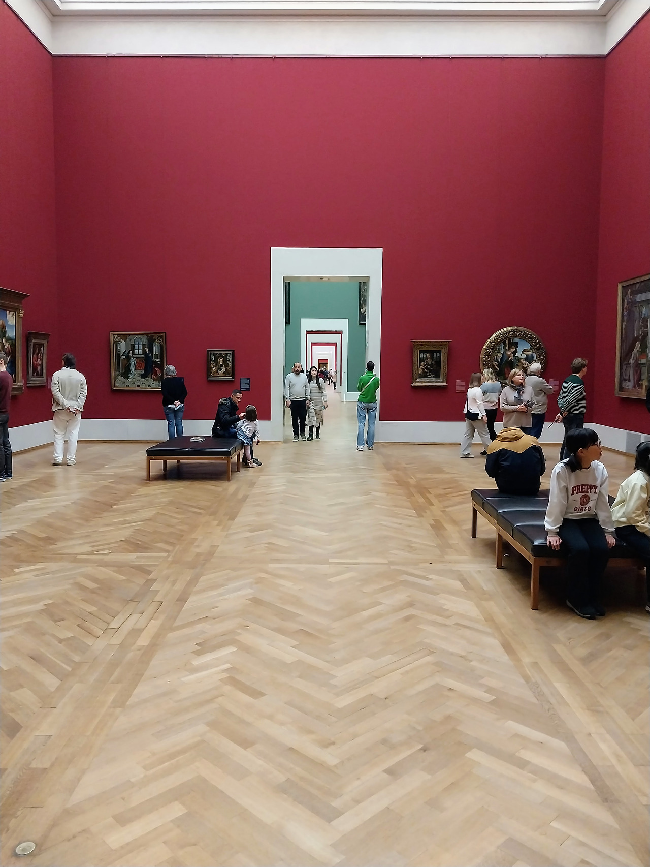 20년 전 처음 알테 피나코텍에 왔을 때 가장 신선했던 것은 갤러리의 벽지가 빨강과 녹색의 강렬한 색으로 대비가 되어 방마다 연속되는 것이었다. 그동안 내가 가봤던 미술관들은 보통 하얀색이나 상아색 같은 그림의 감상에 방해가 되지 않는 바탕이었는데 까마득한 층고에 엄청난 크기의 그림들, 그리고 강렬한 색의 벽지는 스물셋의 나에게 신선한 충격으로 다가왔었다. 아이들과 남편도 연신 감탄을 금치 못하며 그림을 감상하기 시작했다.