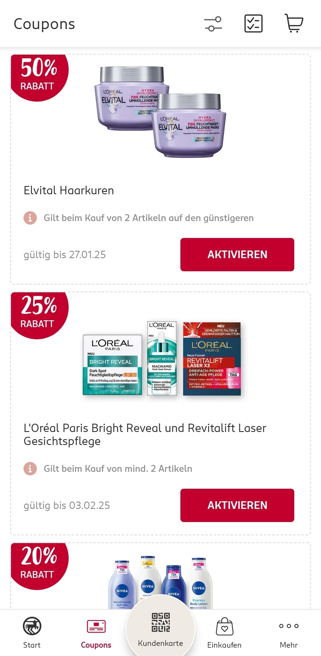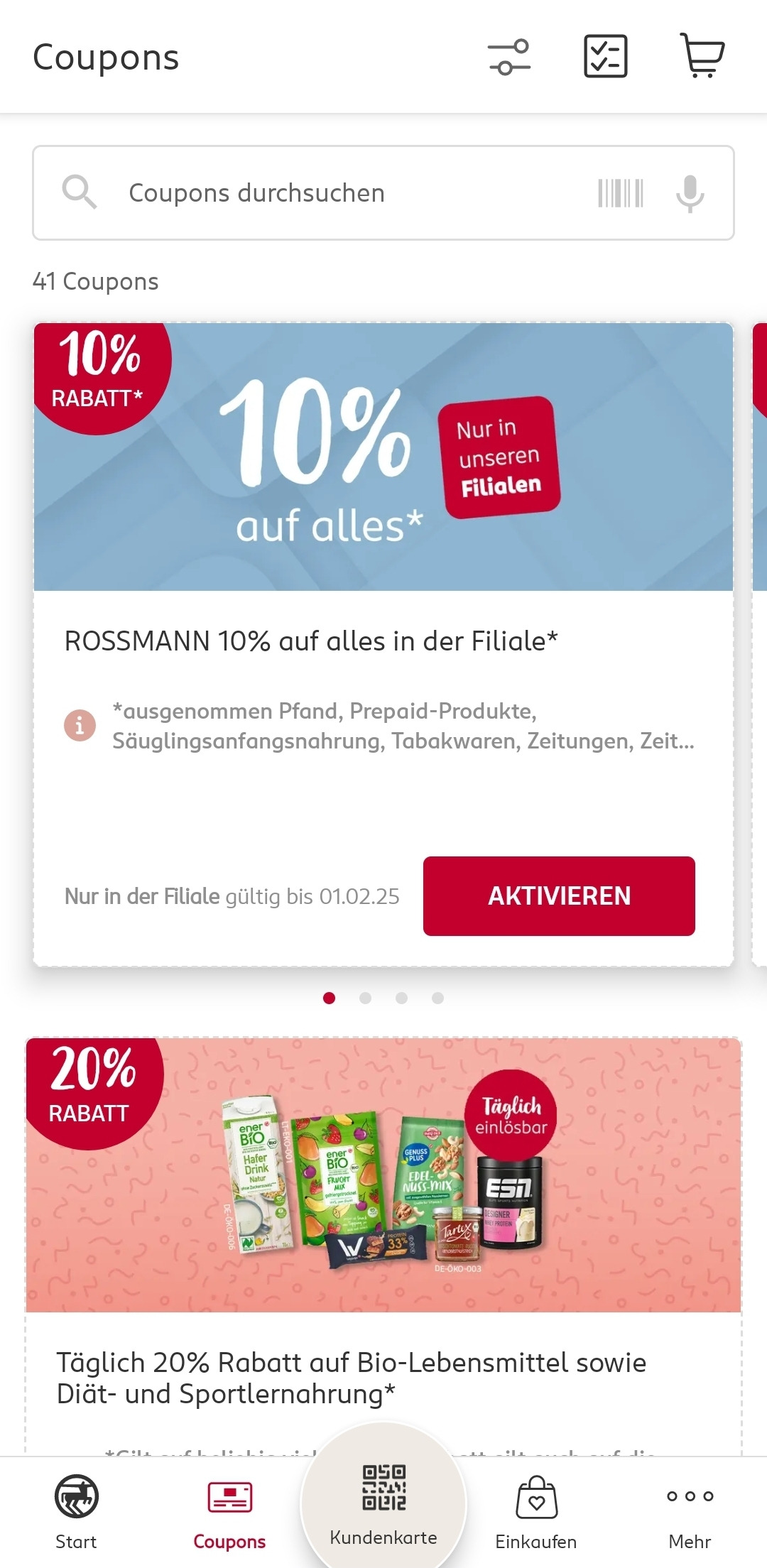 4. 마지막 계산할 때 어플 화면 맨 아래 중앙의 Kundenkarte (고객카드) QR모양을 눌러 QR코드를 보여주면 내가 활성화한 모든 쿠폰이 적용되어 계산된다.